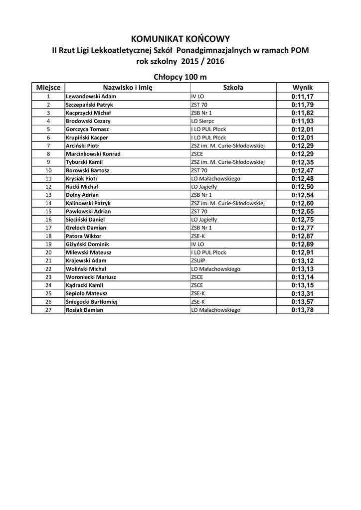 KOMUNIKAT KOŃCOWY II Rzut Ligi Lekkoatletycznej Szkół Ponadgimnazjalnych w ramach POM rok szkolny 2015 / 2016 Chłopcy 100 m Miejsce 1 2 3 4 5 6 7 8 9 10 11 12 13 14 15 16 17 18 19 20 21 22 23 24 25 26 27 Nazwisko i imię Lewandowski Adam Szczepański Patryk Kacprzycki Michał Brodowski Cezary Gorczyca Tomasz Krupiński Kacper Arciński Piotr Marcinkowski Konrad Tyburski Kamil Borowski Bartosz Krysiak Piotr Rucki Michał Dolny Adrian Kalinowski Patryk Pawłowski Adrian Sieciński Daniel Greloch Damian Patora Wiktor Giżyński Dominik Milewski Mateusz Krajewski Adam Woliński Michał Woroniecki Mariusz Kądracki Kamil Sepioło Mateusz Śniegocki Bartłomiej Rosiak Damian Szkoła IV LO ZST 70 ZSB Nr 1 LO Sierpc I LO PUL Płock I LO PUL Płock ZSZ im. M. Curie-Skłodowskiej ZSCE ZSZ im. M. Curie-Skłodowskiej ZST 70 LO Małachowskiego LO Jagiełły ZSB Nr 1 ZSZ im. M. Curie-Skłodowskiej ZST 70 LO Jagiełły ZSB Nr 1 ZSE-K IV LO I LO PUL Płock ZSUiP LO Małachowskiego ZSCE ZSCE ZSE-K ZSE-K LO Małachowskiego Wynik 0:11,17 0:11,79 0:11,82 0:11,93 0:12,01 0:12,01 0:12,29 0:12,29 0:12,35 0:12,47 0:12,48 0:12,50 0:12,54 0:12,60 0:12,65 0:12,75 0:12,77 0:12,87 0:12,89 0:12,91 0:13,12 0:13,13 0:13,14 0:13,15 0:13,31 0:13,57 0:13,78 KOMUNIKAT KOŃCOWY II Rzut Ligi Lekkoatletycznej Szkół Ponadgimnazjalnych w ramach POM rok szkolny 2015 / 2016 Chłopcy 400 m Miejsce 1 2 3 4 5 6 7 8 9 10 11 12 13 14 15 16 17 18 19 20 21 22 23 24 25 26 Nazwisko i imię Różycki Piotr Mikołajewski Gabriel Karulak Piotr Cichosz Bartłomiej Sucharski Szymon Kozanecki Piotr Majcher Adam Żurański Tomasz Krakowiak Wiktor Marcinkowski Michał Wypych Krystian Głodek Michał Tomczyk Norbert Szymański Mateusz Wiśniewski Kamil Ciećwierz Jakub Ciechanowski Karol Dulęba Piotr Brudzyński Jarosław Adamczyk Mateusz Stelak Szymon Mierzwiński Dominik Morawski Mateusz Goliszewski Daniel Dzikowski Mateusz Kurek Szymon Szkoła IV LO LO Jagiełły ZSZ im. M. Curie-Skłodowskiej ZSCE LO Małachowskiego ZSCE ZSB Nr 1 ZSE-K ZSZ im. M. Curie-Skłodowskiej I LO PUL Płock ZSB Nr 1 ZST 70 I LO PUL Płock ZSE-K ZSB Nr 1 IV LO LO Małachowskiego IV LO I LO PUL Płock ZSUiP ZSZ im. M. Curie-Skłodowskiej ZSCE ZST 70 ZST 70 LO Jagiełły LO Jagiełły Wynik 0:51,07 0:51,73 0:56,20 0:56,57 0:57,19 0:57,50 0:58,22 0:58,86 0:59,53 0:59,69 0:59,70 1:00,17 1:00,36 1:00,71 1:01,00 1:01,50 1:01,79 1:01,84 1:02,17 1:03,27 1:03,80 1:05,68 1:07,67 1:08,35 1:09,48 1:10,35 KOMUNIKAT KOŃCOWY II Rzut Ligi Lekkoatletycznej Szkół Ponadgimnazjalnych w ramach POM rok szkolny 2015 / 2016 Chłopcy 1500 m Miejsce 1 2 3 4 5 6 7 8 9 10 11 12 13 14 15 16 Nazwisko i imię Radwański Adam Miecznikowski Julian Więconeg Karol Sierpiński Jakub Podolski Rafał Jabłoński Damian Milewski Dominik Chmielewski Piotr Czachorowski Jakub Kujawa Przemysław Skubik Mateusz Grzelak Daniel Lipiński Maciej Matusiak Konrad Kozłowski Arkadiusz Dubla Przemysław Szkoła ZST 70 LO Jagiełły ZST 70 ZST 70 ZSB Nr 1 ZSB Nr 1 ZSCE ZSZ im. M. Curie-Skłodowskiej ZSZ im. M. Curie-Skłodowskiej I LO PUL Płock LO Jagiełły IV LO ZSCE I LO PUL Płock ZSZ im. M. Curie-Skłodowskiej ZSUiP Wynik 4:33,25 4:35,39 4:38,15 4:46,53 4:51,27 4:53,93 4:59,04 5:06,77 5:09,11 5:09,64 5:16,98 5:20,65 5:21,27 5:23,65 5:46,43 6:07,75 KOMUNIKAT KOŃCOWY II Rzut Ligi Lekkoatletycznej Szkół Ponadgimnazjalnych w ramach POM rok szkolny 2015 / 2016 Chłopcy - skok w dal Miejsce 1 2 3 4 5 6 7 8 9 10 11 12 13 14 15 16 17 18 19 20 21 Nazwisko i imię Rybicki Dominik Pińkowski Patryk Nowakowski Adam Fladziński Jakub Pietruszka Szymon Rzymski Sebastian Tartas Mikołaj Bruchajzer Dominik Piątkowski Kamil Pisarski Przemysław Ignaczewski Przemysław Tyburski Kacper Grzelak Damian Majewski Piotr Kucharski Krzysztof Woja Łukasz Solka Arkadiusz Łopiński Patryk Bruździński Aleksander Woźniak Janusz Gierzyński Piotr Szkoła ZST 70 ZSCE ZSB Nr 1 ZSZ im. M. Curie-Skłodowskiej ZSCE I LO PUL Płock IV LO ZSCE I LO PUL Płock ZSZ im. M. Curie-Skłodowskiej ZSUiP LO Małachowskiego IV LO ZSZ im. M. Curie-Skłodowskiej ZSB Nr 1 ZST 70 ZSB Nr 1 I LO PUL Płock ZSE-K ZST 70 ZSE-K Wynik 5,62 5,60 5,59 5,48 5,48 5,44 5,27 5,25 5,20 5,15 5,11 4,97 4,94 4,87 4,77 4,71 4,70 4,60 4,53 4,28 4,16 KOMUNIKAT KOŃCOWY II Rzut Ligi Lekkoatletycznej Szkół Ponadgimnazjalnych w ramach POM rok szkolny 2015 / 2016 Chłopcy - pchnięcie kulą Miejsce 1 2 3 4 5 6 7 8 9 10 11 12 13 14 15 16 17 18 19 Nazwisko i imię Michalak Sebastian Czapski Adam Michalski Mateusz Rykowski Jakub Jarzyński Jakub Kowalski Kamil Wołosz Dawid Rakowski Bartosz Turkowski Adrian Wiśniewski Piotr Garlej Cezary Żołnowski Kamil Borucki Piotr Pyrzak Przemysław Korzeniewski Sebastian Łada Hubert Kalwasiński Kacper Taras Arkadiusz Sobczak Hubert Szkoła ZSB Nr 1 ZSZ im. M. Curie-Skłodowskiej IV LO ZSB Nr 1 LO Jagiełły ZSCE I LO PUL Płock ZST 70 ZST 70 IV LO I LO PUL Płock ZSCE ZSZ im. M. Curie-Skłodowskiej ZSZ im. M. Curie-Skłodowskiej I LO PUL Płock ZSCE ZSB Nr 1 LO Małachowskiego LO Jagiełły Wynik 13,42 12,01 11,49 11,22 11,21 11,06 11,03 11,02 10,98 10,83 10,73 10,62 10,56 10,46 10,38 10,35 10,28 9,35 8,32 KOMUNIKAT KOŃCOWY II Rzut Ligi Lekkoatletycznej Szkół Ponadgimnazjalnych w ramach POM rok szkolny 2015 / 2016 Chłopcy - sztafeta 4 x 100 m Miejsce 1 2 3 4 5 6 7 8 9 Skład Sztafety Lewandowski, Różycki Giżyński, Grzelak Dolny, Kacprzycki Greloch, Krysiewicz Arciński, Tyburski Kalinowski, Karulak Marcinkowski, Kozanecki Bruchajzer, Kądracki Gorczyca, Krupiński Milewski, Piątkowski Szczepański, Borowski Pawłowski, Woja Skubik, Nowacki Lemiec, Rucki Patora, Szymański Śniegocki, Żurański Balcerzak, Woliński Bartkowski, Kiborski Szkoła Wynik IV LO 0:46,61 ZSB Nr 1 0:48,14 ZSZ im. M. Curie-Skłodowskiej 0:48,27 ZSCE 0:48,62 I LO PUL Płock 0:48,79 ZST 70 0:49,98 LO Jagiełły 0:50,56 ZSE-K 0:51,00 LO Małachowskigo 0:51,85 KOMUNIKAT KOŃCOWY II Rzut Ligi Lekkoatletycznej Szkół Ponadgimnazjalnych w ramach POM ro