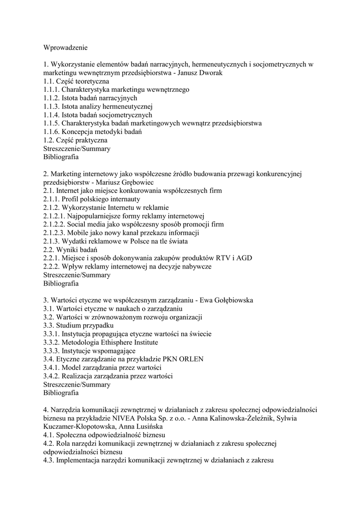 Wprowadzenie 1. Wykorzystanie elementów badań narracyjnych, hermeneutycznych i socjometrycznych w marketingu wewnętrznym przedsiębiorstwa - Janusz Dworak 1.1. Część teoretyczna 1.1.1. Charakterystyka marketingu wewnętrznego 1.1.2. Istota badań narracyjnych 1.1.3. Istota analizy hermeneutycznej 1.1.4. Istota badań socjometrycznych 1.1.5. Charakterystyka badań marketingowych wewnątrz przedsiębiorstwa 1.1.6. Koncepcja metodyki badań 1.2. Część praktyczna Streszczenie/Summary Bibliografia 2. Marketing internetowy jako współczesne źródło budowania przewagi konkurencyjnej przedsiębiorstw - Mariusz Grębowiec 2.1. Internet jako miejsce konkurowania współczesnych firm 2.1.1. Profil polskiego internauty 2.1.2. Wykorzystanie Internetu w reklamie 2.1.2.1. Najpopularniejsze formy reklamy internetowej 2.1.2.2. Social media jako współczesny sposób promocji firm 2.1.2.3. Mobile jako nowy kanał przekazu informacji 2.1.3. Wydatki reklamowe w Polsce na tle świata 2.2. Wyniki badań 2.2.1. Miejsce i sposób dokonywania zakupów produktów RTV i AGD 2.2.2. Wpływ reklamy internetowej na decyzje nabywcze Streszczenie/Summary Bibliografia 3. Wartości etyczne we współczesnym zarządzaniu - Ewa Gołębiowska 3.1. Wartości etyczne w naukach o zarządzaniu 3.2. Wartości w zrównoważonym rozwoju organizacji 3.3. Studium przypadku 3.3.1. Instytucja propagująca etyczne wartości na świecie 3.3.2. Metodologia Ethisphere Institute 3.3.3. Instytucje wspomagające 3.4. Etyczne zarządzanie na przykładzie PKN ORLEN 3.4.1. Model zarządzania przez wartości 3.4.2. Realizacja zarządzania przez wartości Streszczenie/Summary Bibliografia 4. Narzędzia komunikacji zewnętrznej w działaniach z zakresu społecznej odpowiedzialności biznesu na przykładzie NIVEA Polska Sp. z o.o. - Anna Kalinowska-Żeleźnik, Sylwia Kuczamer-Kłopotowska, Anna Lusińska 4.1. Społeczna odpowiedzialność biznesu 4.2. Rola narzędzi komunikacji zewnętrznej w działaniach z zakresu społecznej odpowiedzialności biznesu 4.3. Implementacja narzędzi komunikacji zewnętrznej w działaniach z zakresu społecznej odpowiedzialności biznesu firmy NIVEA Polska Sp. z o.o. 4.3.1. NIVEA Błękitne Żagle 4.3.2. 100 placów zabaw na 100 lat NIVEA 4.3.3. Szkółki Piłkarskie NIVEA Streszczenie/Summary Bibliografia 5. Zarządzanie międzykulturowe w przedsiębiorstwach hotelowych (z uwzględnieniem zachodnich i wschodnich różnic kulturowych) - Małgorzata Kurleto 5.1. Kultura organizacyjna a zarządzanie międzykulturowe 5.2. Typy kultury obrazujące różnice kulturowe a metody zarządzania 5.3. Związek zachodniej i wschodniej kultury organizacyjnej z kulturą narodową danego kraju 5.4. Total Quality Management (w zachodnim modelu zarządzania międzykulturowego) versus guanxi (w chińskim modelu zarządzania międzykulturowego) 5.5. Znaczenie zarządzania międzykulturowego dla klientów przedsiębiorstw turystycznych, w tym szczególnie firm hotelowych Streszczenie/Summary Bibliografia 6. Orientacja na klienta w systemie zarządzania jakością w przedsiębiorstwie - Andrzej Limański, Ireneusz Drabik 6.1. Istota systemu zarządzania jakością we współczesnym przedsiębiorstwie 6.2. Klient - nabywca - konsument: terminologia oraz rodzaje konsumpcji 6.3. Marketingowe aspekty zarządzania jakością 6.4. Satysfakcja i lojalność klienta w systemie zarządzania jakością Streszczenie/Summary Bibliografia 7. Wpływ płci i stylu zarządzania menedżera na ocenę jego kompetencji zawodowych i wybranych cech osobowościowych - Ewa Magier-Łakomy, Monika Pawłowska 7.1. Pytanie badawcze, hipotezy, zmienne 7.2. Materiał badawczy 7.3. Procedura badania 7.4. Próba badawcza 7.5. Wyniki Streszczenie/Summary Bibliografia 8. Wartość usługi vs. cena, czyli pułapki utowarowienia na przykładzie usług hotelarskich. Ocena rynku we Wrocławiu - Zbigniew Malara, Janusz Kroik 8.1. Usługa hotelarska - charakterystyka, koszty, kalkulacja ceny 8.2. Różnicowanie cen - przesłanki i okoliczności zmian 8.3. Determinanty cenowe a utowarowienie usług hotelowych - badania własne 8.3.1. Tło i założenia badań 8.3.2. Eliminacja czynników 8.3.3. Interpretacja wybranych czynników z uwagi na zdolność do ograniczania utowarowienia Streszczenie/Summary Bibliografia 9. Kształtowanie modelu biznesu w przedsiębiorstwie zarządzanym procesowo - Bogdan Nogalski, Roman Czapiewski 9.1. Tworzenie modelu biznesu 9.2. Organizacja jako system kreowania działań - nowoczesne podejście do organizacji 9.3. Koncepcja klienta na rynku dóbr i usług przemysłowych 9.4. Wartości dla przedsiębiorstwa w nowym działaniu strategicznym 9.5. Kształtowanie modelu biznesu w optyce zarządzania procesowego 9.6. Przeprowadzone badanie - wnioski Streszczenie/Summary Bibliografia 10. Koncepcja CSR w aspekcie korzyści społecznych przedsiębiorstw agrobiznesowych z obszarów wiejskich - Marcin Ratajczak, Jan Wołoszyn 10.1. Charakterystyka badanej populacji 10.2. Wyniki badań oraz ich interpretacja Streszczenie/Summary Bibliografia 11. Współpraca z obcokrajowcami - studium przypadku na podstawie firmy Muehlhan Polska - Małgorzata Rozkwitalska 11.1. Przegląd literatury przedmiotu na temat współpracy z obcokrajowcami 11.2. Cel i metodyka badania 11.3. Podstawowe dane o badanym podmiocie 11.4. Uczestnicy badania 11.5. Ocena korzyści i problemów w interakcjach międzykulturowych - wyniki badania 11.5.1. Skojarzenia dotyczące współpracy z obcokrajowcami 11.5.2. Korzyści we współpracy z obcokrajowcami 11.5.3. Problemy we współpracy z obcokrajowcami 11.5.4. Korzyści czy bariery we współpracy z obcokrajowcami? Podsumowanie wyników badania Streszczenie/Summary Bibliografia 12. Holistyczne ujęcie strategii zarządzania wiekiem - myślenie strategiczne a potencjał osób starszych na rynku pracy - Katarzyna Tubielewicz 12.1. Zarządzanie wiekiem - myślenie strategiczne 12.2. Potencjał osób starszych na rynku pracy 12.3. Obszar