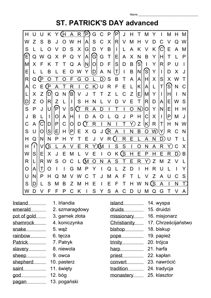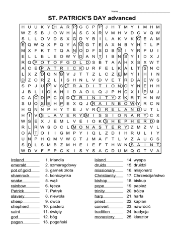Name ______________________________________ ST. PATRICK'S DAY advanced H U U K Y H A R P G C P P J H T M Y I M H M W Z S B J O W H A S C X R V M H V D C V Q W S L L O V D S X G D Y B I L A K V K C E A M E Q W Q X P Q Y A G G T E A X N B Y H T L P M X F K T T Q A N O D F S D B S E L L B L E O W Y D A N T I I Y R P U B N S Y I I D X J R Q P O T O F G O L D S B T A A H X S X W T A C E P A T R I C K U R F E L K A L T S N C L X Z D Q N B V J T T Z L C Z E M Y D Z O R Z L I I O A H H I N S H N L V D V E T R D A E W S S P J U P V S T R A D J B L I I I T I O N O Y N E H H D A O L Q J P H C X C A C D P C O D T R I N I I P M J T Y Z K R T H N W S U O S E H P E X Q J R A I H Q N N P H Y T E J V R I R E L A N D U T L H S S I V S L A V E R Y M I W S E X J E M L V E N B O W Y R C N I O N A R Y C X I O K S H E P H E R D B R L R W S O C L M O N A S T E R Y Z M Z V L O A T O I I G M P Y I Q L Z D I H R U L I Y U N P H Q M V W C T J M A F T L V Z A U C S S D L S M B Z M H E W D V F F P C K Ireland emerald pot of gold shamrock snake rainbow Patrick slavery sheep shepherd saint god pagan I 1. Irlandia 2. szmaragdowy 3. garnek złota 4. koniczynka 5. wąż 6. tęcza 7. Patryk 8. niewola 9. owca 10. pasterz 11. święty 12. bóg 13. pogański I E F T H W N S A I N T S Y S A C D U M Q G T V A island druids missionary Christianity bishop pope trinity harp priest convert tradition monastery 14. wyspa 15. druidzi 16. misjonarz 17. Chrześcijaństwo 18. biskup 19. papież 20. trójca 21. harfa 22. kapłan 23. nawrócić 24. tradycja 25. klasztor