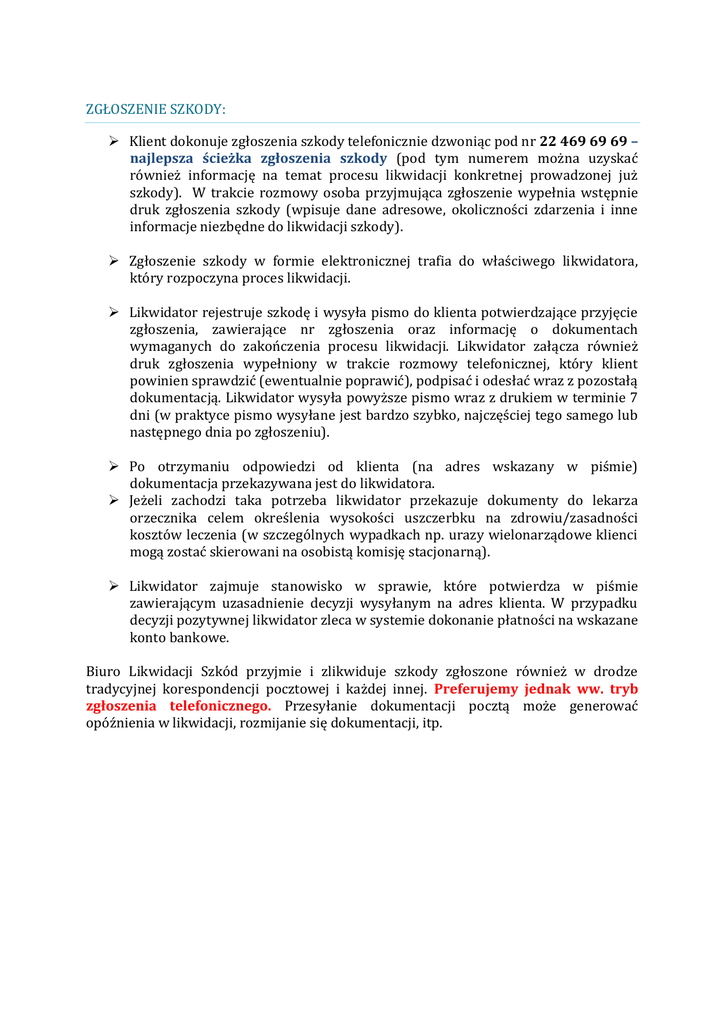 ZGŁOSZENIE SZKODY: Klient dokonuje zgłoszenia szkody telefonicznie dzwoniąc pod nr 22 469 69 69 – najlepsza ścieżka zgłoszenia szkody (pod tym numerem można uzyskać również informację na temat procesu likwidacji konkretnej prowadzonej już szkody). W trakcie rozmowy osoba przyjmująca zgłoszenie wypełnia wstępnie druk zgłoszenia szkody (wpisuje dane adresowe, okoliczności zdarzenia i inne informacje niezbędne do likwidacji szkody). Zgłoszenie szkody w formie elektronicznej trafia do właściwego likwidatora, który rozpoczyna proces likwidacji. Likwidator rejestruje szkodę i wysyła pismo do klienta potwierdzające przyjęcie zgłoszenia, zawierające nr zgłoszenia oraz informację o dokumentach wymaganych do zakończenia procesu likwidacji. Likwidator załącza również druk zgłoszenia wypełniony w trakcie rozmowy telefonicznej, który klient powinien sprawdzić (ewentualnie poprawić), podpisać i odesłać wraz z pozostałą dokumentacją. Likwidator wysyła powyższe pismo wraz z drukiem w terminie 7 dni (w praktyce pismo wysyłane jest bardzo szybko, najczęściej tego samego lub następnego dnia po zgłoszeniu). Po otrzymaniu odpowiedzi od klienta (na adres wskazany w piśmie) dokumentacja przekazywana jest do likwidatora. Jeżeli zachodzi taka potrzeba likwidator przekazuje dokumenty do lekarza orzecznika celem określenia wysokości uszczerbku na zdrowiu/zasadności kosztów leczenia (w szczególnych wypadkach np. urazy wielonarządowe klienci mogą zostać skierowani na osobistą komisję stacjonarną). Likwidator zajmuje stanowisko w sprawie, które potwierdza w piśmie zawierającym uzasadnienie decyzji wysyłanym na adres klienta. W przypadku decyzji pozytywnej likwidator zleca w systemie dokonanie płatności na wskazane konto bankowe. Biuro Likwidacji Szkód przyjmie i zlikwiduje szkody zgłoszone również w drodze tradycyjnej korespondencji pocztowej i każdej innej. Preferujemy jednak ww. tryb zgłoszenia telefonicznego. Przesyłanie dokumentacji pocztą może generować opóźnienia w likwidacji, rozmijanie się dokumentacji, itp.