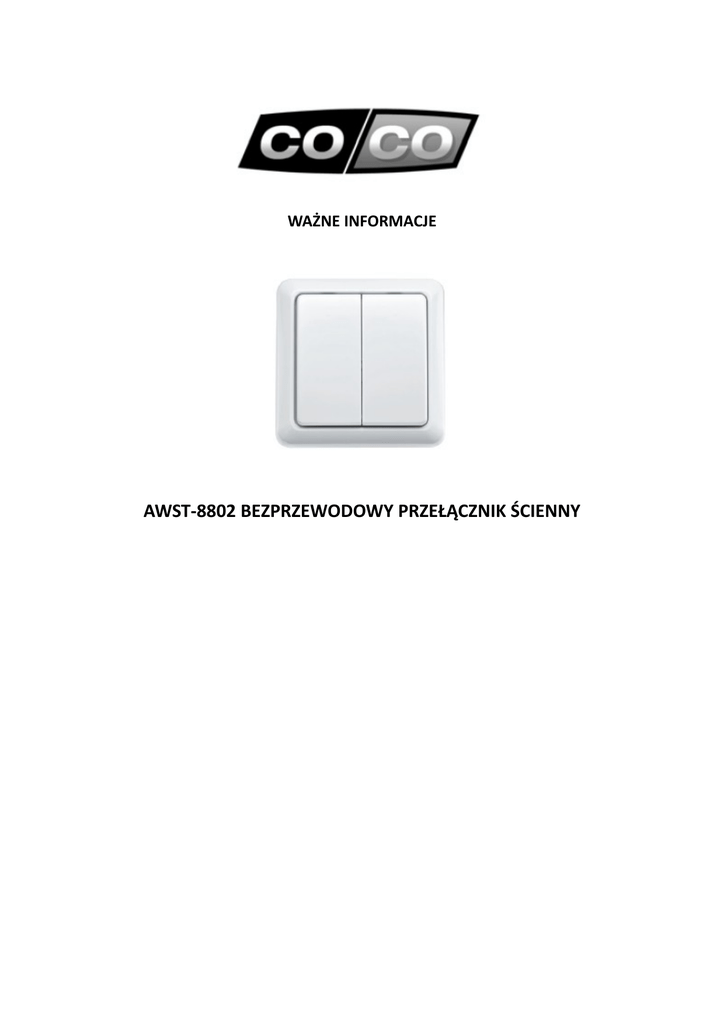 WAŻNE INFORMACJE AWST-8802 BEZPRZEWODOWY PRZEŁĄCZNIK ŚCIENNY KOMPATYBILNOŚĆ Nadajnik ten pracuje ze wszystkimi nadajnikami COCO. FUNKCJONALNOŚĆ Włączanie/wyłączanie, funkcja przyciemniania (tylko, gdy odbiornik jest ściemniaczem) oraz sterowanie w górę/w dół/ stop (obsługiwany tylko przez odbiornik elektrycznych ekranów) DANE TECHNICZNE • • • • Bateria: Radiowa częstotliwość pracy: Zasięg pracy: Ilość kanałów: 1 x 3 V CR2032 (litowa) 433,92 MHz Do 30 m wewnątrz/ 70 m na zewnątrz (optymalne warunki) 2 UWAGI • Każdy odbiornik ściemniacza ma różną szybkość przyciemniania. Jeśli to możliwe korzystaj z oddzielnych jednostek dla każdego odbiornika ściemniacza, aby uniknąć nierównoczesnego ściemniania. BEZPRZEWODOWY SYGNAŁ O CZĘSTOTLIWOŚĆI RADIOWEJ • • • • Sygnał radiowy o częstotliwości 433,92 MHz przechodzi przez ściany, okna i drzwi Zasięg pracy wewnątrz: aż do 30 m . zasięg pracy na zewnątrz: 70 m (optymalne warunki) Zasięg pracy silnie zależy od lokalnych warunków takich jak obecność metali. Na przykład cienka metalowa powłoka w nisko-emisyjnym szkle ma negatywny wpływ na zasięg sygnały radiowego. Mogą istnieć ograniczenia w stosowaniu tego urządzenia poza Unią Europejską. W stosownych przypadkach sprawdzić, czy to urządzenie jest zgodne z lokalnymi dyrektywami. Przeczytaj te proste wskazówki. Nieprzestrzeganie tych wytycznych może być niebezpieczne,a niewłaściwa instalacja spowoduje unieważnienie gwarancji , która może mieć zastosowanie do tego produktu. BATERIA Wyjmij baterię, jeśli produkt nie będzie używany przez dłuższy czasu. Ekstremalne temperatury zmniejszają pojemność oraz żywotność baterii. Należy wymienić baterię, gdy zasięg nadajnika zacznie spadać. Nie rzucać, palić lub łamać baterii. Wyrzucaj baterię zgodnie z lokalnymi przepisami. O ile to możliwe oddaj baterię do recyklingu. Nie wyrzucaj razem z odpadami komunalnymi. NAPRAWA Nie próbować naprawiać tego urządzenia. Nie ma żadnych części wymagających obsługi wewnątrz. 2 WODOODPORNOŚĆ Produkt ten nie jest wodoodporny. Przechowywać go w suchym miejscu. Wilgoć będzie powodować korozję wewnętrznych części elektronicznych i może spowodować zwarcie, uszkodzenie lub porażenie prądem elektrycznym. CZYSZCZENIE Należy używać suchego materiału do czyszczenia tego urządzenia. Nie używać żrących chemikaliów, rozpuszczalników oraz silnych detergentów. OBSŁUGA Nie rzucać, uderzać lub potrząsać urządzeniem. Nieostrożne obchodzenie się z tym urządzeniem może spowodować uszkodzenia wewnętrznych podzespołów elektronicznych i delikatnych mechanizmów. PODTRZYMYWANIE ŻYCIA Nigdy nie używać produktów COCO do systemów podtrzymywania życia oraz innych aplikacji, w których awarie urządzenia może powodować konsekwencje zagrażające życiu. ZAKŁÓCENIA Wszystkie bezprzewodowe urządzenia mogą być podatne na zakłócenia, które mogą wpływać na jakość pracy. Minimalna odległość pomiędzy dwoma odbiornikami powinna wynosić co najmniej 50 m. ŚRODOWISKO Nie należy narażać tego produktu na nadmierne ciepło lub zimno, ponieważ może to spowodować skrócenie życia elektronicznych podzespołów. 3