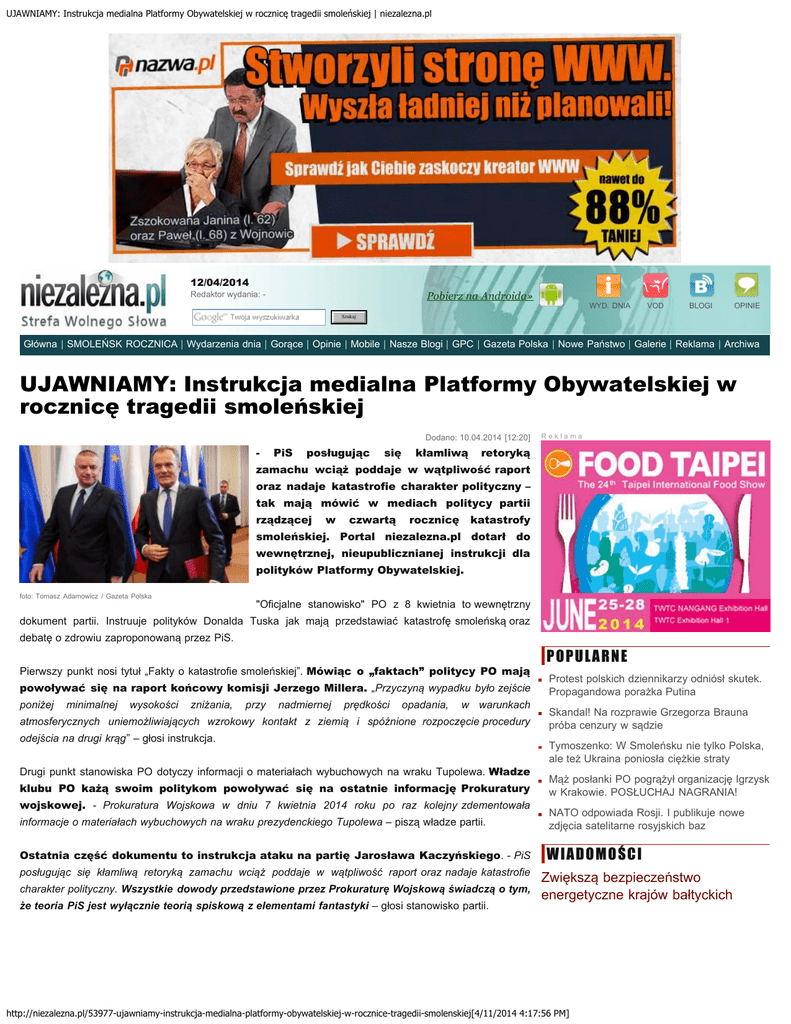 UJAWNIAMY: Instrukcja medialna Platformy Obywatelskiej w rocznicę tragedii smoleńskiej | niezalezna.pl 12/04/2014 Pobierz na Androida» Redaktor wydania: - WYD. DNIA VOD BLOGI OPINIE Szukaj Główna | SMOLEŃSK ROCZNICA | Wydarzenia dnia | Gorące | Opinie | Mobile | Nasze Blogi | GPC | Gazeta Polska | Nowe Państwo | Galerie | Reklama | Archiwa UJAWNIAMY: Instrukcja medialna Platformy Obywatelskiej w rocznicę tragedii smoleńskiej Dodano: 10.04.2014 [12:20] - PiS posługując się kłamliwą Reklama retoryką zamachu wciąż poddaje w wątpliwość raport oraz nadaje katastrofie charakter polityczny – tak mają mówić w mediach politycy partii rządzącej w czwartą rocznicę katastrofy smoleńskiej. Portal niezalezna.pl dotarł do wewnętrznej, nieupublicznianej instrukcji dla polityków Platformy Obywatelskiej. foto: Tomasz Adamowicz / Gazeta Polska "Oficjalne stanowisko" PO z 8 kwietnia to wewnętrzny dokument partii. Instruuje polityków Donalda Tuska jak mają przedstawiać katastrofę smoleńską oraz debatę o zdrowiu zaproponowaną przez PiS. Pierwszy punkt nosi tytuł „Fakty o katastrofie smoleńskiej”. Mówiąc o „faktach” politycy PO mają powoływać się na raport końcowy komisji Jerzego Millera. „Przyczyną wypadku było zejście poniżej minimalnej wysokości zniżania, przy nadmiernej prędkości opadania, w warunkach atmosferycznych uniemożliwiających wzrokowy kontakt z ziemią i spóźnione rozpoczęcie procedury odejścia na drugi krąg” – głosi instrukcja. Drugi punkt stanowiska PO dotyczy informacji o materiałach wybuchowych na wraku Tupolewa. Władze klubu PO każą swoim politykom powoływać się na ostatnie informację Prokuratury wojskowej. - Prokuratura Wojskowa w dniu 7 kwietnia 2014 roku po raz kolejny zdementowała POPULAR NE Protest polskich dziennikarzy odniósł skutek. Propagandowa porażka Putina Skandal! Na rozprawie Grzegorza Brauna próba cenzury w sądzie Tymoszenko: W Smoleńsku nie tylko Polska, ale też Ukraina poniosła ciężkie straty Mąż posłanki PO pogrążył organizację Igrzysk w Krakowie. POSŁUCHAJ NAGRANIA! informacje o materiałach wybuchowych na wraku prezydenckiego Tupolewa – piszą władze partii. NATO odpowiada Rosji. I publikuje nowe zdjęcia satelitarne rosyjskich baz Ostatnia część dokumentu to instrukcja ataku na partię Jarosława Kaczyńskiego. - PiS WIADOM OŚCI posługując się kłamliwą retoryką zamachu wciąż poddaje w wątpliwość raport oraz nadaje katastrofie charakter polityczny. Wszystkie dowody przedstawione przez Prokuraturę Wojskową świadczą o tym, że teoria PiS jest wyłącznie teorią spiskową z elementami fantastyki – głosi stanowisko partii. Zwiększą bezpieczeństwo energetyczne krajów bałtyckich http://niezalezna.pl/53977-ujawniamy-instrukcja-medialna-platformy-obywatelskiej-w-rocznice-tragedii-smolenskiej[4/11/2014 4:17:56 PM] UJAWNIAMY: Instrukcja medialna Platformy Obywatelskiej w rocznicę tragedii smoleńskiej | niezalezna.pl Adrian Zieliński mistrzem Europy! W Kielcach upamiętniono ofiary zbrodni katyńskiej Sprzedaż elektroniczna pomaga ominąć cenzurę oraz jest tańszym sposobem nabywania naszych gazet. Lubię to! Lubię to! 8 Udostępnij Ty i 598 inne osoby to lubicie.Liczba osób, które to lubią: 598. Zarejestruj się, aby zobaczyć co lubią Twoi znajomi. Udostępnij Tweetnij 42 8 wykop 9 Tagi: Tusk , przekaz dnia , PO , Media , IV rocznica katastrofy smoleńskiej , instrukcja Autor: Samuel Pereira , Piotr Kotomski Źródło: niezalezna.pl Trzy lata za jajo na Komorowskim Dodaj swoją opinię DRUKUJ Reklama Births, Marriages, Deaths worldvitalrecords.com/VitalRecords Agnieszka Radwańska awansowała do półfinału turnieju WTA w Katowicach Search 968 Million New Names. 7-day Free Trial. Start Now! South African Genealogy Tłumaczenia Gratis Free Downloadable Videos http://niezalezna.pl/53977-ujawniamy-instrukcja-medialna-platformy-obywatelskiej-w-rocznice-tragedii-smolenskiej[4/11/2014 4:17:56 PM] UJAWNIAMY: Instrukcja medialna Platformy Obywatelskiej w rocznicę tragedii smoleńskiej | niezalezna.pl POLECAMY 11-04-2014 11-04-2014 Mąż posłanki PO pogrążył organizację Igrzysk w Krakowie. POSŁUCHAJ NAGRANIA! Tymoszenko: W Smoleńsku nie tylko Polska, ale też Ukraina poniosła ciężkie straty 11-04-2014 11-04-2014 Anita Czerwińska: skutecznie dopominamy się o godność, prawdę i solidarność Upadek rosyjskiego dziennikarstwa. Propaganda ważniejsza od prawdy NASZEB LOGI.PL W tym tempie nie dogonimy bogatszych 10-04-2014 Prezes Kaczyński dziękuje "Gazecie Polskiej" i T. Sakiewiczowi. Za odwagę 10-04-2014 10-04-2014 Atak przed Pałacem Prezydenckim. Prowokator oblał tablicę smoleńską 10-04-2014 Smoleńsk jak współczesna Golgota. TYLKO U NAS pełna homilia biskupa Dydycza Tysiące ludzi oddaje w Warszawie hołd ofiarom Smoleńska - ZOBACZ ZDJĘCIA moskiewski szpieg na ukrainie i bananowy james bond Czy Putin zabił polskiego Prezydenta? Res publica na weekend - raz jeszcze LONDYN. W SOBOTĘ (jutro) pod ruską ambasadą. 10.IV. Świat się śmieje :) Sebastian Karpiniuk o odpowiedzialności politycznej W czwartą rocznicę Reklama Spot, Misiek i obcinacze palców Reklama OPINIE Legendarny kapelan gdyńskiej Solidarności Wierni sojusznicy generał Anodiny Polskę w nową trumnę zakuć Seremet oblewa egzamin Opinie użytkowników Forum jest miejscem wymiany opinii użytkowników, myśli, informacji, komentarzy, nawiązywania kontaktów i rodzenia się inicjatyw. Dlatego eliminowane będą wszelkie wpisy wielokrotne, zawierające wulgarne słowa i wyrażenia, groźby karalne, obrzucanie się obelgami, obrażanie forumowiczów, członków redakcji i innych osób. Bezwzględnie będziemy zwalczali trollowanie, wszczynanie awantur i prowokowanie. Jeśli czyjaś opinia nie została dopuszczona, to znaczy, że zaliczona została do jednej z wymienionych kategorii. Uwagi i reklamacje kierowane do nas należy kierować na adres : 