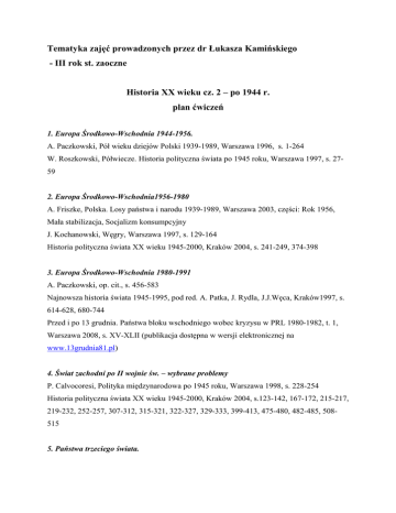 Tematyka zajęć prowadzonych przez dr Łukasza Kamińskiego - III rok st. zaoczne Historia XX wieku cz. 2 – po 1944 r. plan ćwiczeń 1. Europa Środkowo-Wschodnia 1944-1956. A. Paczkowski, Pół wieku dziejów Polski 1939-1989, Warszawa 1996, s. 1-264 W. Roszkowski, Półwiecze. Historia polityczna świata po 1945 roku, Warszawa 1997, s. 2759 2. Europa Środkowo-Wschodnia1956-1980 A. Friszke, Polska. Losy państwa i narodu 1939-1989, Warszawa 2003, części: Rok 1956, Mała stabilizacja, Socjalizm konsumpcyjny J. Kochanowski, Węgry, Warszawa 1997, s. 129-164 Historia polityczna świata XX wieku 1945-2000, Kraków 2004, s. 241-249, 374-398 3. Europa Środkowo-Wschodnia 1980-1991 A. Paczkowski, op. cit., s. 456-583 Najnowsza historia świata 1945-1995, pod red. A. Patka, J. Rydla, J.J.Węca, Kraków1997, s. 614-628, 680-744 Przed i po 13 grudnia. Państwa bloku wschodniego wobec kryzysu w PRL 1980-1982, t. 1, Warszawa 2008, s. XV-XLII (publikacja dostępna w wersji elektronicznej na www.13grudnia81.pl) 4. Świat zachodni po II wojnie św. – wybrane problemy P. Calvocoresi, Polityka międzynarodowa po 1945 roku, Warszawa 1998, s. 228-254 Historia polityczna świata XX wieku 1945-2000, Kraków 2004, s.123-142, 167-172, 215-217, 219-232, 252-257, 307-312, 315-321, 322-327, 329-333, 399-413, 475-480, 482-485, 508515 5. Państwa trzeciego świata. Najnowsza historia świata 1945-1995, pod red. A. Patka, J. Rydla, J.J.Węca, Kraków1997, s. 355-368, 477-480 P. Johnson, Historia świata, rozdział XIV i XV