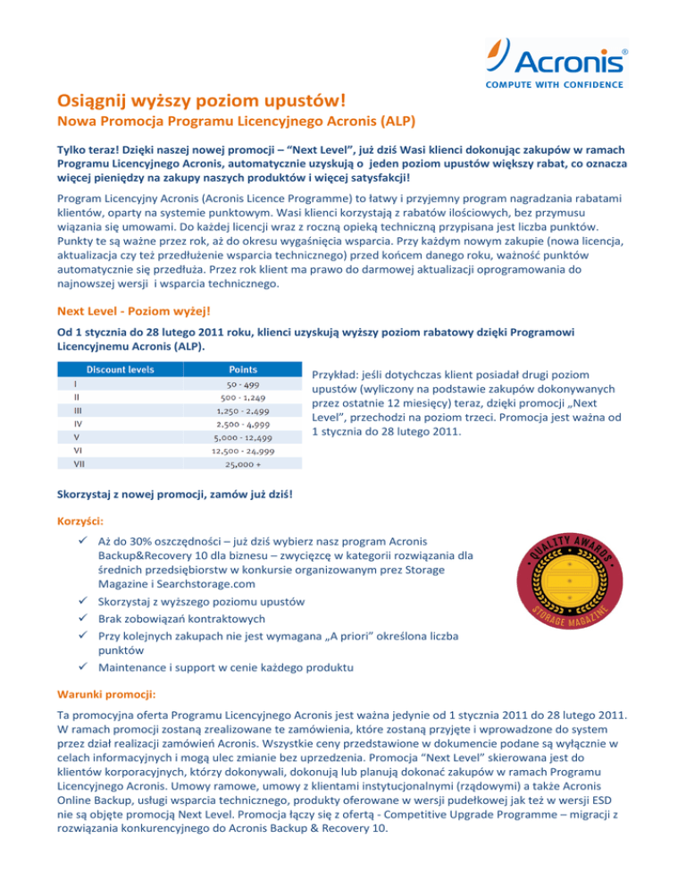 Osiągnij wyższy poziom upustów! Nowa Promocja Programu Licencyjnego Acronis (ALP) Tylko teraz! Dzięki naszej nowej promocji – “Next Level”, już dziś Wasi klienci dokonując zakupów w ramach Programu Licencyjnego Acronis, automatycznie uzyskują o jeden poziom upustów większy rabat, co oznacza więcej pieniędzy na zakupy naszych produktów i więcej satysfakcji! Program Licencyjny Acronis (Acronis Licence Programme) to łatwy i przyjemny program nagradzania rabatami klientów, oparty na systemie punktowym. Wasi klienci korzystają z rabatów ilościowych, bez przymusu wiązania się umowami. Do każdej licencji wraz z roczną opieką techniczną przypisana jest liczba punktów. Punkty te są ważne przez rok, aż do okresu wygaśnięcia wsparcia. Przy każdym nowym zakupie (nowa licencja, aktualizacja czy też przedłużenie wsparcia technicznego) przed końcem danego roku, ważność punktów automatycznie się przedłuża. Przez rok klient ma prawo do darmowej aktualizacji oprogramowania do najnowszej wersji i wsparcia technicznego. Next Level - Poziom wyżej! Od 1 stycznia do 28 lutego 2011 roku, klienci uzyskują wyższy poziom rabatowy dzięki Programowi Licencyjnemu Acronis (ALP). Przykład: jeśli dotychczas klient posiadał drugi poziom upustów (wyliczony na podstawie zakupów dokonywanych przez ostatnie 12 miesięcy) teraz, dzięki promocji „Next Level”, przechodzi na poziom trzeci. Promocja jest ważna od 1 stycznia do 28 lutego 2011. Skorzystaj z nowej promocji, zamów już dziś! Korzyści: Aż do 30% oszczędności – już dziś wybierz nasz program Acronis Backup&Recovery 10 dla biznesu – zwycięzcę w kategorii rozwiązania dla średnich przedsiębiorstw w konkursie organizowanym prez Storage Magazine i Searchstorage.com Skorzystaj z wyższego poziomu upustów Brak zobowiązań kontraktowych Przy kolejnych zakupach nie jest wymagana „A priori” określona liczba punktów Maintenance i support w cenie każdego produktu Warunki promocji: Ta promocyjna oferta Programu Licencyjnego Acronis jest ważna jedynie od 1 stycznia 2011 do 28 lutego 2011. W ramach promocji zostaną zrealizowane te zamówienia, które zostaną przyjęte i wprowadzone do system przez dział realizacji zamówień Acronis. Wszystkie ceny przedstawione w dokumencie podane są wyłącznie w celach informacyjnych i mogą ulec zmianie bez uprzedzenia. Promocja “Next Level” skierowana jest do klientów korporacyjnych, którzy dokonywali, dokonują lub planują dokonać zakupów w ramach Programu Licencyjnego Acronis. Umowy ramowe, umowy z klientami instytucjonalnymi (rządowymi) a także Acronis Online Backup, usługi wsparcia technicznego, produkty oferowane w wersji pudełkowej jak też w wersji ESD nie są objęte promocją Next Level. Promocja łączy się z ofertą - Competitive Upgrade Programme – migracji z rozwiązania konkurencyjnego do Acronis Backup & Recovery 10.