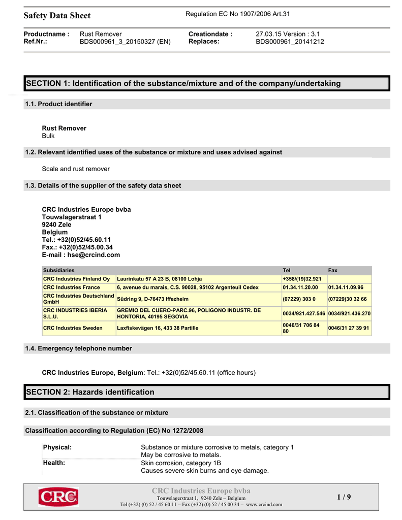 Regulation EC No 1907/2006 Art.31 Safety Data Sheet Productname : Ref.Nr.: Rust Remover BDS000961_3_20150327 (EN) Creationdate : Replaces: 27.03.15 Version : 3.1 BDS000961_20141212 SECTION 1: Identification of the substance/mixture and of the company/undertaking 1.1. Product identifier Rust Remover Bulk 1.2. Relevant identified uses of the substance or mixture and uses advised against Scale and rust remover 1.3. Details of the supplier of the safety data sheet CRC Industries Europe bvba Touwslagerstraat 1 9240 Zele Belgium Tel.: +32(0)52/45.60.11 Fax.: +32(0)52/45.00.34 E-mail : [email protected] Subsidiaries Tel CRC Industries Finland Oy Laurinkatu 57 A 23 B, 08100 Lohja +358/(19)32.921 CRC Industries France 6, avenue du marais, C.S. 90028, 95102 Argenteuil Cedex Fax 01.34.11.20.00 01.34.11.09.96 CRC Industries Deutschland Südring 9, D-76473 Iffezheim GmbH (07229) 303 0 (07229)30 32 66 CRC INDUSTRIES IBERIA S.L.U. GREMIO DEL CUERO-PARC.96, POLIGONO INDUSTR. DE HONTORIA, 40195 SEGOVIA 0034/921.427.546 0034/921.436.270 CRC Industries Sweden Laxfiskevägen 16, 433 38 Partille 0046/31 706 84 80 0046/31 27 39 91 1.4. Emergency telephone number CRC Industries Europe, Belgium: Tel.: +32(0)52/45.60.11 (office hours) SECTION 2: Hazards identification 2.1. Classification of the substance or mixture Classification according to Regulation (EC) No 1272/2008 Physical: Health: Substance or mixture corrosive to metals, category 1 May be corrosive to metals. Skin corrosion, category 1B Causes severe skin burns and eye damage. CRC Industries Europe bvba Touwslagerstraat 1, 9240 Zele – Belgium Tel (+32) (0) 52 / 45 60 11 – Fax (+32) (0) 52 / 45 00 34 – www.crcind.com 1/9 Regulation EC No 1907/2006 Art.31 Safety Data Sheet Productname : Ref.Nr.: Rust Remover BDS000961_3_20150327 (EN) Environment: Creationdate : Replaces: 27.03.15 Version : 3.1 BDS000961_20141212 Not classified Classification according to 67/548/EEC or 1999/45/EC: C : CORROSIVE Health: Physical: Environment: Other hazards : R34: Causes burns. Not classified Not classified Not classified 2.2. Label elements Labelling according to Regulation (EC) No 1272/2008 Product identifier: Contains: phosphoric acid,orthophosphoric acid Hazard pictogram(s): Signal word: Hazard statement(s): Precautionary statement(s): Danger H290 : May be corrosive to metals. H314 : Causes severe skin burns and eye damage. P102 : Keep out of reach of children. P260 : Do not breathe dust/fume/gas/mist/vapours/spray. P280 : Wear protective gloves/protective clothing/eye protection/face protection. P301/330/331 : IF SWALLOWED: rinse mouth. Do NOT induce vomiting. P303/361/353 : IF ON SKIN (or hair): Remove/Take off immediately all contaminated clothing. Rinse skin with water/shower. P310 : Immediately call a POISON CENTER or doctor/physician. P305/351/338 : IF IN EYES: Rinse cautiously with water for several minutes. Remove contact lenses, if present and easy to do. Continue rinsing. P501-2 : Dispose of contents/container to an authorised waste collection point. 2.3. Other hazards None SECTION 3: Composition/information on ingredients 3.1. Substances Not applicable. 3.2. Mixtures Hazardous ingredient CAS-nr. EC-nr w/w % symbol R-phrases* Notes phosphoric acid,orthophosphoric acid 7664-38-2 231-633-2 25-50 34 A CRC Industries Europe bvba Touwslagerstraat 1, 9240 Zele – Belgium Tel (+32) (0) 52 / 45 60 11 – Fax (+32) (0) 52 / 45 00 34 – www.crcind.com C 2/9 Regulation EC No 1907/2006 Art.31 Safety Data Sheet Productname : Ref.Nr.: Rust Remover BDS000961_3_20150327 (EN) Creationdate : Replaces: 1-methoxy-2-propanol; monopropylene glycol methyl ether 107-98-2 alcohols, C9-11, ethoxylated 68439-46-3 27.03.15 Version : 3.1 BDS000961_20141212 203-539-1 1-5 <1 10-67 Xn A 22-41 Explanation notes A : substance with Community workplace exposure limit Hazardous ingredient Registration number CAS-nr. phosphoric acid,orthophosphoric acid 01-2119485924-24 7664-38- 2312 633-2 EC-nr 1-methoxy-2-propanol; monopropylene glycol 20301-2119457435-35 107-98-2 methyl ether 539-1 6843946-3 alcohols, C9-11, ethoxylated w/w % Hazard Class and Category Hazard statement Notes 25-50 Met. Corr. 1, Skin Corr. 1B H290,H314 A 1-5 Flam. Liq. 3, STOT SE H226,H336 3 A <1 Acute Tox. 4, Eye Dam. 1 H302,H318 Explanation notes A : substance with Community workplace exposure limit (* Explanation phrases : see chapter 16) SECTION 4: First aid measures 4.1. Description of first aid measures Contact with eyes : Contact with skin : Inhalation : Ingestion : IF IN EYES: Rinse cautiously with water for several minutes. Remove contact lenses, if present and easy to do. Continue rinsing. IF ON SKIN (or hair): Remove/Take off immediately all contaminated clothing. Rinse skin with water/shower. Wash contaminated clothing before reuse. Immediately call a POISON CENTER or doctor/physician. IF INHALED: Remove person to fresh air and keep comfortable for breathing. IF SWALLOWED: rinse mouth. Do NOT induce vomiting. Immediately call a POISON CENTER or doctor/physician. 4.2. Most important symptoms and effects, both acute and delayed Inhalation : Ingestion : Skin contact : Eye contact : May cause irritation. Symptoms : sore throat, cough May cause gastrointestinal disturbances Symptoms : sore throat, abdominal pain, nausea, vomiting Causes severe burns. Symptoms : redness and pain Causes serious eye damage. Symptoms : redness and pain, impaired vision 4.3. Indication of any immediate medical attention and special treatment needed General Advice : If you feel unwell, seek medical advice (show the label where possible If symptoms persist always call a doctor SECTION 5: Firefighting measures CRC Industries Europe bvba Touwslagerstraat 1, 9240 Zele – Belgium Tel (+32) (0) 52 / 45 60 11 – Fax (+32) (0) 52 / 45 00 34 – www.crcind.com 3/9 Regulation EC No 1907/2006 Art.31 Safety Data Sheet Productname : Ref.Nr.: Rust Remover BDS000961_3_20150327 (EN) Creationdate : Replaces: 27.03.15 Version : 3.1 BDS000961_20141212 5.1