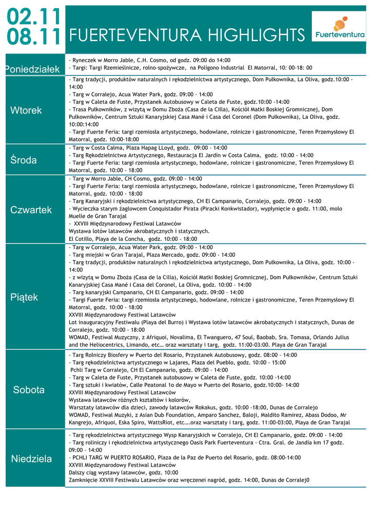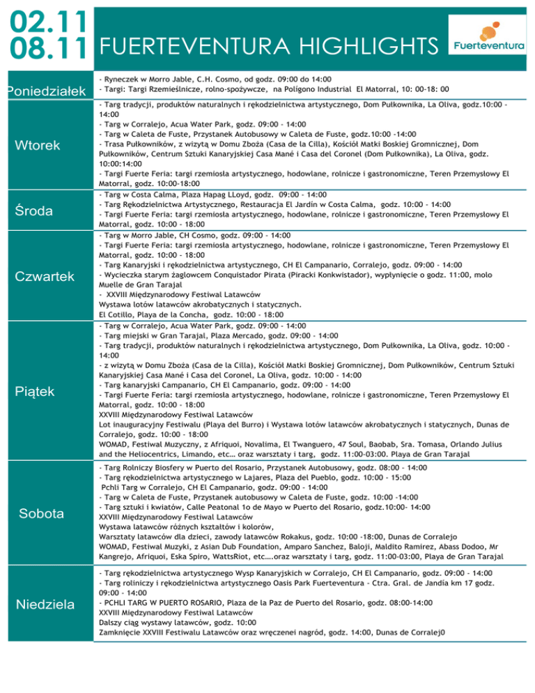 02.11 08.11 FUERTEVENTURA HIGHLIGHTS Poniedziałek - Ryneczek w Morro Jable, C.H. Cosmo, od godz. 09:00 do 14:00 - Targi: Targi Rzemieślnicze, rolno-spożywcze, na Polígono Industrial El Matorral, 10: 00-18: 00 Wtorek - Targ tradycji, produktów naturalnych i rękodzielnictwa artystycznego, Dom Pułkownika, La Oliva, godz.10:00 14:00 - Targ w Corralejo, Acua Water Park, godz. 09:00 - 14:00 - Targ w Caleta de Fuste, Przystanek Autobusowy w Caleta de Fuste, godz.10:00 -14:00 - Trasa Pułkowników, z wizytą w Domu Zboża (Casa de la Cilla), Kościół Matki Boskiej Gromnicznej, Dom Pułkowników, Centrum Sztuki Kanaryjskiej Casa Mané i Casa del Coronel (Dom Pułkownika), La Oliva, godz. 10:00:14:00 - Targi Fuerte Feria: targi rzemiosła artystycznego, hodowlane, rolnicze i gastronomiczne, Teren Przemysłowy El Matorral, godz. 10:00-18:00 Środa - Targ w Costa Calma, Plaza Hapag LLoyd, godz. 09:00 - 14:00 - Targ Rękodzielnictwa Artystycznego, Restauracja El Jardín w Costa Calma, godz. 10:00 - 14:00 - Targi Fuerte Feria: targi rzemiosła artystycznego, hodowlane, rolnicze i gastronomiczne, Teren Przemysłowy El Matorral, godz. 10:00 - 18:00 Czwartek - Targ w Morro Jable, CH Cosmo, godz. 09:00 - 14:00 - Targi Fuerte Feria: targi rzemiosła artystycznego, hodowlane, rolnicze i gastronomiczne, Teren Przemysłowy El Matorral, godz. 10:00 - 18:00 - Targ Kanaryjski i rękodzielnictwa artystycznego, CH El Campanario, Corralejo, godz. 09:00 - 14:00 - Wycieczka starym żaglowcem Conquistador Pirata (Piracki Konkwistador), wypłynięcie o godz. 11:00, molo Muelle de Gran Tarajal - XXVIII Międzynarodowy Festiwal Latawców Wystawa lotów latawców akrobatycznych i statycznych. El Cotillo, Playa de la Concha, godz. 10:00 - 18:00 Piątek - Targ w Corralejo, Acua Water Park, godz. 09:00 - 14:00 - Targ miejski w Gran Tarajal, Plaza Mercado, godz. 09:00 - 14:00 - Targ tradycji, produktów naturalnych i rękodzielnictwa artystycznego, Dom Pułkownika, La Oliva, godz. 10:00 14:00 - z wizytą w Domu Zboża (Casa de la Cilla), Kościół Matki Boskiej Gromnicznej, Dom Pułkowników, Centrum Sztuki Kanaryjskiej Casa Mané i Casa del Coronel, La Oliva, godz. 10:00 - 14:00 - Targ kanaryjski Campanario, CH El Campanario, godz. 09:00 - 14:00 - Targi Fuerte Feria: targi rzemiosła artystycznego, hodowlane, rolnicze i gastronomiczne, Teren Przemysłowy El Matorral, godz. 10:00 - 18:00 XXVIII Międzynarodowy Festiwal Latawców Lot inauguracyjny Festiwalu (Playa del Burro) i Wystawa lotów latawców akrobatycznych i statycznych, Dunas de Corralejo, godz. 10:00 - 18:00 WOMAD, Festiwal Muzyczny, z Afriquoi, Novalima, El Twanguero, 47 Soul, Baobab, Sra. Tomasa, Orlando Julius and the Heliocentrics, Limando, etc… oraz warsztaty i targ, godz. 11:00-03:00. Playa de Gran Tarajal Sobota Niedziela -Targ Rolniczy Biosfery w Puerto del Rosario, Przystanek Autobusowy, godz. 08:00 - 14:00 - Targ rękodzielnictwa artystycznego w Lajares, Plaza del Pueblo, godz. 10:00 - 15:00 Pchli Targ w Corralejo, CH El Campanario, godz. 09:00 - 14:00 - Targ w Caleta de Fuste, Przystanek autobusowy w Caleta de Fuste, godz. 10:00 -14:00 - Targ sztuki i kwiatów, Calle Peatonal 1o de Mayo w Puerto del Rosario, godz.10:00- 14:00 XXVIII Międzynarodowy Festiwal Latawców Wystawa latawców różnych kształtów i kolorów, Warsztaty latawców dla dzieci, zawody latawców Rokakus, godz. 10:00 -18:00, Dunas de Corralejo WOMAD, Festiwal Muzyki, z Asian Dub Foundation, Amparo Sanchez, Baloji, Maldito Ramirez, Abass Dodoo, Mr Kangrejo, Afriquoi, Eska Spiro, WattsRiot, etc….oraz warsztaty i targ, godz. 11:00-03:00, Playa de Gran Tarajal - Targ rękodzielnictwa artystycznego Wysp Kanaryjskich w Corralejo, CH El Campanario, godz. 09:00 - 14:00 - Targ roliniczy i rękodzielnictwa artystycznego Oasis Park Fuerteventura - Ctra. Gral. de Jandía km 17 godz. 09:00 - 14:00 - PCHLI TARG W PUERTO ROSARIO, Plaza de la Paz de Puerto del Rosario, godz. 08:00-14:00 XXVIII Międzynarodowy Festiwal Latawców Dalszy ciąg wystawy latawców, godz. 10:00 Zamknięcie XXVIII Festiwalu Latawców oraz wręczenei nagród, godz. 14:00, Dunas de Corralej0