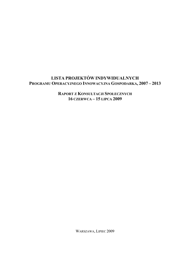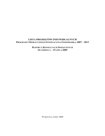 LISTA PROJEKTÓW INDYWIDUALNYCH PROGRAMU OPERACYJNEGO INNOWACYJNA GOSPODARKA, 2007 – 2013 RAPORT Z KONSULTACJI SPOŁECZNYCH 16 CZERWCA – 15 LIPCA 2009 WARSZAWA, LIPIEC 2009 WSTĘP W perspektywie finansowej 2007–2013, Unia Europejska szczególnie uwydatnia rolę partnerów społecznych, gospodarczych oraz samorządowych w procesie tworzenia dokumentów programowych, a następnie ich wdrażania. Zgodnie z zasadami określonymi w art. 11 Rozporządzenia nr 1083/2006 z dnia 11 lipca 2006 r. ustanawiającego przepisy ogólne dotyczące Europejskiego Funduszu Rozwoju Regionalnego, Europejskiego Funduszu Społecznego i Funduszu Spójności i uchylającego rozporządzenie (WE) nr 1260/1999, państwa członkowskie, opracowując dokumenty programujące wsparcie z wykorzystaniem funduszy strukturalnych Unii Europejskiej, są zobligowane do partnerstwa (ścisłej współpracy) z partnerami społeczno–gospodarczymi. Jedną z głównych zasad obowiązujących w kontekście wdrażania programów operacyjnych perspektywy finansowej 2007-2013 jest zasada partnerstwa. PODSTAWA PRAWNA Zgodnie z zasadami przygotowania i funkcjonowania list projektów indywidualnych realizowanych w ramach programów operacyjnych na lata 2007 – 2013 – wynikającymi z Wytycznych Ministra Rozwoju Regionalnego w zakresie jednolitego systemu zarządzania i monitoringu projektów indywidualnych zgodnych z art. 28 ust. 1 pkt. 1 ustawy z dnia 6 grudnia 2006 r. o zasadach prowadzenia polityki rozwoju, lista projektów indywidualnych, w tym dużych, zostaje poddana procesowi szerokich konsultacji społecznych. Konsultacje te prowadzone są za pośrednictwem strony internetowej MRR. Wykaz projektów zostaje umieszczony na okres co najmniej 30 dni celem zebrania uwag i opinii. Równolegle odbywają się spotkania konsultacyjne, obejmujące poszczególne sektory interwencji projektów indywidualnych, prowadzące do stworzenia ostatecznie zweryfikowanego wykazu projektów. CEL KONSULTACJI Celem przeprowadzonych konsultacji społecznych była weryfikacja nowych projektów proponowanych do umieszczenia na liście projektów indywidualnych dla 7. osi priorytetowej Społeczeństwo informacyjne – budowa elektronicznej administracji Programu Operacyjnego Innowacyjna Gospodarka. Na liście projektów indywidualnych powinny zostać umieszczone projekty, których realizacja - zgodnie z zapisami art. 28 ust. 1 ustawy z dnia 6 grudnia 2006 r. o zasadach prowadzenia polityki rozwoju - najbardziej przyczyni się do osiągnięcia celów osi priorytetowych, a tym samym będzie miała kluczowe znaczenie dla realizacji celów wyznaczonych w strategicznych dokumentach krajowych w obszarze polityki rozwoju. Sugestie i uwagi zebrane w trakcie konsultacji posłużą do opracowania ostatecznej propozycji listy projektów indywidualnych dla PO IG. PRZEDMIOT KONSULTACJI: Przedmiotem konsultacji społecznych była lista nowych projektów proponowanych do umieszczenia na liście projektów indywidualnych dla 7. osi priorytetowej PO IG. Proponowana lista projektów zakłada dodanie 9 nowych projektów o wartości 1 556 mln PLN na listę podstawową oraz 11 projektów o wartości 660,07 mln PLN na listę rezerwową. Lista projektów indywidualnych z uwzględnieniem nowych propozycji przedsięwzięć obejmuje 47 projektów o wartości 5 197,78 mln PLN (w tym z EFRR 4 384,78 mln PLN). 2 Jeżeli zaakceptowane zostaną przedstawione propozycje, na liście podstawowej znajdzie się 30 projektów o wartości 4 269,73 mln PLN (w tym z EFRR 3 595,89 mln PLN), natomiast lista rezerwowa obejmować będzie 17 projektów o wartości 926,05 mln PLN (w tym z EFRR 788,86 mln PLN). SPOSÓB ORGANIZACJI KONSULTACJI Konsultacje społeczne listy projektów indywidualnych dla PO IG trwały od 16 czerwca do 15 lipca br. Prowadzone były za pośrednictwem strony internetowej MRR (www.mrr.gov.pl) oraz PO IG (www.poig.gov.pl), na których opublikowana została informacja o proponowanych projektach wraz z adresem poczty elektronicznej ([email protected]), na który zainteresowane osoby lub instytucje przesyłały uwagi za pomocą przygotowanego formularza. Instytucja Zarządzająca PO IG w porozumieniu z Instytucją Pośredniczącą (Ministerstwo Spraw Wewnętrznych i Administracji), przedstawiły swoje stanowisko po zakończeniu ww. okresu konsultacji. Zestawienie uwag zgłaszanych podczas procesu konsultacji wraz ze stanowiskiem IZ/IP PO IG stanowi załącznik nr 1. IZ PO IG zorganizowała także spotkanie konsultacyjne w dniu 15 lipca br. w Warszawie, poświęcone obszarom wsparcia informatyzacji w administracji publicznej, w kontekście propozycji nowych projektów zgłoszonych do realizacji w ramach 7 osi priorytetowej. DZIAŁANIA INFORMACYJNO – PROMOCYJNE WSPIERAJĄCE PROCES KONSULTACJI Informacje na temat organizowania procesu konsultacji (miejsce, czas, agenda konferencji) były podane na stronie internetowej Ministerstwa Rozwoju Regionalnego www.mrr.gov.pl oraz www.poig.gov.pl. Ponadto zostały wysłane imienne zaproszenia do udziału w konferencji do przedstawicieli instytucji związanych z tematyką społeczeństwa informacyjnego. ZAKRES KONSULTACJI Przeprowadzone konsultacje miały charakter otwarty, ze względu na publikację informacji o rozpoczęciu konsultacji oraz zamieszczenie przedmiotu konsultacji (listy nowych projektów) na stronie internetowej MRR oraz IZ PO IG. Głównymi uczestnikami konsultacji byli przedstawiciele administracji państwowej, organizacje i stowarzyszenia związane z tematyką społeczeństwa informacyjnego oraz instytucje i osoby prywatne zainteresowane ww. tematyką. Wśród uczestników konsultacji znaleźli się przedstawiciele: • organizacji i stowarzyszeń związanych z obszarem informatyzacji, • administracji samorządowej, • administracji centralnej i urzędów centralnych, • uczelni i ośrodków naukowych, • przedsiębiorców oraz osób prywatnych. 3 W załączniku nr 1 przedstawiono szczegółową listę osób i ins