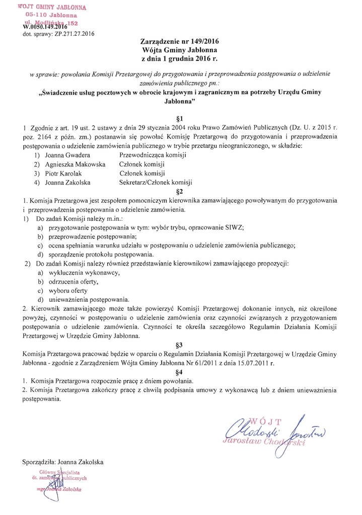 WOJT GMINY JABŁONNA 05-110 Jabłonna 152 6 W.005 . dot. sprawy: ZP.271.27.2016 Zarządzenie nr 149/2016 Wójta Gminy Jabłonna z dnia 1 grudnia 2016 r. w sprawie: powołania Komisji Przetargowej do przygotowania i przeprowadzenia postępowania o udzielenie zamówienia publicznego pn.: "Świadczenie usług pocztowych w obrocie krajowym i zagranicznym na potrzeby Urzędu Gminy Jabłonna" §1 Zgodnie z art. 19 ust. 2 ustawy z dnia 29 stycznia 2004 roku Prawo Zamówień Publicznych (Dz. U. z 2015 r. poz. 2164 z późno zm.) postanawia się powołać Komisję Przetargową do przygotowania i przeprowadzenia postępowania o udzielenie zamówienia publicznego w trybie przetargu nieograniczonego, w składzie: 1) Joanna Gwadera Przewodnicząca komisji 2) Agnieszka Makowska Członek komisji 3) Piotr Karolak Członek komisji 4) Joanna Zakolska Sekretarz/Członek komisji §2 1. Komisja Przetargowa jest zespołem pomocniczym kierownika zamawiającego powoływanym do przygotowania i przeprowadzenia postępowania o udzielenie zamówienia. 1) Do zadań Komisji należy m.in.: a) przygotowanie postępowania w tym: wybór trybu, opracowanie SIWZ; b) przeprowadzenie postępowania; c) ocena spełniania warunku udziału w postępowaniu o udzielenie zamówienia publicznego; d) sporządzenie protokołu postępowania . 2) Do zadań Komisji należy również przedstawianie kierownikowi zamawiającego propozycji: a) wykluczenia wykonawcy, b) odrzucenia oferty, c) wyboru oferty d) unieważnienia postępowania. 2. Kierownik zamawiającego może także powierzyć Komisji Przetargowej dokonanie innych, niż określone powyżej , czynności w postępowaniu o udzielenie zamówienia oraz czynności związanych z przygotowaniem postępowania o udzielenie zamówienia. Czynności te określa szczegółowo Regulamin Działania Komisji Przetargowej w Urzędzie Gminy Jabłonna. §3 Komisja Przetargowa pracować będzie w oparciu o Regulamin Działania Komisji Przetargowej w Urzędzie Gminy Jabłonna - zgodnie z Zarządzeniem Wójta Gminy Jabłonna Nr 61/2011 z dnia 15 .07.2011 r. §4 1. Komisja Przetargowa rozpocznie pracę z dniem powołania. 2. Komisja Przetargowa zakończy pracę z chwilą podpisania umowy z wykonawcą lub z dniem unieważnienia postępowania. ~ ÓJT ~' aroslaw Cha Sporządziła: Joanna Zakolska G~ ł'wn ecjalista ublicznych ds. zam '"iIj o Zakolska