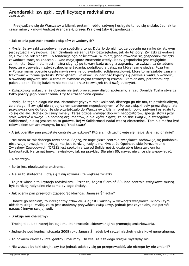 KZ NSZZ Solidarność przy IC we Wrocławiu Arendarski: związki, czyli licytacja radykalizmu 25.01.2009. Przyjeżdżało się do Warszawy z kijami, prętami, robiło zadymę i osiągało to, co się chciało. Jednak te czasy minęły - mówi Andrzej Arendarski, prezes Krajowej Izby Gospodarczej. - Jak ocenia pan zachowanie związków zawodowych? - Myślę, że związki zawodowe nieco spuściły z tonu. Dotarło do nich to, że obecnie na rynku światowym jest sytuacja kryzysowa. I ich działania nie są już tak bezwzględne, jak do tej pory. Związki zawodowe są z roku na rok słabsze. To tendencja ogólnoświatowa. W miarę globalizowania się gospodarki związki zawodowe tracą na znaczeniu. One mają spore znaczenie wtedy, kiedy gospodarka jest względnie zamknięta. Jeżeli natomiast można sięgnąć po towary bądź usługi z zagranicy, to związki są świadome tego, że wysuwając nazbyt rozbuchane żądania, podpiłowują gałąź, na której same siedzą. Poza tym w Polsce mamy obecnie częste nawiązywanie do symboliki solidarnościowej, które to należałoby czasem traktować w formie groteski. Przeciętnemu Polakowi Solidarność kojarzy się pewnie z walką o wolność, o swobody obywatelskie. A teraz te symbole często towarzyszą rzucaniu kamieniami, petardami czy paleniu opon. To się ludziom nie podoba i przez to związek traci swój autorytet. - Związkowcy wskazują, że obecnie nie jest prowadzony dialog społeczny, a rząd Donalda Tuska stwarza tylko pozory jego prowadzenia. Czy to uzasadniona opinia? - Myślę, że tego dialogu nie ma. Natomiast gdybym miał wskazać, dlaczego go nie ma, to powiedziałbym, że dlatego, iż związki nie są dojrzałym partnerem negocjacyjnym. W Polsce związki były przez długie lata przyzwyczajone do tego, że się przyjeżdżało do Warszawy z kijami, prętami, robiło zadymę i osiągało to, co się chciało. Jednak te czasy minęły. Teraz trzeba wynająć dobrych negocjatorów, specjalistów i przy stole walczyć o swoje. Za pomocą argumentów, a nie kijów. Sądzę, że polskie związki, a szczególnie Solidarność, nie są jeszcze na to gotowe. Rej w Solidarności nadal wodzą ekstremiści. Tam nie można być człowiekiem umiarkowanym, bo się "traci twarz". - A jak oceniłby pan pozostałe centrale związkowe? Która z nich zachowuje się najbardziej racjonalnie? - Nie mam aż tak dobrego rozeznania. Sądzę, że największe centrale związkowe zachowują się podobnie, obserwują nawzajem i licytują, kto jest bardziej radykalny. Myślę, że Ogólnopolskie Porozumienie Związków Zawodowych (OPZZ) jest spokojniejsze od Solidarności, gdzie górę biorą zwolennicy konfrontacji. Na temat innych związków, jak na przykład Sierpień 80, nawet nie chcę się wypowiadać. - A dlaczego? - Bo to jest nieuleczalna ekstrema. - Ale za to skuteczna, liczą się z nią również i te większe związki. - To jest właśnie ta licytacja radykalizmu. Przez to, że jest Sierpień 80, inne centrale związkowe muszą być bardziej radykalne niż same by tego chciały. - Jak ocenia pan przewodniczącego Solidarności Janusza Śniadka? - Dobrze go oceniam, to inteligentny człowiek. Ale jest uwikłany w wewnątrzzwiązkowe układy i tym układom ulega. Myślę, że to jest urodzony przywódca związkowy, jednak jest zbyt słaby, nie potrafi narzucić innym swojej woli. - Brakuje mu charyzmy? - Trochę tak, albo raczej brakuje mu stanowczości skierowanej na promocję umiarkowania. - Jednakże pod koniec listopada 2008 roku Janusz Śniadek był raczej niechętny strajkowi generalnemu. - To bowiem człowiek inteligentny i rozumny. On wie, że z takiego strajku wyszłyby nici. - Nie wyszedłby taki strajk, czy też jednak udałoby się go przeprowadzić, ale niczego by nie zmienił? http://solid.home.pl Kreator PDF Utworzono 7 March, 2017, 07:26 KZ NSZZ Solidarność przy IC we Wrocławiu - Może by i wyszedł, ale w postaci szczątkowej i niczego by nie zmienił. Zresztą nie wierzę w podjęcie strajku generalnego z jakichś błahych powodów. - Czyli obecnie polskie związki nie są gotowe do przeprowadzenia strajku generalnego? - Musiałby być powód, który zmobilizowałby ludzi. Bez takiego wyraźnego powodu związki nie są w stanie przeprowadzić strajku generalnego. - Związki wyliczają wiele powodów: arogancję władzy, brak dialogu społecznego, odbieranie praw do wcześniejszych emerytur... - Żaden z tych powodów nie jest w stanie poruszyć ludzi do tego stopnia, by zorganizowano strajk generalny w Polsce. Należy pamiętać, że aktywność związkowa i skłonność do strajku wzrasta wraz z dobrobytem. A przed nami dość trudny rok. Ludzie będą raczej myśleć o tym, by zachować miejsca pracy i będą skłonni godzić się z przejściowymi ograniczeniami. A zatem nie sądzę, żebyśmy obserwowali rosnącą skłonność do podejmowania dużych akcji strajkowych. - Z tego, co pan teraz powiedział, wynika, że związki zawodowe potrafi ą się u nas zachowywać racjonalnie. - Ale ja przecież tego nie neguję. Chwała Bogu, że związki w Polsce potrafi ą też być racjonalne. - Czy jest oczekiwanie w środowisku pracodawców, że rząd premiera Donalda Tuska zmarginalizuje związki? - Znam Michała Boniego i wiem, że to ostatni człowiek, który chciałby osłabienia związków zawodowych. On po prostu chciałby mieć w związkach rzetelnych partnerów, z którymi mógłby rozważać różne racje i znajdować rozwiązania, które mogłyby zaakceptować związki zawodowe oraz rząd. Dlatego sądzę, że ten rząd tłamsić nikogo - w tym również związków zawodowych - nie zamierza. Sam Michał Boni to tytan pracy. Poza tym jest człowiekiem, który dzięki swojej wiedzy budzi szacunek także i u przeciwników. - Co powiedziałby pan przewodniczącemu Solidarności Januszowi Śniadkowi? - Żeby siadać do stołu i rozmawiać o rzeczywistych perspektywach polskiej gospodarki. I jeżeli już wysuwać roszczeni