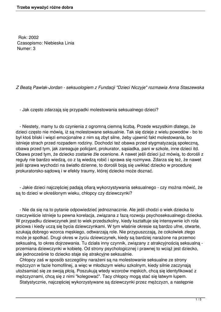 Trzeba wyważyć różne dobra Rok: 2002 Czasopismo: Niebieska Linia Numer: 3 Z Beatą Pawlak-Jordan - seksuologiem z Fundacji "Dzieci Niczyje" rozmawia Anna Staszewska - Jak często zdarzają się przypadki molestowania seksualnego dzieci? - Niestety, mamy tu do czynienia z ogromną ciemną liczbą. Przede wszystkim dlatego, że dzieci często nie mówią, iż są molestowane seksualnie. Tak się dzieje z wielu powodów - bo to był ktoś bliski i więzi emocjonalne z nim są zbyt silne, żeby ujawnić fakt molestowania, bo istnieje strach przed rozpadem rodziny. Dochodzi też obawa przed stygmatyzacją społeczną, obawa przed tym, jak zareaguje policjant, prokurator, sąsiadka, pani w szkole, inne dzieci itd. Obawa przed tym, że dziecko zostanie źle ocenione. A nawet jeśli dzieci już mówią, to dorośli z reguły nie bardzo wiedzą, co z tą wiedzą robić i sprawa się rozmywa. Zdarza się też, że nawet jeśli sprawa wychodzi na światło dzienne, to dorośli boją się uwikłać dziecko w procedurę prokuratorsko-sądową i w efekty traumy, której dziecko może doznać. - Jakie dzieci najczęściej padają ofiarą wykorzystywania seksualnego - czy można mówić, że są to dzieci w określonym wieku, chłopcy czy dziewczynki? - Nie da się na to pytanie odpowiedzieć jednoznacznie. Ale jeśli chodzi o wiek dziecka to rzeczywiście istnieje tu pewna korelacja, związana z fazą rozwoju psychoseksualnego dziecka. W przypadku dziewczynek jest to wiek przedszkolny, kiedy kształtuje się intensywnie ich rola płciowa i kiedy uczą się bycia dziewczynkami. W tym właśnie okresie są bardzo ufne, otwarte, szukają dobrego wzorca męskiego, odtwarzają role. Nie przypuszczają, że cokolwiek złego może je spotkać. Drugi okres w życiu dziewczynek, kiedy są bardziej narażone na przemoc seksualną, to okres dojrzewania. Tu działa inny czynnik, związany z atrakcyjnością seksualną przemiana dziewczynki w kobietę. Od strony psychologicznej i prawnej to wciąż jest dziecko, ale jednocześnie to dziecko staje się atrakcyjne seksualnie. Chłopcy zaś w sposób szczególny narażeni są na molestowanie seksualne ze strony mężczyzn w fazie homofilnej, a więc w młodszym wieku szkolnym, kiedy silnie zaczynają utożsamiać się ze swoją płcią. Poszukują wtedy wzorców męskich, chcą się identyfikować z mężczyznami, chcą się z nimi "kolegować". Tacy chłopcy mogą stać się łatwym łupem. Statystycznie, najczęściej wykorzystywane są dziewczynki przez mężczyzn, a następnie 1/5 Trzeba wyważyć różne dobra chłopcy przez mężczyzn, potem dopiero chłopcy przez kobiety i dziewczynki przez kobiety. - A jeśli chodzi o sprawców - kim są? Na pewno znacznie częściej są to mężczyźni niż kobiety. Chociaż co do kobiet - sprawczyń przemocy seksualnej, to myślę, że mało wiemy o tym zjawisku. Ciemna liczba jest chyba jeszcze większa ze względu na stereotyp matki, kobiety i większe przyzwolenie społeczne na to, co kobieta może wobec dziecka. Poza tym jeśli to jest relacja matka - dziecko, to w tej relacji pozostaje mniej miejsca, w którym dziecko jest bez matki. Więc trudniej jest do niego dotrzeć. Kiedy pracowałam w Zakładzie Seksuologii, przychodzili do mnie dorośli mężczyźni z lękami homoseksualnymi, ale nie będący hemoseksualistami, którzy w dzieciństwie byli uwodzeni przez swoje matki. Dlaczego osoba dorosła dopuszcza się zachowań seksualnych wobec dziecka? Aby odpowiedzieć na to pytanie, trzeba zacząć od elementarnego podziału sprawców. Pierwsza grupa to osoby preferujące dziecko jako partnera seksualnego, czyli, u których występuje pedofilia. Druga grupa to osoby, które podejmują zachowania seksualne wobec dziecka zastępczo. Powody tego mogą być różne, często są to ludzie z zaburzeniami osobowości, głównie o osobowości dyssocjalnej, bądź o osobowości niedojrzałej, dla której dziecko jest adekwatnym psychologicznie partnerem. Są też takie, u których występuje frustracja potrzeby seksualnej, niskie poczucie własnej wartości, zła internalizacja norm dotyczących życia społecznego oraz funkcji i roli dziecka w społeczeństwie. Przy sprzyjających okolicznościach, często po alkoholu, te normy puszczają i następuje realizacja potrzeby seksualnej. Są też osoby, które mają negatywne doświadczenia z kobietami ważnymi w ich życiu, jak matka albo siostra, czy kobietami odrzucającymi ich jako partnerów seksualnych. Dziecko wydaje się tym osobom bezpiecznym partnerem seksualnym, który nie oceni, nie wyszydzi, nie wyśmieje. Czynnikiem ryzyka zarówno po stronie sprawcy, jak i ofiary, jest występowanie upośledzenia umysłowego. Osoba upośledzona umysłowo słabo odracza potrzebę seksualną i trudno jest jej znaleźć partnera. Dlatego często jej ofiarą pada dziecko. - Zwykle jest to osoba znana dziecku i wybierająca zawód, który zapewni jej dostęp do dzieci. - Tak, zdecydowanie częściej jest to ktoś z rodziny lub osoba znana dziecku. Mamy też do czynienia z tendencją do szukania zawodu bądź rodzajów aktywności, które dadzą takim osobom możliwość dostępu do dzieci - a więc harcmistrz, nauczyciel, instruktor tańca, pedagog czy na przykład ksiądz. Na taką prawidłowość wskazują moje doświadczenia z kilkuletniego opiniowania sądowo-seksuologicznego w sprawach sprawców molestowania seksualnego dzieci. - Oprócz izolacji osoba wykorzystująca seksualnie dzieci wymaga też terapii. Ale czy uzdrowienie jest w ogóle możliwe, skoro chodzi o wrodzone skłonności seksualne? 2/5 Trzeba wyważyć różne dobra - Nie ma sposobu, aby komuś zmienić preferencje seksualne. To oczywiste. Terapia służy więc temu, żeby dana osoba nauczyła się kontrolować swoje impulsy seksualne i zaspakajać je w inny, nie krzywdzący nikogo sposób. Często jest to terapia skojarzona, czyli psychoterapia połączona z farmakoterapią, która jest nastawiona na obniżenie pozi