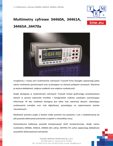 1 | Multimetry cyfrowe 34460A, 34461A, 34465A, 34470a Multimetry cyfrowe 34460A, 34461A, 34465A ,34470a Urządzenia z nowej serii multimetrów cyfrowych Truevolt firmy Keysight zapewniają pełny zakres możliwości pomiarowych oraz są dostępne na różnych pułapach cenowych. Wyróżnia je wyższa dokładność, większa szybkość oraz większa rozdzielczość. Dzięki dostępnej w multimetrach cyfrowych Truevolt funkcji graficznego przedstawiania danych w postaci wykresów trendów i histogramów szybciej uzyskujesz wyczerpujące informacje. W obu modelach dostępny jest także tryb rejestracji danych, ułatwiający analizowanie trendów oraz tryb digitalizacji, pozwalający na rejestrowanie stanów nieustalonych. Możliwość pomiaru prądu o bardzo małej wartości (na poziomie 1 µA z rozdzielczością do pA) pozwala dokonywać pomiarów urządzeń o niewielkiej mocy. Automatyczna kalibracja pozwala kompensować dryft temperaturowy, dzięki czemu multimetry 34460A, 34461A, 34465A (6½ cyfry), 34470A (7½ cyfry) zapewniają dokładność wszystkich dokonywanych pomiarów. Transfer Multisort Elektronik Sp. z o.o. 93-350 Łódź, ul. Ustronna 41, Polska Tel.: 42 645 55 55, fax: 42 645 55 00, e-mail: [email protected] 2 | Multimetry cyfrowe 34460A, 34461A, 34465A ,34470a Pomiary z niekwestionowaną pewnością, jaką daje technologia Truevolt Jedną z korzyści wynikających z zastosowania technologii Truevolt jest możliwość dokonywania pomiaru rzeczywistych sygnałów, a nie błędów urządzenia. Multimetry Keysight serii Truevolt wnoszą mniej niż 30% prądu związanego z przełączaniem elementów pólprzewodnikowych w porównaniu z alternatywnymi urządzeniami tego rodzaju. W przeciwieństwie do tańszych odpowiedników, multimetry Truevolt gwarantują niemal o 100% mniej szumów. Wszystkie parametry techniczne multimetrów Truevolt zostały przetestowane i są zgodne ze standardami ISO/IEC 17025, co gwarantuje skuteczność działań twojego laboratorium i systemu zarządzania jakością na linii produkcyjnej. Wiele tańszych multimetrów cyfrowych tej klasy nie oferuje gwarancji dotyczącej parametrów technicznych w zakresie dokonywania pomiarów. W przeciwieństwie do multimetru 34401A, multimetry cyfrowe Truevolt umożliwiają dokonywanie pomiarów w rozszerzonym zakresie prądu od 100 µA do 10 A. Dodano w nich także funkcję pomiaru temperatury (czujnik RTD/PT100, termistor 5 kΩ). Ponadto zwiększono możliwości dokonywania pomiarów w zakresie testu diod, tak aby można było mierzyć napięcie o wartości 5 V, dzięki czemu można przeprowadzać testy różnego rodzaju diod (np. diod LED). Dokładność szczytowej wartości skutecznej dla pomiaru napięcia AC jest niższa, gdy sygnał ma składowe na wyższej częstotliwości niż typowa fala sinusoidalna. Jeśli chodzi o multimetry tej klasy, wyłącznie firma Keysight wykorzystuje technikę bezpośredniego próbkowania z cyfrowym przetwarzaniem sygnałów do dokonywania pomiaru wartości skutecznej napięcia AC. Dzięki temu unika się spowolnienia typowego dla analogowych przetworników RMS używanych w multimetrach 6½ cyfry innych producentów. Nawet przy współczynniku szczytu na poziomie 10 nie są wprowadzane dodatkowe błędy. Jest to unikalna, opatentowana technika stosowana wyłącznie przez firmę Keysight. Podczas dokonywania pomiarów zawsze mamy do czynienia z prądem polaryzacji, który przyczynia się do wystąpienia dodatkowych błędów pomiarowych. W multimetrach Truevolt kwestia prądu polaryzacji wejść została rozwiązana. Niektóre alternatywne multimetry cyfrowe działają pod tym względem o 20% gorzej. Transfer Multisort Elektronik Sp. z o.o. 93-350 Łódź, ul. Ustronna 41, Polska Tel.: 42 645 55 55, fax: 42 645 55 00, e-mail: [email protected] 3 | Multimetry cyfrowe 34460A, 34461A, 34465A ,34470a Proste rozpoczęcie pracy z nowym urządzeniem Jak większość posiadaczy multimetrów 34401A, masz zaufanie do swojego urządzenia i polegasz na wyświetlanych przez nie wynikach. Wraz z multimetrem Truevolt 34461A firmy Keysight masz dostęp do wszystkich funkcji znanych z modelu 34401A, ale jednocześnie do zupełnie nowych możliwości. Teraz możesz uzyskiwać szybsze pomiary oraz bardziej ufać wyświetlanym wynikom. Jednocześnie obsługa modelu 34401A jest niemalże identyczna jak 34401A, więc nie ma potrzeby opracowywania od nowa aplikacji ani poświęcania czasu na naukę zupełnie nowego, skomplikowanego interfejsu. Multimetr DMM 34461A to jedyna w branży, zgodna ze standardem SCPI alternatywa dla miernika 34401A, która pozwala momentalnie zastąpić jeden miernik drugim. Inne mierniki mogą gwarantować zgodność ze standardem SCPI, jednak mogą obsługiwać wyłącznie niektóre polecenia SCPI. Mierniki Truevolt DMM zostały stworzone przez ten sam zespół specjalistów, który opracował miernik 34401A. Podczas tworzenia mierników Truevolt specjaliści mieli na Transfer Multisort Elektronik Sp. z o.o. 93-350 Łódź, ul. Ustronna 41, Polska Tel.: 42 645 55 55, fax: 42 645 55 00, e-mail: [email protected] 4 | Multimetry cyfrowe 34460A, 34461A, 34465A ,34470a uwadze jakość dokonywania pomiarów, niezawodność oraz sposób obsługi znane z urządzeń 34401A. Model 34461A zawiera wszystkie znane Ci funkcje i gwarantuje dokładność zapewnianą od lat przez multimetry oferowane przez firmę Keysight. Różnica polega na tym, że jest on jeszcze lepszy niż poprzednie modele. Uproszczone rejestrowanie danych za pomocą programu BenchVue Skorzystaj z nowej możliwości wizualizacji danych z wielu mierników cyfrowych jednocześnie. - Wyświetlaj pojedyncze pomiary, wykresy, tabele lub histogramy z jednego lub wielu urządzeń jednocześnie, aby uzyskać widok trendów, które w innym wypadku mogłyby zostać przeoczone. – Rejestruj i eksportuj dane do popularnych narzędzi, takich jak programy Microsoft Excel, Microsoft Word czy MATLAB, na potrzeby tworzenia dokumentacj
