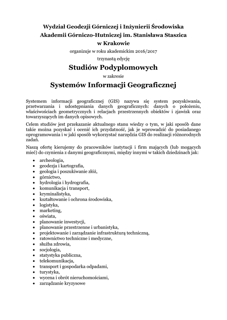 Wydział Geodezji Górniczej i Inżynierii Środowiska Akademii Górniczo-Hutniczej im. Stanisława Staszica w Krakowie organizuje w roku akademickim 2016/2017 trzynastą edycję Studiów Podyplomowych w zakresie Systemów Informacji Geograficznej Systemem informacji geograficznej (GIS) nazywa się system pozyskiwania, przetwarzania i udostępniania danych geograficznych: danych o położeniu, właściwościach geometrycznych i relacjach przestrzennych obiektów i zjawisk oraz towarzyszących im danych opisowych. Celem studiów jest przekazanie aktualnego stanu wiedzy o tym, w jaki sposób dane takie można pozyskać i ocenić ich przydatność, jak je wprowadzić do posiadanego oprogramowania i w jaki sposób wykorzystać narzędzia GIS do realizacji różnorodnych zadań. Naszą ofertę kierujemy do pracowników instytucji i firm mających (lub mogących mieć) do czynienia z danymi geograficznymi, między innymi w takich dziedzinach jak: archeologia, geodezja i kartografia, geologia i poszukiwanie złóż, górnictwo, hydrologia i hydrografia, komunikacja i transport, kryminalistyka, kształtowanie i ochrona środowiska, logistyka, marketing, oświata, planowanie inwestycji, planowanie przestrzenne i urbanistyka, projektowanie i zarządzanie infrastrukturą techniczną, ratownictwo techniczne i medyczne, służba zdrowia, socjologia, statystyka publiczna, telekomunikacja, transport i gospodarka odpadami, turystyka, wycena i obrót nieruchomościami, zarządzanie kryzysowe oraz do wszystkich zainteresowanych wykorzystaniem w swojej codziennej działalności możliwości tkwiących w systemach informacji geograficznej. Zajęcia prowadzone będą przez pracowników Wydziału oraz zaproszonych gości, specjalistów w zakresie GIS, fotogrametrii i teledetekcji, geodezji i kartografii oraz inżynierii środowiska. Program Studiów obejmuje 223 godziny zajęć przeznaczonych na omówienie następujących zagadnień: 1. Modelowanie informacji geograficznej. 2. Podstawy formalno – prawne. 3. Struktury i źródła danych geograficznych. 4. Jakość danych, metadane. 5. Oprogramowanie (m.in. AutoCAD, MicroStation, ArcGIS, GeoMedia, QGIS). 6. Metody prezentacji kartograficznej i wizualizacji danych. 7. Infrastruktury informacji przestrzennej. 8. Budowanie baz geometrycznych i opisowych. 9. Wymiana i transfer danych. 10. Proste i złożone analizy geograficzne. 11. Numeryczny Model Terenu i analizy 3D. Ćwiczenia praktyczne (przy komputerach) stanowią około dwóch trzecich godzin zajęć i prowadzone będą w oparciu o oprogramowanie wiodących producentów komercyjnych narzędzi GIS (Autodesk, Bentley, Esri, Intergraph), a także wybrane narzędzia z dynamicznie rozwijającej się grupy wolnego oprogramowania. Ze szczegółowym programem Studiów można się zapoznać na stronie internetowej http://www.studium.gis.edu.pl/. Przewidywany termin rozpoczęcia zajęć – październik 2016 r., zakończenia – lipiec 2017 r. Planowanych jest 15 zjazdów (średnio dwa w miesiącu), w trakcie których zajęcia odbywać się będą w soboty i niedziele. Warunkiem ukończenia jest regularne uczestniczenie w zajęciach oraz wykonanie pracy końcowej i jej „obrona”. Koszt Studiów wynosi 3600 zł. Od kandydatów wymagamy posiadania dyplomu ukończenia studiów wyższych (magisterskich, inżynierskich lub licencjackich) oraz znajomości podstaw obsługi komputera (system operacyjny MS Windows, oprogramowanie biurowe). Osoby zainteresowane prosimy o wypełnienie i złożenie formularza zgłoszeniowego wraz z kserokopią lub skanem dyplomu w terminie od 1 czerwca do 22 lipca 2016 r. oraz od 1 do 25 września 2016 r. Studia zostaną uruchomione pod warunkiem zgłoszenia się przynajmniej 20 kandydatów. Ze względu na konieczność zapewnienia wysokiego poziomu Studiów liczba słuchaczy jest ograniczona do 50 osób. O przyjęciu na Studia zadecyduje kolejność wpływu podań. Dodatkowych informacji udzielają i zgłoszenia przyjmują: dr hab. inż. Piotr Cichociński (e-mail: [email protected]) oraz mgr inż. Urszula Czabańska i mgr inż. Adrianna Flammer (al. Mickiewicza 30, 30-059 Kraków, paw. C-4, pok. 406, tel. (12) 617-22-77, fax (12) 617-45-88). Będziemy wdzięczni, jeśli informacje powyższe przekażecie Państwo osobom, które może zainteresować tematyka Studiów. Kierownik Studiów dr hab. inż. Piotr Cichociński