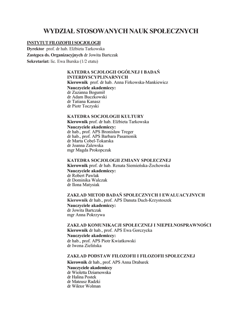 WYDZIAŁ STOSOWANYCH NAUK SPOŁECZNYCH INSTYTUT FILOZOFII I SOCJOLOGII Dyrektor prof. dr hab. Elżbieta Tarkowska Zastępca ds. Organizacyjnych dr Jowita Bartczak Sekretariat: lic. Ewa Burska (1/2 etatu) KATEDRA SCJOLOGII OGÓLNEJ I BADAŃ INTERDYSCYPLINARNYCH Kierownik prof. dr hab. Anna Firkowska-Mankiewicz Nauczyciele akademiccy: dr Zuzanna Bogumił dr Adam Buczkowski dr Tatiana Kanasz dr Piotr Toczyski KATEDRA SOCJOLOGII KULTURY Kierownik prof. dr hab. Elżbieta Tarkowska Nauczyciele akademiccy: dr hab., prof. APS Bronisław Treger dr hab., prof. APS Barbara Pasamonik dr Marta Cobel-Tokarska dr Joanna Zalewska mgr Magda Prokopczuk KATEDRA SOCJOLOGII ZMIANY SPOŁECZNEJ Kierownik prof. dr hab. Renata Siemieńska-Żochowska Nauczyciele akademiccy: dr Robert Pawlak dr Dominika Walczak dr Ilona Matysiak ZAKŁAD METOD BADAŃ SPOŁECZNYCH I EWALUACYJNYCH Kierownik dr hab., prof. APS Danuta Duch-Krzystoszek Nauczyciele akademiccy: dr Jowita Bartczak mgr Anna Pokrzywa ZAKŁAD KOMUNIKACJI SPOŁECZNEJ I NIEPEŁNOSPRAWNOŚCI Kierownik dr hab., prof. APS Ewa Gorczycka Nauczyciele akademiccy: dr hab., prof. APS Piotr Kwiatkowski dr Iwona Zielińska ZAKŁAD PODSTAW FILOZOFII I FILOZOFII SPOŁECZNEJ Kierownik dr hab., prof. APS Anna Drabarek Nauczyciele akademiccy dr Wioletta Dziarnowska dr Halina Postek dr Mateusz Radzki dr Wiktor Wolman ZAKŁAD FILOZOFII MORALNOŚCI I ETYKI GLOBALNEJ Kierownik dr hab., prof. APS Helena Ciążela Nauczyciele akademiccy prof. dr hab. Włodzimierz Tyburski dr Paweł Bernat dr Piotr Rosół dr Iwona Stachowska mgr Mateusz Kucz INSTYTUT PSYCHOLOGII STOSOWANEJ Dyrektor dr hab., prof. APS Barbara Weigl Zastępca ds. Organizacyjnych dr hab. Jelonkiewicz-Sterianos Irena Sekretariat Małgorzata Gawron KATEDRA PSYCHOTERAPII I PORADNICTWA PSYCHOLOGICZNEGO Kierownik prof. dr hab. Jan Czabała Nauczyciele akademiccy dr hab., prof. APS Irena Jelonkiewicz-Sterianos dr hab., prof. APS Katarzyna Prot-Klinger dr Sylwia Kluczyńska mgr Katarzyna Sass-Stańczak AKADEMICKA PORADNIA PSYCHOLOGICZNA Kierownik dr Lidia Zabłocka-Żytka KATEDRA PSYCHOLOGII SPOŁECZNEJ Kierownik prof. dr hab. Janusz Grzelak Nauczyciele akademiccy dr Dorota Jasielska dr Karolina Konopka dr Monika Prusik dr Joanna Rajchert dr Paweł Smółka dr Michał Szulawski dr Anna Zajenkowska KATEDRA BIOLOGICZNYCH PODSTAW ZACHOWANIA Kierownik prof. dr hab. Jolanta Zagrodzka-Szmagalska Nauczyciele akademiccy prof. dr hab. Tadeusz Mazurczak dr Paweł Boguszewski dr Ewa Łuczak dr Karolina Nowak-Stańczyk dr Danuta Palus KATEDRA PODSTAW PSYCHOLOGII Kierownik prof. dr hab. Adam Frączek Nauczyciele akademiccy dr Magdalena Rowicka dr Dawid Ścigała dr Joanna Ulatowska dr Ewa Witkowska dr Łukasz Wojciechowski mgr Marta Rutkowska PRACOWNIA TESTÓW PSYCHOLOGICZNYCH Kierownik dr Halina Dubczak Pracownicy mgr Marta Łukaszewska ZAKŁAD PSYCHOLOGII OSOBOWOŚCI Kierownik dr hab., prof. APS Helena Grzegołowska-Klarkowska Nauczyciele akademiccy dr Anna Batory dr Kamila Dobrenko dr Anna Walasek-Bojanowska dr Małgorzata Stawska dr Anna Sukiennik ZAKŁAD PSYCHOLOGII ROZWOJU I WYCHOWANIA Kierownik (p.o.) dr Ewa Sokołowska Nauczyciele akademiccy dr hab., prof. APS Barbara Weigl dr Agnieszka Bieńkowska dr Monika Dominiak-Kochanek dr Maria Jankowska dr Dorota Kuncewicz dr Justyna Melonowska dr Magdalena Poraj-Weder dr Sławomir Postek dr Justyna Skolimowska ZAKŁAD PSYCHOLOGII KLINICZNEJ DZIECI I MŁODZIEŻY Kierownik (p.o.) dr Danielewicz Dorota Nauczyciele akademiccy dr hab., prof. APS Jarosław Rola dr hab., prof. APS Ewa Zasępa dr Anna Hryniewicka dr Ewa Odachowska dr Dominika Wiśniewska dr Małgorzata Woźniak-Prus dr Dorota Zawadzka mgr Joanna Wojda-Kornacka ZAKŁAD PSYCHOLOGII KLINICZNEJ CZŁOWIEKA DOROSŁEGO Kierownik dr hab., prof. APS Paweł Bronowski Nauczyciele akademiccy dr hab., prof. APS Maryla Sawicka dr Ewa Fersten dr Beata Hintze INSTYTUT PROFILAKTYKI SPOŁECZNEJ I PRACY SOCJALNEJ Dyrektor dr hab., prof. APS Paweł Boryszewski Zastępca ds. Organizacyjnych dr Anna Kruk Sekretariat lic. Ewa Burska (1/2 etatu) KATEDRA EUROPEISTYKI Kierownik prof. dr hab. Tadeusz Panecki Nauczyciele akademiccy prof. dr hab. Ludwik Malinowski dr Wojciech Kozłowski dr Kazimierz Mazur dr Monika Ślęzak ZAKŁAD NAUK O RODZINIE Kierownik prof. dr hab. Anna Kwak Nauczyciele akademiccy dr Ewa Wyrwich-Hejduk mgr Magdalena Stankowska PRACOWNIA PRAWA I KRYMINOLOGII Kierownik dr Monika Zima-Parjaszewska Nauczyciele akademiccy dr Arkadiusz Fastyn dr Piotr Kluz dr Jolanta Zozula mgr Anna Romaniuk ZAKŁAD POLITYKI SPOŁECZNEJ I PRACY SOCJALNEJ Kierownik dr hab., prof. APS Stanisław Szmagalski Nauczyciele akademiccy dr Mirosław Baum dr Ewa Flaszyńska dr Anna Kruk dr Mieczysław Sędzicki dr Katarzyna Ziomek-Michalak mgr Agnieszka Kos ZAKŁAD BADAŃ PROBLEMÓW SPOŁECZNYCH Kierownik dr hab., prof. APS Grzegorz Pyszczek Nauczyciele akademiccy dr hab., prof. APS Paweł Boryszewski dr Ewa Grudziewska dr Marta Mikołajczyk
