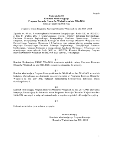 Projekt Uchwała Nr 84 Komitetu Monitorującego Program Rozwoju Obszarów Wiejskich na lata 2014-2020 z dnia 24 czerwca 2016 roku w sprawie zmian Programu Rozwoju Obszarów Wiejskich na lata 2014–2020 Zgodnie art. 49 ust. 3 rozporządzenia Parlamentu Europejskiego i Rady (UE) nr 1303/2013 z dnia 17 grudnia 2013 r. ustanawiającego wspólne przepisy dotyczące Europejskiego Funduszu Rozwoju Regionalnego, Europejskiego Funduszu Społecznego, Funduszu Spójności, Europejskiego Funduszu Rolnego na rzecz Rozwoju Obszarów Wiejskich oraz Europejskiego Funduszu Morskiego i Rybackiego oraz ustanawiającego przepisy ogólne dotyczące Europejskiego Funduszu Rozwoju Regionalnego, Europejskiego Funduszu Społecznego, Funduszu Spójności i Europejskiego Funduszu Morskiego i Rybackiego oraz uchylającego rozporządzenie Rady (WE) nr 1083/2006, Komitet Monitorujący Program Rozwoju Obszarów Wiejskich na lata 2014-2020 uchwala, co następuje: § 1. Komitet Monitorujący PROW 2014-2020 pozytywnie opiniuje zmiany Programu Rozwoju Obszarów Wiejskich na lata 2014-2020, zawarte w załączniku do uchwały. § 2. Komitet Monitorujący Program Rozwoju Obszarów Wiejskich na lata 2014-2020 upoważnia Instytucję Zarządzającą do dokonania stosownych zmian w Programie Rozwoju Obszarów Wiejskich na lata 2014–2020 będących bezpośrednią konsekwencją dokonania zmian określonych w § 1. § 3. Komitet Monitorujący Program Rozwoju Obszarów Wiejskich na lata 2014-2020 upoważnia Instytucję Zarządzającą do dokonania zmian Programu Rozwoju Obszarów Wiejskich na lata 2014-2020 zawartych w załączniku do uchwały, w wyniku uzgodnień z Komisją Europejską. § 4. Uchwała wchodzi w życie z dniem przyjęcia. Przewodniczący Komitetu Monitorującego Program Rozwoju Obszarów Wiejskich na lata 2014-2020 1 Załącznik do uchwały Nr 84 Komitetu Monitorującego Program Rozwoju Obszarów Wiejskich na lata 2014-2020 z dnia 24 czerwca 2016 r. Rozdział Podrozdział Strona 8.2.10. M10 – Działanie rolno-środowiskowo-klimatyczne (art. 28) 8.2.10.4.4.1. Pakiet 1. Rolnictwo zrównoważone - Wymóg 1 8.2.10.4.4.9. Pakiet 2. Ochrona gleb i wód - Wymóg 1 8.2.10.4.4.20. Pakiet 3. Zachowanie sadów tradycyjnych odmian drzew owocowych - Wymóg 1 8.2.10.4.4.29. Pakiet 4. Cenne siedliska i zagrożone gatunki ptaków na obszarach Natura 2000 - Wymóg 1 8.2.10.4.4.142. Pakiet 5. Cenne siedliska poza obszarami Natura 2000 Wymóg 1 8.2.10.4.4.207. Pakiet 6 Zachowanie zagrożonych zasobów genetycznych roślin w rolnictwie - Wymóg 1 8.2.10.4.4.212. Pakiet 7 Zachowanie zagrożonych zasobów genetycznych zwierząt w rolnictwie - Wymóg 1 361 (8.2.10.4.4.1.1) 363 (8.2.10.4.4.9.1.) 365 (8.2.10.4.4.20.1.) 367 (8.2.10.4.4.29.1.) 401 (8.2.10.4.4.142.1.) 420 (8.2.10.4.4.207.1.) 421 (8.2.10.4.4.212.1.) Rodzaj zmiany: Zmiana sposobu weryfikacji faktu posiadania przez rolnika/zarządcę planu działalności rolnośrodowiskowej. Tekst obowiązujący w PROW 2014-2020: Str. 361 2. Fakt sporządzenia planu działalności rolnośrodowiskowej przez doradcę rolnośrodowiskowego jest weryfikowany w trakcie kontroli administracyjnej na podstawie bazy teleinformatycznej, w której rejestrowane są plany działalności rolnośrodowiskowej. Tekst po zmianach PROW 2014-2020: Str. 361 2. Weryfikacja sporządzenia planu działalności rolnośrodowiskowej dokonywana jest w trakcie kontroli administracyjnej na podstawie informacji dołączonych do wniosku. Tekst obowiązujący w PROW 2014-2020: Str. 363 2. Fakt sporządzenia planu działalności rolnośrodowiskowej przez doradcę rolnośrodowiskowego jest weryfikowany w trakcie kontroli administracyjnej na podstawie bazy teleinformatycznej, w której rejestrowane są plany działalności rolnośrodowiskowej. 2 Tekst po zmianach PROW 2014-2020: Str. 363 2. Weryfikacja sporządzenia planu działalności rolnośrodowiskowej dokonywana jest w trakcie kontroli administracyjnej na podstawie informacji dołączonych do wniosku. Tekst obowiązujący w PROW 2014-2020: Str. 365 2. Fakt sporządzenia planu działalności rolnośrodowiskowej przez doradcę rolnośrodowiskowego jest weryfikowany w trakcie kontroli administracyjnej na podstawie bazy teleinformatycznej, w której rejestrowane są plany działalności rolnośrodowiskowej. Tekst po zmianach PROW 2014-2020: Str. 365 2. Weryfikacja sporządzenia planu działalności rolnośrodowiskowej dokonywana jest w trakcie kontroli administracyjnej na podstawie informacji dołączonych do wniosku. Tekst obowiązujący w PROW 2014-2020: Str. 367 2. Fakt sporządzenia planu działalności rolnośrodowiskowej przez doradcę rolnośrodowiskowego jest weryfikowany w trakcie kontroli administracyjnej na podstawie bazy teleinformatycznej, w której rejestrowane są plany działalności rolnośrodowiskowej. Tekst po zmianach PROW 2014-2020: Str. 367 2. Weryfikacja sporządzenia planu działalności rolnośrodowiskowej dokonywana jest w trakcie kontroli administracyjnej na podstawie informacji dołączonych do wniosku. Tekst obowiązujący w PROW 2014-2020: Str. 401 2. Fakt sporządzenia planu działalności rolnośrodowiskowej przez doradcę rolnośrodowiskowego jest weryfikowany w trakcie kontroli administracyjnej na podstawie bazy teleinformatycznej, w której rejestrowane są plany działalności rolnośrodowiskowej. Tekst po zmianach PROW 2014-2020: Str. 401 2. Weryfikacja sporządzenia planu działalności rolnośrodowiskowej dokonywana jest w trakcie kontroli administracyjnej na podstawie informacji dołączonych do wniosku. Tekst obowiązujący w PROW 2014-2020: Str. 420 2. Fakt sporządzenia planu działalności rolnośrodowiskowej przez doradcę rolnośrodowiskowego jest weryfikowany w trakcie kontroli administracyjnej na podstawie bazy teleinformatycznej, w której rejestrowane są plany działalności rolnośrodowiskowej. 3 Tekst po zmianach PROW 2014-2020: Str. 420 2. Weryfikacja sporządzenia planu działalności rolnośrodowiskowej dokonywana jest w t