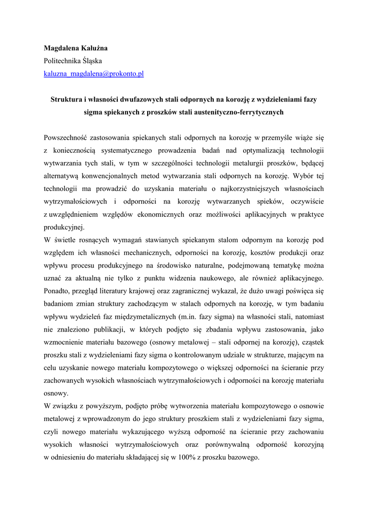 Magdalena Kałużna Politechnika Śląska [email protected] Struktura i własności dwufazowych stali odpornych na korozję z wydzieleniami fazy sigma spiekanych z proszków stali austenityczno-ferrytycznych Powszechność zastosowania spiekanych stali odpornych na korozję w przemyśle wiąże się z koniecznością systematycznego prowadzenia badań nad optymalizacją technologii wytwarzania tych stali, w tym w szczególności technologii metalurgii proszków, będącej alternatywą konwencjonalnych metod wytwarzania stali odpornych na korozję. Wybór tej technologii ma prowadzić do uzyskania materiału o najkorzystniejszych własnościach wytrzymałościowych i odporności na korozję wytwarzanych spieków, oczywiście z uwzględnieniem względów ekonomicznych oraz możliwości aplikacyjnych w praktyce produkcyjnej. W świetle rosnących wymagań stawianych spiekanym stalom odpornym na korozję pod względem ich własności mechanicznych, odporności na korozję, kosztów produkcji oraz wpływu procesu produkcyjnego na środowisko naturalne, podejmowaną tematykę można uznać za aktualną nie tylko z punktu widzenia naukowego, ale również aplikacyjnego. Ponadto, przegląd literatury krajowej oraz zagranicznej wykazał, że dużo uwagi poświęca się badaniom zmian struktury zachodzącym w stalach odpornych na korozję, w tym badaniu wpływu wydzieleń faz międzymetalicznych (m.in. fazy sigma) na własności stali, natomiast nie znaleziono publikacji, w których podjęto się zbadania wpływu zastosowania, jako wzmocnienie materiału bazowego (osnowy metalowej – stali odpornej na korozję), cząstek proszku stali z wydzieleniami fazy sigma o kontrolowanym udziale w strukturze, mającym na celu uzyskanie nowego materiału kompozytowego o większej odporności na ścieranie przy zachowanych wysokich własnościach wytrzymałościowych i odporności na korozję materiału osnowy. W związku z powyższym, podjęto próbę wytworzenia materiału kompozytowego o osnowie metalowej z wprowadzonym do jego struktury proszkiem stali z wydzieleniami fazy sigma, czyli nowego materiału wykazującego wyższą odporność na ścieranie przy zachowaniu wysokich własności wytrzymałościowych oraz porównywalną odporność korozyjną w odniesieniu do materiału składającej się w 100% z proszku bazowego. W harmonogramie planowane badania podzielono na etapy: przygotowania, wytworzenia oraz przeprowadzenia badań nowoopracowanego materiału metalowego. W pierwszym semestrze otrzymywania stypendium w ramach projektu „DoktoRIS” przygotowano proszki stali ferrytyczno-austenitycznej oraz proszki materiału bazowego. Oczyszczono proszki z zanieczyszczeń poprodukcyjnych oraz dokonano obróbki cieplnej proszków (wyżarzanie) w celu usunięcia tlenków powstałych na ich powierzchni. Oczyszczony proszek stali ferrytyczno-austenitycznej (proszek o kształcie sferycznym) poddano procesowi mielenia, mającego za zadanie zmianę morfologii oraz zmniejszenie frakcji jego ziarn. W kolejnym etapie wykonano analizę sitową zmielonego proszku dzieląc proszek na frakcje o określonym zakresie wielkości ziarn. Dokonano również badania podstawowych własności technologicznych przygotowanych proszków decydujących o ich własnościach użytkowych, dokonano obserwacji morfologii powierzchni proszków metodami mikroskopii skaningowej, określono skład chemiczny proszków za pomocą przystawki EDS oraz dokonano analizy wielkości ziarn proszków metodą dyfrakcji laserowej. Niniejsza tematyka doktoratu wpisuje się w kluczowe obszary technologiczne uznane za szczególnie istotne z punktu widzenia rozwoju regionu Województwa Śląskiego, w którym bardzo dynamicznie rozwijają się branże motoryzacyjna i maszynowa. Wymagania obu branż w znaczący sposób wpływają na kształtujące się zapotrzebowanie na nowe technologie wytwarzania części samochodowych i części maszyn o bardzo dobrych własnościach wytrzymałościowych, trybologicznych, odporności na korozję, przy zachowaniu wszystkich zalet charakteryzujących materiały spiekane w tym, dużej dokładności wymiarowej i skomplikowanym kształcie, z wykorzystaniem zautomatyzowanych i prostych linii technologicznych, z naciskiem na obniżoną energochłonność i koszty produkcji. W związku z tym, podjęcie badań obejmujących wytwarzanie spiekanych części maszyn i urządzeń ma swoje uzasadnienie, a prowadzenie ciągłych prac nad modyfikacją struktury i własności spiekanych materiałów metalowych w wyniku optymalizacji każdego z etapów przygotowania materiału z wykorzystaniem metod metalurgii proszków jest konieczne.