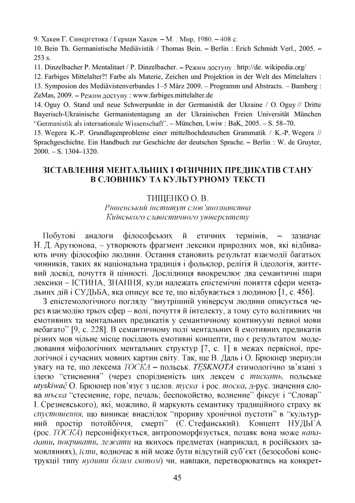 9. . 10. Bein Th. Germanistische Mediävistik / Thomas Bein. Berlin : Erich Schmidt Verl., 2005. 253 s. 11. Dinzelbacher P. Mentalitaet / P. Dinzelbacher. http://de. wikipedia. rg/ 12. Farbiges Mittelalter?! Farbe als Materie, Zeichen und Projektion in der Welt des Mittelalters : 13. Symposion des Mediävistenverbandes 1 5 März 2009. Programm und Abstracts. Bamberg : ZeMas, 2009. : www.farbiges.mittelalter.de 14. Oguy O. Stand und neue Schwerpunkte in der Germanistik der Ukraine / O. Oguy // Dritte Bayerisch-Ukrainische Germanistentagung an der Ukrainischen Freien Universität München . München, Lwiw : BaK, 2005. S. 58 70. 15. Wegera K.-P. Grundlagenprobleme einer mittelhochdeutschen Grammatik / K.-P. Wegera // Sprachgeschichte. Ein Handbuch zur Geschichte der deutschen Sprache. Berlin : W. de Gruyter, 2000. S. 1304 1320. 456]. T SKNOTA utyskiwa , , - , 45 , , , , , , , , , , - , - , , - , - , nuda ), ( )[ ]; ,( ) [ 302] ; , 46 - !) , [ nudy na pudy. ]. - nuda. , , , , , , , , , , , , , , , ), - , - , , - , , chew his ear off under hatches cotton-picking TETM: A Thesaurus of English Traditional Metaphors, London and New York: 47 Routledge bumbledore Like a drone in a bussa would talk a glass eye to sleep , , , eat her heart out Have an aching tooth troska, smutek, t sknota, Rdza trawi elazo, troska cz owieka, Smutek jak rdza elazu i robak drzewu sile cz owieka szkodzi, t sknota sta a si robakiem, który po era , Jako mól odzie y, a robak drzewu, tak smutek sile cz owieka szkodzi . , Ukryty robak wierci mu w sercu, mia robaka, który mu toczy serce, robak serce gryzie , (Dr czy robak niepokoju, Gryzie go zmartwienie jak robak, robak zgryzoty toczy wn trze jego duszy/mu sumienie S ownik frazeologiczny j zyka polskiego. T. 1 2. Warszawa : PWN, 2002 nuda zabójcza, wielkie, potworne nudy na pudy <wielkie, niezno ne, nudzenie si przejmowa nud , rozprasza nud , robi co z nudy, z nudów, umiera z nudy, z nudów <nudzi si bardzo, wstopniu trudnym do zniesienia>, ), (W ) nuda cechuje (co) ( ), ( ). lukrecja z miodem/mas em/myd em, rycynowy nudny jak flaki z olejem, nudny jak nudny jak kasza na rzadko, nudny jak olej Nudno jak w klasztorze, Nudzi si jak diabe na pokucie, Nudzi si jak mnich w klasztorze, Nudny jak wielkopostne kazanie Nudny jak flaki z olejem nudny Wprost Patriotyzm jest nudny S owo patriotyzm kojarzy si z agresj i smierteln nud Wersja soft patriotyzmu nie zawiera agresji, jest za to banalna, ckliwa i nudna jak flaki z olejem [Wprost s. 40]. 48 nudny jak lukrecja z miodem/mas em/myd em, lukrecja lukier polewa do wyrobów cukierniczych, sporz dzona z roztopionego cukru, czasami z dodatkiem rodków aromatyzuj cych lukrecja melancholy as: melancholy as a graveyard on a rainy day melancholy as a Quaker meeting-house by night a sick monkey melancholy as a sick parrot as a gib-cat horse a tar-barrel a thunderstorm The black ox has trodden on my foot a collier's miserable as a rat in Like a dying duck in Gooseberry eyes Dull as a Dutchman under the harrow [Ire Get/Have your tail down - ), , , ( 49 < >: - , [2, 110]. , - . / / , / , , [4, 287]. 1. -1995. 2. 2003. 461. - 3. / : 4. 50 5. . 6. 1998. 7. III. : 720 c. : : 10.02.19 / . , 2009. 45 . 8. Warszawa : PWN, 2004. 9. mentalnych / M.Danielewiczowa // Studia z semantyki porównawczej. Nazwy barw. Nazwy wymiarów. Predykaty mentalne. Cz 1. Warszawa, 2000. S. 227-248. 10. TETM : A Thesaurus of English Traditional Metaphors / Ed. P. Wilkinson. L. : Routledge, 1992. METALANGUAGE IN IRIS THE SANDCASTLE SHOPIN P. Y. Luhansk Taras Shevchenko National University Presentation of communication and thoughts of the characters and author in fiction is one of the most relevant themes of literary criticism. Describing the personality of the author and her characters provides an opportunity for the reader to learn their perception, memories, thoughts, feelings, pleasures, pains, drives, needs, desires, purposes and goals. Metalanguage is the material that enables scientists and readers to comprehend deep thought patterns, hidden motives and suppressed emotions because linguistic reflexivity reveals value priorities of a personality, his or her intelligence, convictions and beliefs. Looking in the depths of consciousness appears to be one of the reasons why Iris Murdoch lets us see the metalinguistic activity of the characters. It is the most important way of character presentation in The Sandcastle. The current study will look closer at linguistic reflexivity of the main characters and s The Sandcastle as one of the essential characteristics of the narrative style of the novel. We will also make an effort to classify metalanguage according to the nature, functions and structure of the utterances in the novel. We have chosen this work of Murdoch because it abounds with instances of linguistic reflexivity. It is not only the subject matter of a number of dialogues but also a part and parcel of the inner speech of the characters. We believe that the investigation of the discursive nature of metalanguage in Iris The Sandcastle is quintessential for any literary analysis of the novel. Reflection concerns not only particular lexical units but it is also connected with cognizing the process of communication in all its complexity. Linguistic consciousness of the rception is achieved at the stage of linguistic reflexivity as reflection, related to human behaviour and interaction with other people. 51