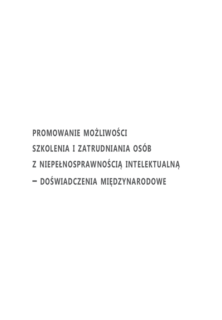 promowanie możliwości szkolenia i zatrudniania osób z niepełnosprawnością intelektualną – doświadczenia międzynarodowe POLSKIE FORUM OSÓB NIEPEŁNOSPRAWNYCH promowanie możliwości szkolenia i zatrudniania osób z niepełnosprawnością intelektualną – doświadczenia międzynarodowe T revor R. P armenter ILO promowanie możliwości szkolenia i zatrudniania osób z niepełnosprawnością intelektualną ... Niniejsza publikacja została oryginalnie wydana przez International Labour Office (ILO) z siedzibą w Genewie, tytuł oryginalny: Promoting Training and Employment Opportunities for People with Intellectual Disabilities: International Experience. Copyright © by International Labour Organization, 2011 Polish translation copyright © by Polskie Forum Osób Niepełnosprawnych, 2013 Przetłumaczono i opublikowano za zgodą właściciela praw autorskich. Sformułowania wykorzystane w publikacjach ILO, zgodne z praktykami stosowanymi w Organizacji Narodów Zjednoczonych, oraz prezentacja materiału w nich zawartego nie stanowią opinii International Labour Office dotyczących stanu prawnego w jakimkolwiek państwie, obszarze lub terytorium ani nie są opiniami International Labour Office na temat władz państw lub granic terytoriów objętych rządami danych władz. Odpowiedzialność za opinie wyrażone w badaniach i innych pracach spoczywa wyłącznie na autorach tych prac, a ich publikacja nie stanowi wsparcia i aprobaty dla takich opinii ze strony International Labour Office. Odniesienia do nazw firm, produktów i procesów komercyjnych nie oznaczają wsparcia i aprobaty dla takich produktów i procesów ze strony International Labour Office, a brak takich odniesień do nazwy firmy, produktu lub procesu komercyjnego nie oznacza dezaprobaty ze strony International Labour Office. ILO nie jest odpowiedzialne za poprawność i kompletność polskiego tłumaczenia, ani za niedokładności, błędy, braki ani konsekwencje wynikające z wykorzystania polskiego tłumaczenia. Tłumaczenie z języka angielskiego: Tomasz Korybski. Tłumaczenia Ustne i Pisemne. Szkolenia Językowe Redakcja i korekta: Agnieszka Jędrzejczak-Sprycha Opracowanie graficzne: Julia Roczan Skład i łamanie: JP ISBN: 978-83-64280-21-4 Wydawca: Polskie Forum Osób Niepełnosprawnych ul. Ogrodowa 28/30 lok. 416 00-896 Warszawa www.pfon.org Publikacja bezpłatna Publikacja zrealizowana w ramach projektu „Trener pracy jako sposób na zwiększenie zatrudnienia osób niepełnosprawnych”. Projekt realizowany przez Państwowy Fundusz Rehabilitacji Osób Niepełnosprawnych w partnerstwie z Polskim Forum Osób Niepełnosprawnych, Polską Organizacją Pracodawców Osób Niepełnosprawnych oraz KARE Promoting Inclusion for People with Intellectual Disabilities z Irlandii. PRZEDMOWA 5 6 T revor R. P armenter promowanie możliwości szkolenia i zatrudniania osób z niepełnosprawnością intelektualną ... 7 W stęp S króty i akronimy W prowadzenie 10 12 15 1.1. I dentyfikowanie osób z niepełnosprawnością intelektualną 22 1. OSOBY Z NIEPEŁNOSPRAWNOŚCIĄ INTELEKTUALNĄ 18 1.1.1. T estowanie ilorazu inteligencji 1.1.2. R amy potrzeb wsparcia 1.1.3. Z naczenie programów zatrudnienia i szkoleniowych 1.1.4. R ozważania dotyczące kultur 1.2. Z dolność do nauki i pracy 1.2.1. N ormalizacja , deinstytucjonalizacja , życie i praca w społeczności 1.2.2. P rzełomowa praca M arca G olda w USA 22 24 24 26 26 27 28 2. WARIANTY ZATRUDNIENIA 30 2.3.1. M odel pracy wspomaganej 2.3.2. M odel enklawy 2.3.3. M odel mobilnego personelu 2.3.4. M odel benchworkowy 2.3.5. P odsumowanie modeli zatrudnienia wspomaganego 37 39 40 41 42 2.1. D zienne ośrodki zajęć 2.2. Z akłady pracy chronionej 2.3. Z atrudnienie wspomagane 2.4. Z atrudnienie dostosowane do potrzeb (C ustomized E mployment – CE) 2.5. S amozatrudnienie , mikroprzedsiębiorstwa 2.6. F irmy społeczne 2.7. P rogram ekonomii społecznej (C ommunity E conomic D evelopment – CED) 2.8. W arianty zatrudnienia – podsumowanie 3. ROZWÓJ INICJATYW W ZAKRESIE ZATRUDNIENIA WSPOMAGANEGO 31 33 36 43 44 46 48 49 50 8 T revor R. P armenter 3.1. K raje o wysokim dochodzie 3.1.1. S tany Z jednoczone 3.1.2. A ustralia 3.1.3. K anada 3.1.4. F inlandia 3.1.5. I rlandia 3.1.6. H olandia 3.1.7. N owa Z elandia 3.1.8. W ielka B rytania 3.1.9. I nne kraje europejskie 3.1.10. P rzykłady z A zji 3.2.1. P rzykłady z A zji 3.2.2. P rzykład z A meryki P ołudniowej 3.3.1. P rzykłady z RPA 3.3.2. P rzykład z Z ambii 3.4.1. B ariery na drodze do uczestnictwa 3.4.2. P rzygotowanie osób z niepełnosprawnością 3.4.3. Z indywidualizowane wsparcie finansowe 3.4.4. I nicjatywy wejścia na rynek pracy absolwentów szkół 3.4.5. C harakterystyka skutecznych programów 3.4.6. C harakterystyka miejsca pracy 3.4.7. R ezultaty 3.4.8. U wagi końcowe promowanie możliwości szkolenia i zatrudniania osób z niepełnosprawnością intelektualną ... 50 50 52 53 54 55 57 59 61 64 65 3.2. K raje o średnim dochodzie 68 3.3. K raje o niskim dochodzie – przykłady z A fryki 70 3.4. C o sprawia , że zatrudnienie włączające jest skuteczne ? 74 4. KROK NAPRZÓD 91 4.1. W skazówki odnośnie do rozwoju polityki 4.1.1. P oziom krajowy 4.1.2. P oziom regionalny 4.2. P odsumowanie B ibliografia i przydatne linki 68 69 71 72 74 75 76 76 78 83 86 90 93 94 96 97 99 spis ramek Ramka 1.1. Kim jesteśmy i czego pragniemy? 19 Ramka 1.2. Głosy osób z niepełnosprawnością intelektualną: Quincy Mwiwa20 Ramka 1.3. Rozwój grup self-adwokatów: Afryka 21 Ramka 2.1. Przejście do zatrudnienia wspomaganego – z pomocą z zewnątrz38 Ramka 2.2. Zatrudnienie wspomagane z „naturalnym wsparciem” 39 Ramka 2.3. Personel mobilny40 Ramka 2.4. CNS Precision Assembly 42 Ramka 2.5. Przykład sukcesu zatrudnienia dostosowanego do potrzeb43 Ramka 2.6 Podstawowe wartości uznawane przez firmy społeczne 47 Ramka 3.1. Historia Wendy Patton 61 Ramka 3.2. Ścieżka ku satysfakcjonującej pracy: Jacqueline Minchin6