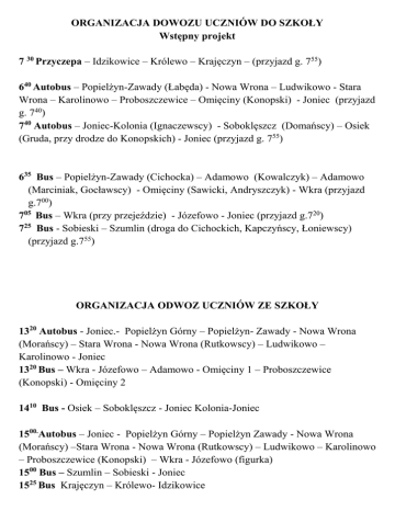 ORGANIZACJA DOWOZU UCZNIÓW DO SZKOŁY Wstępny projekt 7 30 Przyczepa – Idzikowice – Królewo – Krajęczyn – (przyjazd g. 755) 640 Autobus – Popielżyn-Zawady (Łabęda) - Nowa Wrona – Ludwikowo - Stara Wrona – Karolinowo – Proboszczewice – Omięciny (Konopski) - Joniec (przyjazd g. 740) 740 Autobus – Joniec-Kolonia (Ignaczewscy) - Soboklęszcz (Domańscy) – Osiek (Gruda, przy drodze do Konopskich) - Joniec (przyjazd g. 755) 635 Bus – Popielżyn-Zawady (Cichocka) – Adamowo (Kowalczyk) – Adamowo (Marciniak, Gocławscy) - Omięciny (Sawicki, Andryszczyk) - Wkra (przyjazd g.700) 705 Bus – Wkra (przy przejeździe) - Józefowo - Joniec (przyjazd g.720) 725 Bus - Sobieski – Szumlin (droga do Cichockich, Kapczyńscy, Łoniewscy) (przyjazd g.755) ORGANIZACJA ODWOZ UCZNIÓW ZE SZKOŁY 1320 Autobus - Joniec.- Popielżyn Górny – Popielżyn- Zawady - Nowa Wrona (Morańscy) – Stara Wrona - Nowa Wrona (Rutkowscy) – Ludwikowo – Karolinowo - Joniec 1320 Bus – Wkra - Józefowo – Adamowo - Omięciny 1 – Proboszczewice (Konopski) - Omięciny 2 1410 Bus - Osiek – Soboklęszcz - Joniec Kolonia-Joniec 1500.Autobus – Joniec - Popielżyn Górny – Popielżyn Zawady - Nowa Wrona (Morańscy) –Stara Wrona - Nowa Wrona (Rutkowscy) – Ludwikowo – Karolinowo – Proboszczewice (Konopski) – Wkra - Józefowo (figurka) 1500 Bus – Szumlin – Sobieski - Joniec 1525 Bus Krajęczyn – Królewo- Idzikowice