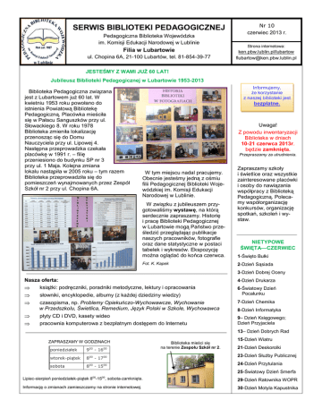 SERWIS BIBLIOTEKI PEDAGOGICZNEJ Pedagogiczna Biblioteka Wojewódzka im. Komisji Edukacji Narodowej w Lublinie Filia w Lubartowie ul. Chopina 6A, 21-100 Lubartów, tel. 81-854-39-77 Nr 10 czerwiec 2013 r. Strona internetowa: ken.pbw.lublin.pl/lubartow [email protected] JESTEŚMY Z WAMI JUŻ 60 LAT! Jubileusz Biblioteki Pedagogicznej w Lubartowie 1953-2013 Biblioteka Pedagogiczna związana jest z Lubartowem już 60 lat. W kwietniu 1953 roku powołano do istnienia Powiatową Bibliotekę Pedagogiczną. Placówka mieściła się w Pałacu Sanguszków przy ul. Słowackiego 8. W roku 1978 Biblioteka zmieniła lokalizację przenosząc się do Domu Nauczyciela przy ul. Lipowej 4. Następna przeprowadzka czekała placówkę w 1991 r. – filię przeniesiono do budynku SP nr 3 przy ul. 1 Maja. Kolejna zmiana lokalu nastąpiła w 2005 roku – tym razem Biblioteka przeprowadziła się do pomieszczeń wynajmowanych przez Zespół Szkół nr 2 przy ul. Chopina 6A. Informujemy, że korzystanie z naszej biblioteki jest bezpłatne. Uwaga! Z powodu inwentaryzacji Biblioteka w dniach 10-21 czerwca 2013r. będzie zamknięta. Przepraszamy za utrudnienia. W tym miejscu nadal pracujemy. Obecnie jesteśmy jedną z ośmiu filii Pedagogicznej Biblioteki Wojewódzkiej im. Komisji Edukacji Narodowej w Lublinie. W związku z jubileuszem przygotowaliśmy wystawę, na którą serdecznie zapraszamy. Historię i pracę Biblioteki Pedagogicznej w Lubartowie mogą Państwo prześledzić przeglądając publikacje naszych pracowników, fotografie oraz dane statystyczne w postaci tabelek i wykresów. Ekspozycję można oglądać do końca czerwca. Fot. K. Kapek Zapraszamy szkoły i świetlice oraz wszystkie zainteresowane placówki i osoby do nawiązania współpracy z Biblioteką Pedagogiczną. Polecamy współorganizację konkursów, organizację spotkań, szkoleń i wystaw. NIETYPOWE ŚWIĘTA—CZERWIEC 1-Święto Bułki 2-Dzień Sąsiada 3-Dzień Dobrej Oceny Nasza oferta: książki: podręczniki, poradniki metodyczne, lektury i opracowania słowniki, encyklopedie, albumy (z każdej dziedziny wiedzy) 4-Dzień Drukarza 6-Światowy Dzień Pocałunku czasopisma, np. Problemy Opiekuńczo-Wychowawcze, Wychowanie w Przedszkolu, Świetlica, Remedium, Język Polski w Szkole, Wychowawca 7-Dzień Chemika płyty CD i DVD, kasety wideo 9– Dzień Księgowego; Dzień Przyjaciela pracownia komputerowa z bezpłatnym dostępem do Internetu 8-Dzień Informatyka 13– Dzień Dobrych Rad ZAPRASZAMY W GODZINACH poniedziałek 900 - 1600 wtorek-piątek 800 - 1700 sobota 800 - 1500 Biblioteka mieści się na terenie Zespołu Szkół nr 2. 15-Dzień Wiatru 21-Dzień Deskorolki 23-Dzień Służby Publicznej 24-Dzień Przytulania 25-Światowy Dzień Smerfa Lipiec-sierpień poniedziałek-piątek 800-1500, sobota-zamknięte. 29-Dzień Ratownika WOPR Informację o zmianach zamieszczamy na stronie internetowej. 30-Dzień Motyla Kapustnika Czytaj, będziesz jeszcze większy - Anna Maria Jopek POLECAMY B. Szurowska: Anoreksja w rodzinie. Wydaw. Difin.— Warszawa 2011 Książka porusza problematykę zaburzeń odżywiania. Przedstawia funkcjonowanie rodziny z dzieckiem cierpiącym na anoreksję oraz rolę rodziny w leczeniu choroby. M. Niemiec-Knaś: Metoda projektów w nauczaniu języków obcych. Perspektywa interdyscyplinarna. Wydaw. Impuls.— Kraków 2011 Do nauczania języka obcego nie wystarcza już tylko podręcznik jako źródło wiedzy o języku i informacji o otaczającym nas świecie. Konieczne jest zdobywanie wiedzy w sposób całościowy w kontekście szybko zmieniających się realiów. Ta książka to poszukiwanie nowych metod i analiza ich skuteczności. T. ZubrzyckaMaciąg: Trening asertywności w kształceniu pedagogicznym. Wydaw. UMCS.— Lublin 2011 Celem treningu asertywności jest „modelowanie gotowości do zachowań asertywnych w różnych sytuacjach społecznych, aby jednostka mogła nauczyć się ekspresji własnych uczuć, opanowywania i wygaszania własnego lęku, kontroli nad własnym zachowaniem oraz obrony własnych praw bez naruszania praw innych ludzi” (J. Mączyński). P. Stawiarska: Wolontariat hospicyjny. Perspektywa interdyscyplinarna. Wydaw. Difin.— Warszawa 2011 Wyjście z bezinteresowną pomocą ku ludziom chorym nie jest łatwe. Choroba nie tylko budzi współczucie i szacunek, ale także na swój sposób onieśmiela. Książka porusza problematykę wolontariatu społecznego, w hospicjum, opieki paliatywnej, wypalenia zawodowego wolontariuszy. SERWIS BIBLIOTEKI PEDAGOGICZNEJ Program eTwinning – Europejska społeczność Program eTwinning – Europejska społeczność szkolna eTwinning to łączenie i współpraca szkół w Europie za pośrednictwem mediów elektronicznych i promowanie szkolenia nauczycieli. Jest to edukacyjny program Unii Europejskiej, który promuje wykorzystywanie technologii informacyjno-komunikacyjnych (TIK) w szkołach europejskich. Uczniowie i nauczyciele wykorzystują Internet we współpracy ponad granicami. Współdziałają, wymieniają się informacjami i materiałami do nauki. eTwinning poszerza zakres pedagogicznych możliwości oferowanych uczniom i nauczycielom, motywuje do nauki i otwarcia na Europę. Formy projektów - Krótki tygodniowy lub miesięczny projekt może skupić się na konkretnym temacie z programu nauczania; - Projekt trzymiesięczny, podczas którego uczniowie nauczą się np. tworzyć podstawową stronę internetową i przedstawiać informacje w języku obcym; - Projekt całoroczny dotyczący np. historii Europy, matematyki, sztuki, który stanowi część programu nauczania; - Projekt wieloletni - współpraca z jednym lub większą ilością partnerów; Trzy najważniejsze cechy projektów eTwinning Zalety projektów eTwinning 1. Wykorzystywanie komputera, Internetu, oprogramowania, aparatu cyfrowego, kamery czyli narzędzi lubianych przez uczniów 2. Języki obce są konieczne do bezpośredniej komunikacji ze szkołą partnerską, a natychmiastowe korz