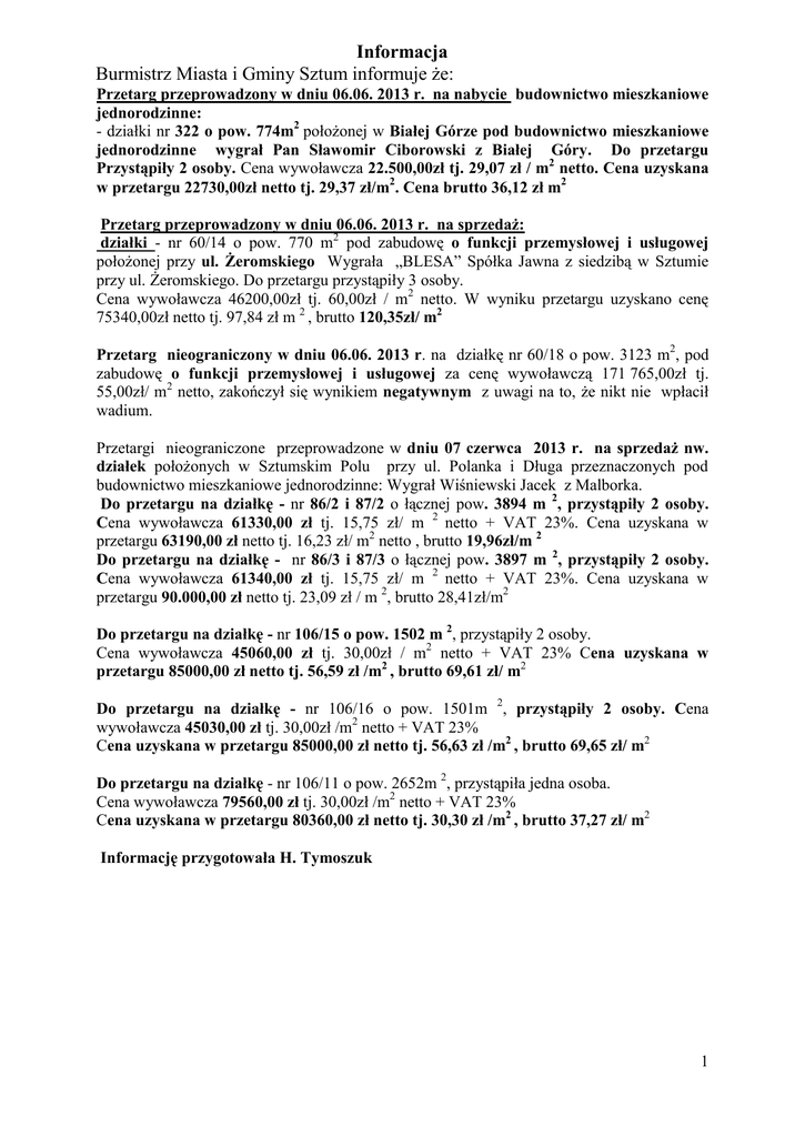 Informacja Burmistrz Miasta i Gminy Sztum informuje że: Przetarg przeprowadzony w dniu 06.06. 2013 r. na nabycie budownictwo mieszkaniowe jednorodzinne: - działki nr 322 o pow. 774m2 położonej w Białej Górze pod budownictwo mieszkaniowe jednorodzinne wygrał Pan Sławomir Ciborowski z Białej Góry. Do przetargu Przystąpiły 2 osoby. Cena wywoławcza 22.500,00zł tj. 29,07 zł / m2 netto. Cena uzyskana w przetargu 22730,00zł netto tj. 29,37 zł/m2. Cena brutto 36,12 zł m2 Przetarg przeprowadzony w dniu 06.06. 2013 r. na sprzedaż: działki - nr 60/14 o pow. 770 m2 pod zabudowę o funkcji przemysłowej i usługowej położonej przy ul. Żeromskiego Wygrała „BLESA” Spółka Jawna z siedzibą w Sztumie przy ul. Żeromskiego. Do przetargu przystąpiły 3 osoby. Cena wywoławcza 46200,00zł tj. 60,00zł / m2 netto. W wyniku przetargu uzyskano cenę 75340,00zł netto tj. 97,84 zł m 2 , brutto 120,35zł/ m2 Przetarg nieograniczony w dniu 06.06. 2013 r. na działkę nr 60/18 o pow. 3123 m2, pod zabudowę o funkcji przemysłowej i usługowej za cenę wywoławczą 171 765,00zł tj. 55,00zł/ m2 netto, zakończył się wynikiem negatywnym z uwagi na to, że nikt nie wpłacił wadium. Przetargi nieograniczone przeprowadzone w dniu 07 czerwca 2013 r. na sprzedaż nw. działek położonych w Sztumskim Polu przy ul. Polanka i Długa przeznaczonych pod budownictwo mieszkaniowe jednorodzinne: Wygrał Wiśniewski Jacek z Malborka. Do przetargu na działkę - nr 86/2 i 87/2 o łącznej pow. 3894 m 2, przystąpiły 2 osoby. Cena wywoławcza 61330,00 zł tj. 15,75 zł/ m 2 netto + VAT 23%. Cena uzyskana w przetargu 63190,00 zł netto tj. 16,23 zł/ m2 netto , brutto 19,96zł/m 2 Do przetargu na działkę - nr 86/3 i 87/3 o łącznej pow. 3897 m 2, przystąpiły 2 osoby. Cena wywoławcza 61340,00 zł tj. 15,75 zł/ m 2 netto + VAT 23%. Cena uzyskana w przetargu 90.000,00 zł netto tj. 23,09 zł / m 2, brutto 28,41zł/m2 Do przetargu na działkę - nr 106/15 o pow. 1502 m 2, przystąpiły 2 osoby. Cena wywoławcza 45060,00 zł tj. 30,00zł / m2 netto + VAT 23% Cena uzyskana w przetargu 85000,00 zł netto tj. 56,59 zł /m2 , brutto 69,61 zł/ m2 Do przetargu na działkę - nr 106/16 o pow. 1501m 2, przystąpiły 2 osoby. Cena wywoławcza 45030,00 zł tj. 30,00zł /m2 netto + VAT 23% Cena uzyskana w przetargu 85000,00 zł netto tj. 56,63 zł /m2 , brutto 69,65 zł/ m2 Do przetargu na działkę - nr 106/11 o pow. 2652m 2, przystąpiła jedna osoba. Cena wywoławcza 79560,00 zł tj. 30,00zł /m2 netto + VAT 23% Cena uzyskana w przetargu 80360,00 zł netto tj. 30,30 zł /m2 , brutto 37,27 zł/ m2 Informację przygotowała H. Tymoszuk 1