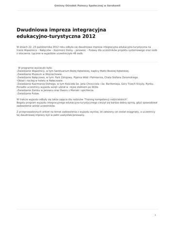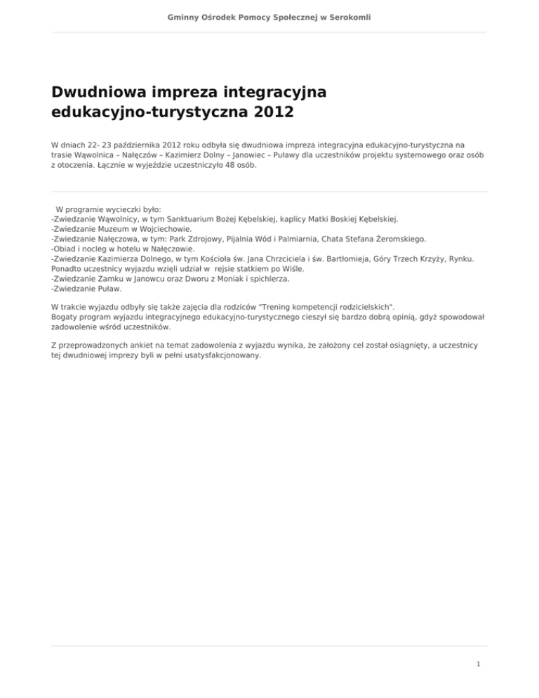 Gminny Ośrodek Pomocy Społecznej w Serokomli Dwudniowa impreza integracyjna edukacyjno-turystyczna 2012 W dniach 22- 23 października 2012 roku odbyła się dwudniowa impreza integracyjna edukacyjno-turystyczna na trasie Wąwolnica – Nałęczów – Kazimierz Dolny – Janowiec – Puławy dla uczestników projektu systemowego oraz osób z otoczenia. Łącznie w wyjeździe uczestniczyło 48 osób. W programie wycieczki było: -Zwiedzanie Wąwolnicy, w tym Sanktuarium Bożej Kębelskiej, kaplicy Matki Boskiej Kębelskiej. -Zwiedzanie Muzeum w Wojciechowie. -Zwiedzanie Nałęczowa, w tym: Park Zdrojowy, Pijalnia Wód i Palmiarnia, Chata Stefana Żeromskiego. -Obiad i nocleg w hotelu w Nałęczowie. -Zwiedzanie Kazimierza Dolnego, w tym Kościoła św. Jana Chrzciciela i św. Bartłomieja, Góry Trzech Krzyży, Rynku. Ponadto uczestnicy wyjazdu wzięli udział w rejsie statkiem po Wiśle. -Zwiedzanie Zamku w Janowcu oraz Dworu z Moniak i spichlerza. -Zwiedzanie Puław. W trakcie wyjazdu odbyły się także zajęcia dla rodziców "Trening kompetencji rodzicielskich". Bogaty program wyjazdu integracyjnego edukacyjno-turystycznego cieszył się bardzo dobrą opinią, gdyż spowodował zadowolenie wśród uczestników. Z przeprowadzonych ankiet na temat zadowolenia z wyjazdu wynika, że założony cel został osiągnięty, a uczestnicy tej dwudniowej imprezy byli w pełni usatysfakcjonowany. 1