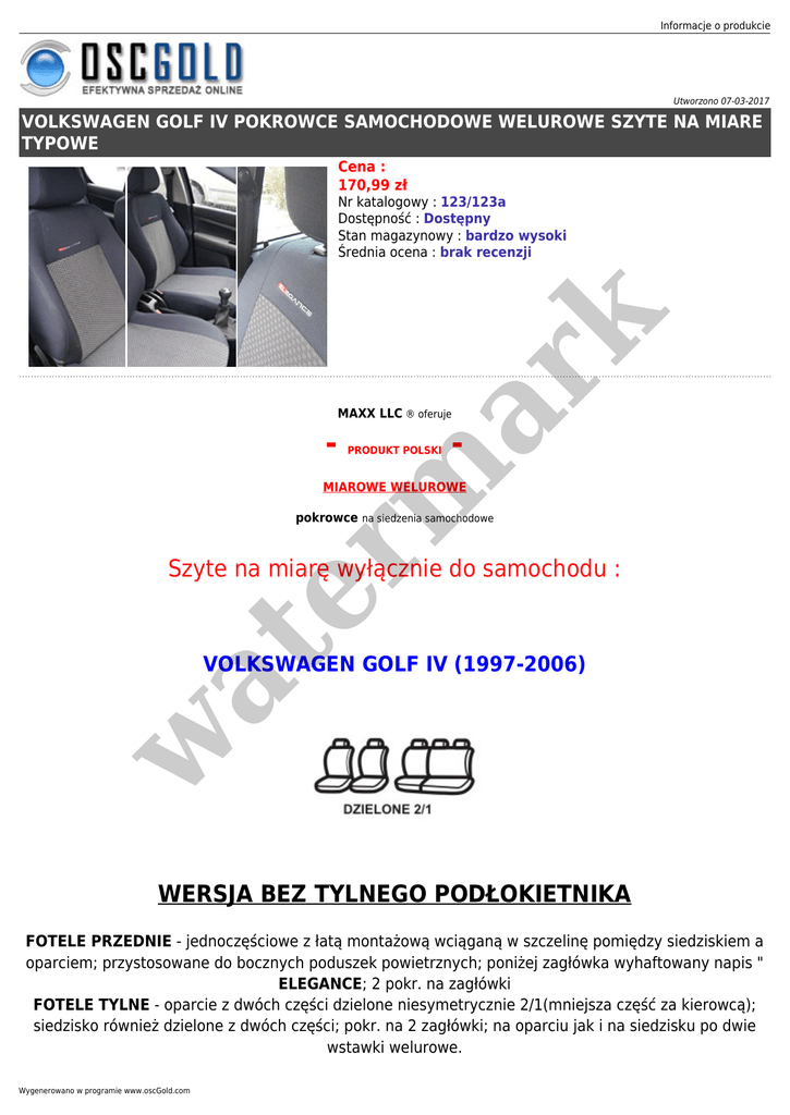 Informacje o produkcie Utworzono 07-03-2017 VOLKSWAGEN GOLF IV POKROWCE SAMOCHODOWE WELUROWE SZYTE NA MIARE TYPOWE Cena : 170,99 zł er m ar k Nr katalogowy : 123/123a Dostępność : Dostępny Stan magazynowy : bardzo wysoki Średnia ocena : brak recenzji MAXX LLC ® oferuje - PRODUKT POLSKI - MIAROWE WELUROWE pokrowce na siedzenia samochodowe at Szyte na miarę wyłącznie do samochodu : w VOLKSWAGEN GOLF IV (1997-2006) WERSJA BEZ TYLNEGO PODŁOKIETNIKA FOTELE PRZEDNIE - jednoczęściowe z łatą montażową wciąganą w szczelinę pomiędzy siedziskiem a oparciem; przystosowane do bocznych poduszek powietrznych; poniżej zagłówka wyhaftowany napis " ELEGANCE; 2 pokr. na zagłówki FOTELE TYLNE - oparcie z dwóch części dzielone niesymetrycznie 2/1(mniejsza część za kierowcą); siedzisko również dzielone z dwóch części; pokr. na 2 zagłówki; na oparciu jak i na siedzisku po dwie wstawki welurowe. Wygenerowano w programie www.oscGold.com KOMPLET ZAWIERA ● ● ● ● ● ● 2 pokrowce na przednie fotele 2 pokrowce na oparcie tylne 2 pokrowce na siedzisko tylne 4 pokrowce na zagłówki haczyki oraz inne elementy montażowe instrukcję montażu WERSJA Z TYLNYM PODŁOKIETNIKIEM er m ar k FOTELE PRZEDNIE - jednoczęściowe z łatą montażową wciąganą w szczelinę pomiędzy siedziskiem a oparciem; przystosowane do bocznych poduszek powietrznych; poniżej zagłówka wyhaftowany napis " ELEGANCE; 2 pokr. na zagłówki FOTELE TYLNE - oparcie z dwóch części dzielone niesymetrycznie 2/1(mniejsza część za kierowcą), na środku niezależny podłokietnik z osobnym pokrowcem; siedzisko również dzielone z dwóch części; pokr. na 2 zagłówki; na oparciu jak i na siedzisku po dwie wstawki welurowe. KOMPLET ZAWIERA ● ● ● ● ● 2 pokrowce na przednie fotele 2 pokrowce na oparcie tylne 2 pokrowce na siedzisko tylne 1 pokrowiec na tylny podłokietnik 4 pokrowce na zagłówki haczyki oraz inne elementy montażowe instrukcję montażu Pokrowce oferowane przez nas posiadają atest bezpieczeństwa na poduszki powietrzne AIRBAG Przemysłowego Instytutu Motoryzacji (PIMOT) w Warszawie. Posiadają one specjalne szycie po stronie poduszki powietrznej, oznaczone wszywką z napisem "airbag", dzięki czemu poduszki bez najmniejszego problemu będą mogły wystrzelić gdy zajdzie taka potrzeba. Dzięki czemu przystosowane są do samochodów zarówno z bocznymi poduszkami powietrznymi w fotelach, jak i do standardowych siedzeń. at ● w ● w at er m ar k Informacje o produkcie Pokrowce wykonane są z wysokiej jakości weluru dodatkowo laminowanego pianką poliuretanową oraz podszewką co zapobiega wykruszaniu się gąbki i ułatwia zakładanie Boczki foteli, zagłówki oraz plecy wykonane są z grubej dzianiny poliestrowej Wygenerowano w programie www.oscGold.com koloru ciemno grafitowego, w całości laminowanej pianką, w at er m ar k w miejscach szczególnie podatnych na przetarcia dodatkowo wzmocnione podszewką. w at er m ar k Informacje o produkcie Wygenerowano w programie www.oscGold.com er m ar k Pokrowce są bardzo solidnie wykończone, otwory do regulacji foteli, lub pod zagłówki i pasy bezpieczeństwa są wycięte, obszyte i dopasowane pod każdy model indywidualnie. at Po dokładnym montażu naszych pokrowców uzyskujemy efekt praktycznie nie odróżniający się od orginalnej tapicerki co zresztą widać na powyższych zdjęciach. w W trzech wzorach: w at er m ar k Informacje o produkcie Wygenerowano w programie www.oscGold.com er m ar k at w w at er m ar k Informacje o produkcie Wygenerowano w programie www.oscGold.com