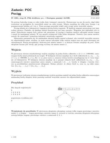 (1 ¬ wi ¬ 1 000 000, wi 6= wj dla i 6= j), przy czym wi oznacza rodzaj surowca znajdującego się w i-tym wagonie od lokomotywy. W kolejnym wierszu znajduje się n parami różnych liczb całkowitych m1 , m2 , . . . , mn ,