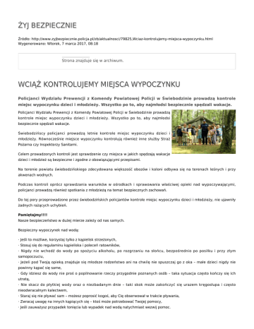 ŻYJ BEZPIECZNIE Źródło: http://www.zyjbezpiecznie.policja.pl/zb/aktualnosci/79825,Wciaz-kontrolujemy-miejsca-wypoczynku.html Wygenerowano: Wtorek, 7 marca 2017, 08:18 Strona znajduje się w archiwum. WCIĄŻ KONTROLUJEMY MIEJSCA WYPOCZYNKU Policjanci Wydziału Prewencji z Komendy Powiatowej Policji w Świebodzinie prowadzą kontrole miejsc wypoczynku dzieci i młodzieży. Wszystko po to, aby najmłodsi bezpiecznie spędzali wakacje. Policjanci Wydziału Prewencji z Komendy Powiatowej Policji w Świebodzinie prowadzą kontrole miejsc wypoczynku dzieci i młodzieży. Wszystko po to, aby najmłodsi bezpiecznie spędzali wakacje. Świebodzińscy policjanci prowadzą letnie kontrole miejsc wypoczynku dzieci i młodzieży. Równocześnie miejsce wypoczynku kontrolują również inne służby Straż Pożarna czy Inspektorzy Sanitarni. Celem prowadzonych kontroli jest sprawdzenie czy miejsca w jakich spędzają wakacje dzieci i młodzież są bezpieczne i zgodne z obowiązującymi przepisami. Na terenie powiatu świebodzińskiego zdecydowana większość obozów i koloni odbywa się na terenach leśnych i przy akwenach wodnych. Podczas kontroli oprócz sprawdzania warunków w ośrodkach i sprawowania właściwej opieki nad wypoczywającymi, policjanci prowadzą również spotkania z młodzieżą na temat bezpiecznych zachowań. Do tej pory przeprowadzone przez świebodzińskich policjantów kontrole miejsc wypoczynku dzieci i młodzieży, nie ujawniły żadnych rażących uchybień. Pamiętajmy!!!! Nasze bezpieczeństwo w dużej mierze zależy od nas samych. Bezpieczny wypoczynek nad wodą: · Jeśli to możliwe, korzystaj tylko z kąpielisk strzeżonych, · Stosuj się do regulaminu kąpieliska i poleceń ratowników, · Nigdy nie wchodź do wody po spożyciu alkoholu, po rozgrzaniu na słońcu, bezpośrednio po posiłku i przy złym samopoczuciu, · Jeżeli pod Twoją opieką znajduje się młodsze rodzeństwo ani na chwilę nie spuszczaj go z oka – małe dzieci nigdy nie powinny kąpać się same, · Gdy idziesz do wody nie proś o popilnowanie rzeczy przygodnie poznanych osób – taka sytuacja często kończy się ich utratą, · Nie skacz do płytkiej wody oraz o niezbadanym dnie – taki skok może zakończyć się urazem kręgosłupa i często nieodwracalnym kalectwem, · Staraj się nie pływać sam – możesz poprosić kogoś, aby Cię obserwował w trakcie pływania, · Zwracaj uwagę na innych kąpiących się – ktoś może potrzebować Twojej pomocy, · Jeśli zauważysz przypadek tonięcia lub wypadek nad wodą natychmiast wezwij pomoc. (KWP w Gorzowie Wlp. / pt) Ocena: 0/5 (0) Tweetnij