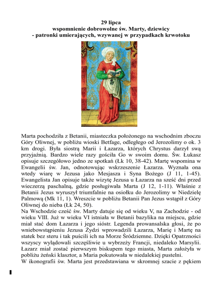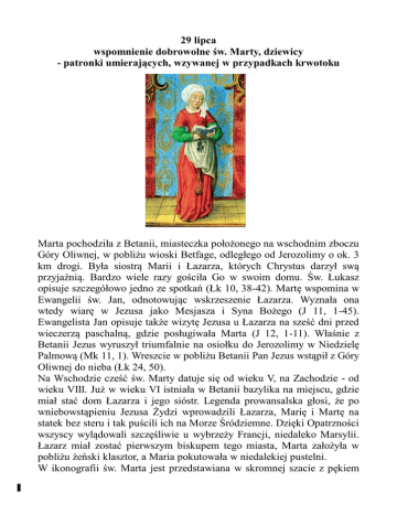 29 lipca wspomnienie dobrowolne św. Marty, dziewicy - patronki umierających, wzywanej w przypadkach krwotoku Marta pochodziła z Betanii, miasteczka położonego na wschodnim zboczu Góry Oliwnej, w pobliżu wioski Betfage, odległego od Jerozolimy o ok. 3 km drogi. Była siostrą Marii i Łazarza, których Chrystus darzył swą przyjaźnią. Bardzo wiele razy gościła Go w swoim domu. Św. Łukasz opisuje szczegółowo jedno ze spotkań (Łk 10, 38-42). Martę wspomina w Ewangelii św. Jan, odnotowując wskrzeszenie Łazarza. Wyznała ona wtedy wiarę w Jezusa jako Mesjasza i Syna Bożego (J 11, 1-45). Ewangelista Jan opisuje także wizytę Jezusa u Łazarza na sześć dni przed wieczerzą paschalną, gdzie posługiwała Marta (J 12, 1-11). Właśnie z Betanii Jezus wyruszył triumfalnie na osiołku do Jerozolimy w Niedzielę Palmową (Mk 11, 1). Wreszcie w pobliżu Betanii Pan Jezus wstąpił z Góry Oliwnej do nieba (Łk 24, 50). Na Wschodzie cześć św. Marty datuje się od wieku V, na Zachodzie - od wieku VIII. Już w wieku VI istniała w Betanii bazylika na miejscu, gdzie miał stać dom Łazarza i jego sióstr. Legenda prowansalska głosi, że po wniebowstąpieniu Jezusa Żydzi wprowadzili Łazarza, Marię i Martę na statek bez steru i tak puścili ich na Morze Śródziemne. Dzięki Opatrzności wszyscy wylądowali szczęśliwie u wybrzeży Francji, niedaleko Marsylii. Łazarz miał zostać pierwszym biskupem tego miasta, Marta założyła w pobliżu żeński klasztor, a Maria pokutowała w niedalekiej pustelni. W ikonografii św. Marta jest przedstawiana w skromnej szacie z pękiem 1 kluczy za pasem, czasami we wspaniałej sukni z koroną na głowie. Często pojawia się na obrazach również z siostrą, św. Marią. Są prezentacje, w których prowadzi smoka na pasku lub kropi go kropidłem. Nawiązują one do legendy, iż pokonała potwora Taraska. Jej atrybutami są: drewniana łyżka, sztućce, księga, naczynie, różaniec. Modlitwy: Wysłuchaj nas, Boże, Zbawicielu nasz, abyśmy weseląc się obchodem uroczystości św. Marty, dziewicy Twojej, z przykładów jej życia uczyli się czynić postęp w pobożności. Przez Pana naszego Jezusa Chrystusa, który króluje w Niebie i na ziemi, po wszystkie wieki wieków. Amen. O cudowna św. Marto uciekam się pod Twoją opiekę, powierzając się Tobie całkowicie o pomoc w moich potrzebach i wsparciu w moich doświadczeniach. Zobowiązuję się tę modlitwę rozpowszechniać. Pocieszaj mnie w smutkach i potrzebach, o co usilnie proszę przez Twoją wielką radość, która napełnia, kiedy w domu Twoim w Betanii gościłaś Zbawiciela świata Jezusa. Proszę Cię, uproś dla mnie i dla mojej rodziny, abyśmy w sercach Boga zachowali, a przez to na lekarstwo w naszych troskach zasłużyli, a szczególnie w aktualnej potrzebie ________________ Ja Ciebie proszę Wspomożycielko we wszystkich potrzebach, pokonaj wszystkie trudności tak jak zwyciężyłaś smoka kładąc go u swoich stóp. Amen Ojcze Nasz... Zdrowaś Maryjo...3x św. Marto proś za nami! 2