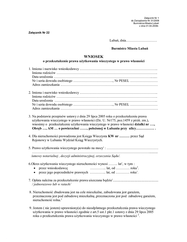 Załącznik Nr 1 do Zarządzenia Nr 31/2008 Burmistrza Miasta Lubań z dnia 01.04.2008r. Załącznik Nr 22 Lubań, dnia……………………… Burmistrz Miasta Lubań WNIOSEK o przekształcenie prawa użytkowania wieczystego w prawo własności 1. Imiona i nazwisko wnioskodawcy ………………………………………………………….. Imiona rodziców ……………………………………………………………………………. Data urodzenia …………………………………………………………………………........ Nr i seria dowodu osobistego …………………………….., Nr PESEL …………………… Adres zamieszkania .………………………………………………………………………… 2. Imiona i nazwisko wnioskodawcy ………………………………………………………….. Imiona rodziców ……………………………………………………………………………. Data urodzenia ……………………………………………………………………………... Nr i seria dowodu osobistego …………………………….., Nr PESEL …………………… Adres zamieszkania …………………………………………………………………………. 3. Na podstawie przepisów ustawy z dnia 29 lipca 2005 roku o przekształceniu prawa użytkowania wieczystego w prawo własności (Dz. U. Nr175, poz.1459 z póżń. zm.), wnosimy o przekształcenie użytkowania wieczystego w prawo własności działki nr …., Obręb …, AM … o powierzchni ……, położonej w Lubaniu przy ulicy……………. . 4. Dla nieruchomości prowadzona jest Księga Wieczysta KW nr ……… przez Sąd Rejonowy w Lubaniu Wydział Ksiąg Wieczystych. 5. Prawo użytkowania wieczystego powstało na mocy1 : ……………………………………… ………………………………………………………………………………………….......... /umowy notarialnej , decyzji administracyjnej, orzeczenia Sądu/. 6.Okres użytkowania wieczystego nieruchomości wynosi …….. lat1, w tym : • przez wnioskodawcę ………….. lat, od ………… roku 1. • przez jego poprzedników prawnych ………….. lat, od ………… roku 1. 7. Opłata należna za przekształcenie prawa uiszczana będzie1..................................................... / jednorazowo lub w ratach/ 8. Nieruchomość zbudowana jest na cele mieszkalne, zabudowana jest garażem, przeznaczona jest pod zabudowę mieszkalną ,przeznaczona jest pod zabudowę garażem, nieruchomość rolna.2 9. Jestem ( nie jestem) uprawniony(a) do nieodpłatnego przekształcenia prawa wieczystego użytkowania w prawo własności zgodnie z art.5 ust.1 pkt.1 ustawy z dnia 29 lipca 2005 roku o przekształceniu prawa użytkowania wieczystego w prawo własności 2. Przedkładam następujące załączniki : • aktualny odpis z Księgi Wieczystej, • dokumenty potwierdzające , że jestem następcom prawnym użytkownika wieczystego; • dokumenty potwierdzające uprawnienie do nieodpłatnego przekształcenia prawa użytkowania wieczystego w prawo własności; * Dokonano wpłaty zaliczki w kasie BGŻ Filia Lubań w kwocie 300,-zł (słownie : trzysta złotych ) na poczet pokrycia kosztów sporządzenia operatu szacunkowego przez rzeczoznawcę majątkowego celem określenia wartość nieruchomości. * Dokonano wpłaty opłaty skarbowej w kwocie 10 zł ( słownie : dziesięć złotych). Lubań, dnia ……………. ( data) …….………………………………….. ( potwierdzenie wpłaty przez przyjmującego wniosek w Urzędzie Miasta- Biuro Obsługi Interesanta ) Oświadczam, że zostałem (łam) poinformowany(a) o przetwarzaniu danych osobowych, celem realizacji wniosku o przekszta łceniu prawa użytkowania wieczystego w prawo własności, a także możliwości przekazania innym podmiotom tj. Rzeczoznawcy Maj ątkowemu, Notariuszowi, Sądowi Rejonowemu. .Zapoznałem (łam) się z prawem wglądu do swoich danych , ich poprawiania oraz sprzeciwu ( lub nie) wobec ich przetwarzania. Podstawa prawna art.24 Ustawy o ochronie danych osobowych z dnia 29 sierpnia 1997r.( Dz. U .Nr 133, poz.883 z późn. zm.). Lubań, dnia ………. …………………………………. ................................................ (p odpis wnioskodawcy ) ( podpis wnioskodawcy) UWAGA ! 1. Dane osobiste wypełnić zgodnie z dowodem osobistym 2. Wniosek z wypełnionymi danymi jak w treści , potwierdzony przez pracownika przyjmującego wniosek w przedmiocie dokonanej wpłaty zaliczki oraz opłaty skarbowej należy złożyć w Biurze Obsługi Interesanta Urzędu Miasta Lubań ul. 7-ej Dywizji 14 , I piętro. 3. Odpis z Księgi wieczystej powinien być aktualny , co do treści. 4. W przypadku współużytkowania wieczystego w częściach ułamkowych , do pozytywnego rozpatrzenia konieczne jest złożenie wniosków przez wszystkich współużytkowników wieczystych ( art.64 § 2 k.p.a., art.199 kc). 5. Zgodnie z art.1 ust.1 pkt.1 lit. a oraz art.6 ust.1 pkt.1 ustawy z dnia 16 listopada 2006 roku o opłacie skarbowej (Dz. U. z 2006 roku nr 225, poz.1635 z póżń. zm.), dokonanie czynności urzędowych podlega opłacie skarbowej z chwilą złożenia wniosku o jej dokonanie . Zapłaty opłaty skarbowej dokonuje się bezgotówkowo na rachunek Urzędu Miasta Lubań. 6. Do ustalenia opłaty za przekształcenie prawa użytkowania wieczystego w prawo własności stosuje się przepisy art. 67 ust.1 i art. 69 ustawy z dnia 21 sierpnia 1997 roku o gospodarce nieruchomościami (tj. Dz.U. z 2004 r., Nr 261, poz.2603 z późn. zm.). 7. W przypadku działek zabudowanych lub przeznaczonych na cele mieszkaniowe przy zapłacie jednorazowej stosowana jest 90 % bonifikata od należnej opłaty z tytułu przekształcenia prawa użytkowania wieczystego w prawo własności. Istnieje możliwość rozłożenia opłaty z tytułu przekształcenia na raty na czas nie krót