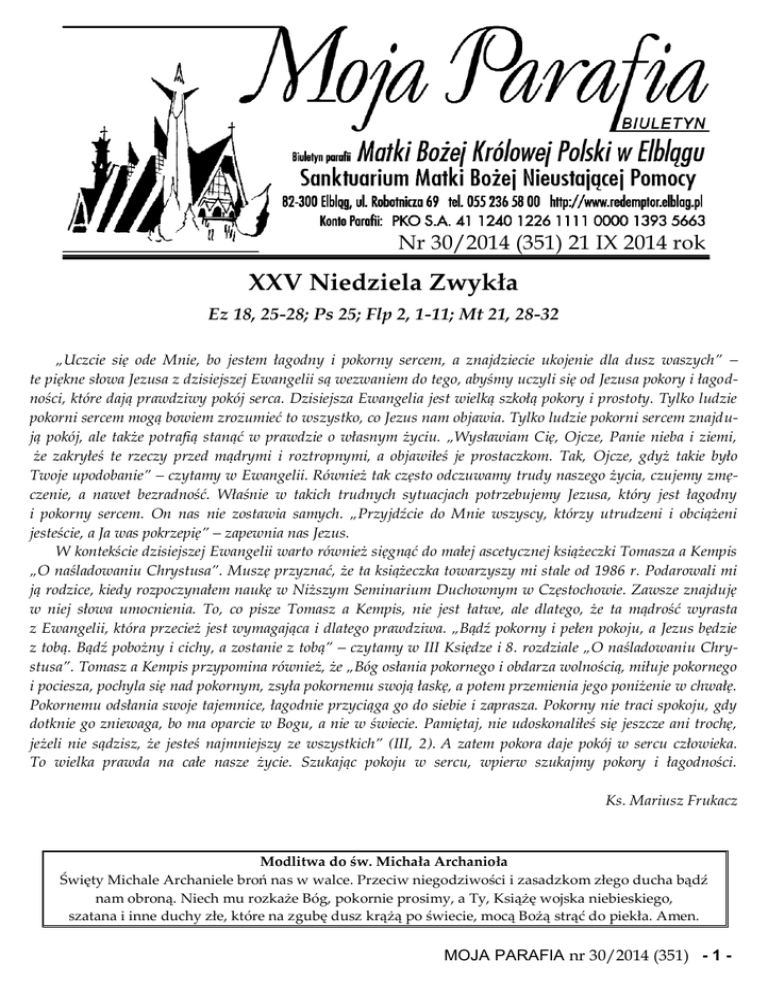 Nr 30/2014 (351) 21 IX 2014 rok I XXV Niedziela Zwykła Ez 18, 25-28; Ps 25; Flp 2, 1-11; Mt 21, 28-32 „Uczcie się ode Mnie, bo jestem łagodny i pokorny sercem, a znajdziecie ukojenie dla dusz waszych” – te piękne słowa Jezusa z dzisiejszej Ewangelii są wezwaniem do tego, abyśmy uczyli się od Jezusa pokory i łagodności, które dają prawdziwy pokój serca. Dzisiejsza Ewangelia jest wielką szkołą pokory i prostoty. Tylko ludzie pokorni sercem mogą bowiem zrozumieć to wszystko, co Jezus nam objawia. Tylko ludzie pokorni sercem znajdują pokój, ale także potrafią stanąć w prawdzie o własnym życiu. „Wysławiam Cię, Ojcze, Panie nieba i ziemi, że zakryłeś te rzeczy przed mądrymi i roztropnymi, a objawiłeś je prostaczkom. Tak, Ojcze, gdyż takie było Twoje upodobanie” – czytamy w Ewangelii. Również tak często odczuwamy trudy naszego życia, czujemy zmęczenie, a nawet bezradność. Właśnie w takich trudnych sytuacjach potrzebujemy Jezusa, który jest łagodny i pokorny sercem. On nas nie zostawia samych. „Przyjdźcie do Mnie wszyscy, którzy utrudzeni i obciążeni jesteście, a Ja was pokrzepię” – zapewnia nas Jezus. W kontekście dzisiejszej Ewangelii warto również sięgnąć do małej ascetycznej książeczki Tomasza a Kempis „O naśladowaniu Chrystusa”. Muszę przyznać, że ta książeczka towarzyszy mi stale od 1986 r. Podarowali mi ją rodzice, kiedy rozpoczynałem naukę w Niższym Seminarium Duchownym w Częstochowie. Zawsze znajduję w niej słowa umocnienia. To, co pisze Tomasz a Kempis, nie jest łatwe, ale dlatego, że ta mądrość wyrasta z Ewangelii, która przecież jest wymagająca i dlatego prawdziwa. „Bądź pokorny i pełen pokoju, a Jezus będzie z tobą. Bądź pobożny i cichy, a zostanie z tobą” – czytamy w III Księdze i 8. rozdziale „O naśladowaniu Chrystusa”. Tomasz a Kempis przypomina również, że „Bóg osłania pokornego i obdarza wolnością, miłuje pokornego i pociesza, pochyla się nad pokornym, zsyła pokornemu swoją łaskę, a potem przemienia jego poniżenie w chwałę. Pokornemu odsłania swoje tajemnice, łagodnie przyciąga go do siebie i zaprasza. Pokorny nie traci spokoju, gdy dotknie go zniewaga, bo ma oparcie w Bogu, a nie w świecie. Pamiętaj, nie udoskonaliłeś się jeszcze ani trochę, jeżeli nie sądzisz, że jesteś najmniejszy ze wszystkich” (III, 2). A zatem pokora daje pokój w sercu człowieka. To wielka prawda na całe nasze życie. Szukając pokoju w sercu, wpierw szukajmy pokory i łagodności. Ks. Mariusz Frukacz Modlitwa do św. Michała Archanioła Święty Michale Archaniele broń nas w walce. Przeciw niegodziwości i zasadzkom złego ducha bądź nam obroną. Niech mu rozkaże Bóg, pokornie prosimy, a Ty, Książę wojska niebieskiego, szatana i inne duchy złe, które na zgubę dusz krążą po świecie, mocą Bożą strąć do piekła. Amen. MOJA PARAFIA nr 30/2014 (351) - 1 - Kyrie (Ks. Jerzy Szymik) Panie, jest inaczej niż być miało ani góry, ani morwy nie rzucają się w morze na moje słowo nieustannie idzie na burzę, nieustannie czerwieni się zasępione niebo. fale zalewają łódź. a wichry i jezioro nigdy nie są mi posłuszne mam kilka ryb, siedem chlebów i nieskończoną wielość głodnych do wykarmienia dotykałem tylekroć Twojego płaszcza, a nie jestem zdrowy Ojciec Niebieski ma coraz mniej pracy z liczeniem moich włosów a jestem w gorszym położeniu niż Jair, bo nie mam córki mam oczy, a nie widzę, mam uszy, a nie słyszę; często też wpadam w ogień i w wodę moje oczy wilgotnieją nieraz, ale nie od twojej śliny, stąd też widzę niewyraźnie ani odcięta prawica, ani wyłupione oko nie uczyniły mnie lepszym tęsknię za Tobą. Ulituj się nade mną. Jeśli chcesz, możesz mnie oczyścić Czcigodny Ojcze Stanisławie! Z okazji zacnego Jubileuszu 50 – lecia Święceń Kapłańskich, życzymy Ci wielkiej radości z każdego dnia kapłańskiej służby, Bożego Błogosławieństwa i obfitości darów Ducha Świętego. Niech dobry Bóg darzy Cię zdrowiem i pokojem, a Matka Boża ma w Swej opiece i wyprasza potrzebne łaski, abyś dalej z odwagą i mocą kroczył po trudnych i pięknych ścieżkach kapłańskiego życia. Życzymy, abyś głosił Słowo Boże, sprawował Sakramenty Święte, a swoim działaniem i świadectwem życia pomnażał w nas, do których i wśród których Pan Cię posłał, pragnienie zażyłości z Jezusem Chrystusem. W pięćdziesiątą rocznicę dnia, w którym sam Pan Bóg uczynił z Ciebie swojego sługę, otaczamy Cię naszą modlitwą. Dziękujemy dziś Panu Bogu za Twoją obecność wśród nas, za wszystko dobro, które się stało naszym udziałem, za czas, siły i talenty, którymi służysz ludziom. Z braterskim i chrześcijańskim pozdrowieniem oraz nadzieją na Kapłańskie Błogosławieństwo wdzięczni Współbracia i Parafianie Kancelaria Parafialna czynna od wtorku do piątku w godz. 1000 – 1200 i 1600 – 1730. Sprawy związane z pogrzebem można zgłaszać w każdym dniu. Uwaga kandydaci do sakramentu bierzmowania! Rok II (Kandydaci, którzy ukończyli I rok przygotowania do sakramentu bierzmowania w roku szkolnym 2013/2014) – zapisy w niedzielę 28 września po Mszy św. o godz. 1830. Spotkania Młodzieży w naszej Parafii W każdą niedzielę! Najpiękniejsze spotkanie! Godzina 1830 Msza św. dla młodzieży W każdą niedzielę o godz. 1700 – Młodzieżowy Zespół Muzyczny W każdy piątek o godz. 1900 – spotkanie Wspólnoty młodzieżowej Ruch Światło Życie W każdy czwartek o godz. 1845 – spotkanie grupy Modlitewno – Ewangelizacyjnej W każdy wtorek o godz. 1900 – spotkanie dla młodzieży MOJA PARAFIA nr 30/2014 (351) Do użytku wewnętrznego - 2 - Intencje mszalne 7:00 8:00 18:00 Karmel 7:00 8:00 18:00 Karmel 7:00 8:00 18:00 Karmel 7:00 8:00 18:00 Karmel 7:00 8:00 18:00 Karmel 7:00 8:00 11:00 18:00 Karmel 7:00 8:30 10:00 11:30 13:00 16:30 18:30 Karm