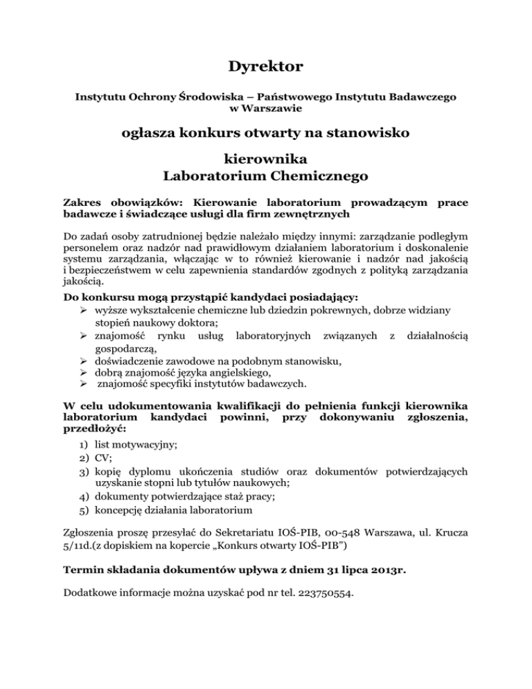 Dyrektor Instytutu Ochrony Środowiska – Państwowego Instytutu Badawczego w Warszawie ogłasza konkurs otwarty na stanowisko kierownika Laboratorium Chemicznego Zakres obowiązków: Kierowanie laboratorium prowadzącym prace badawcze i świadczące usługi dla firm zewnętrznych Do zadań osoby zatrudnionej będzie należało między innymi: zarządzanie podległym personelem oraz nadzór nad prawidłowym działaniem laboratorium i doskonalenie systemu zarządzania, włączając w to również kierowanie i nadzór nad jakością i bezpieczeństwem w celu zapewnienia standardów zgodnych z polityką zarządzania jakością. Do konkursu mogą przystąpić kandydaci posiadający:  wyższe wykształcenie chemiczne lub dziedzin pokrewnych, dobrze widziany stopień naukowy doktora;  znajomość rynku usług laboratoryjnych związanych z działalnością gospodarczą,  doświadczenie zawodowe na podobnym stanowisku,  dobrą znajomość języka angielskiego,  znajomość specyfiki instytutów badawczych. W celu udokumentowania kwalifikacji do pełnienia funkcji kierownika laboratorium kandydaci powinni, przy dokonywaniu zgłoszenia, przedłożyć: 1) list motywacyjny; 2) CV; 3) kopię dyplomu ukończenia studiów oraz dokumentów potwierdzających uzyskanie stopni lub tytułów naukowych; 4) dokumenty potwierdzające staż pracy; 5) koncepcję działania laboratorium Zgłoszenia proszę przesyłać do Sekretariatu IOŚ-PIB, 00-548 Warszawa, ul. Krucza 5/11d.(z dopiskiem na kopercie „Konkurs otwarty IOŚ-PIB”) Termin składania dokumentów upływa z dniem 31 lipca 2013r. Dodatkowe informacje można uzyskać pod nr tel. 223750554.