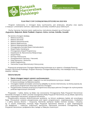 ZHP Chorągiew Białostocka PLAN PRACY ZHP CHORĄGWI BIAŁOSTOCKIEJ NA 2015 ROK Program realizowany w chorągwi służy wychowaniu, jest atrakcyjny, aktualny oraz oparty o tradycje i uniwersalne wartości, odpowiada na potrzeby wszelkich grup wiekowych. Zuchy, harcerze, harcerze starsi, wędrownicy, instruktorzy skupieni są w 8 hufcach: Augustów, Białystok, Bielsk Podlaski, Grajewo, Kolno, Łomż Łomża, Sokółka, Suwałki. Na terenie chorągwi działają: • Referat Zuchowy, • Referat Harcerski. • Referat Starszoharcerski, • Referat Wędrowniczy, • Referat Nieprzetartego Szlaku • Chorągwiana Komisja Stopni Instruktorskich, • Zespół Kadry Kształcącej, • Chorągwiany Zespół Programowy • Inspektorat ds. Ratownictwa Medycznego, • Zespół Pilota, • Komisja Historyczna, • Duszpasterstwo Harcerzy i Harcerek, • Krąg Starszyzny i Seniorów, • Zespół Zagraniczny, • Harcerska Grupa Rekonstrukcji Historycznej. Propozycje programowe Chorągwi Białostockiej budowane są w oparciu o Strategię Rozwoju Związku Harcerstwa Polskiego, Program Rozwoju Chorągwi Białostockiej, oraz działające przy chorągwi zespoły i referaty. Główne kierunki: 1. Patron chorągwi naszym wzorem wychowawczym. • Zrealizowanie nowych zadań, mających na celu przybliżenie życiorysu i działań R. Kaczorowskiego na Białostocczyźnie. • Chorągiew będzie prowadzić utworzoną zakładkę na stronie internetowej, na której pojawią się propozycje programowe dotyczące patrona Chorągwi. • Przygotowana zostanie propozycja programowa dotycząca patrona Chorągwi do wykorzystania podczas tegorocznych zimowisk Przyjaciele – ludzie, którzy są blisko nas (utworzenie Chorągwianej Rady Przyjaciół Harcerstwa). Komenda Chorągwi w 2015r. powoła Chorągwianą Radę Przyjaciół Harcerstwa, do jej składu zaprosimy osoby wspierające harcerstwo, przyjaciół harcerstwa. Przygotowane zostanie okolicznościowe spotkanie, na którym podpisany będzie akt powołujący Radę. Uroczystość zostanie przygotowana pod kątem programowym, organizacyjnym, medialnym i z pełną oprawą słowno – muzyczną. Komenda zachęcać będzie również szczepy i drużyny, by w swoim środowisku tworzyły Kręgi Przyjaciół Harcerstwa złożone z osób wspierających ich działalność – rodziców, znajomych, sponsorów. Planowane powołanie Chorągwianej Rady Przyjaciół Harcerstwa i podpisanie aktu nastąpi w Pałacyku Gościnnym. 2. Patriotyzm, historia, tradycja w życiu każdej drużyny, szczepu, hufca i chorągwi. • 152. rocznica wybuchu Powstania Styczniowego 1863 r. 7.03.2015 r. W 2015 r. mija 152 lat od wybuchu Powstania Styczniowego 1863 r. Chorągiew podejmie działania związane z obchodami tej rocznicy. Weźmie udział w obchodach państwowych i patriotycznych. Jak co roku odbędzie się Rajd Powstańców Styczniowych 1863 r., podczas którego środowiska harcerskie będą miały możliwość lepszego poznania historii związanej z tym wydarzeniem. Zwycięskim drużynom na każdej z tras zostaną przyznane statuetki powstańca, a zwycięska drużyna ze wszystkich tras otrzyma powstańcze kosy, które są od wielu lat nagrodą przechodnią. Tradycyjnie Dzwon Wolności uderzy 152 razy oddając w ten sposób hołd poległym powstańcom. Rajd będzie odbywał się na czterech trasach przygotowanych dla poszczególnych grup metodycznych. • Chorągiew współtworzyć będzie inicjatywy patriotyczno – religijne z okazji 152. rocznicy wybuchu Powstania Styczniowego 1863 r., 70. rocznicy wybuchu Powstania Warszawskiego, 71. rocznicy śmierci dh. Zenka Borowskiego – „Obrońcy polskiej książki”, 19 lutego – rocznicy odzyskania niepodległości przez Białystok, rocznicy uchwalenia Konstytucji 3. Maja, rocznicy odzyskania Niepodległości przez Polskę 11 listopada, rocznicy wybuchu II wojny światowej, 17 września – rocznica sowieckiej agresji na Polskę, 70. Rocznica powstania pierwszych drużyn harcerskich po wojnie. • Chorągiew w ramach promocji postaw patriotycznych podejmie próbę promocji osoby Bł. Jerzego Popiełuszki w ramach wędrówki drużyn śladami świętego. • Chorągiew podejmie działania promocji autorytetów przez ukazanie w propozycjach programowych postaci bohaterów hufców. 3. Obozy i zimowiska harcerskie. Komenda Chorągwi będzie dążyła do tego, aby drużyny, szczepy i hufce prowadziły własne obozy i zimowiska. Pozwoli to zachować ciągłość pracy śródrocznej. Przygotowane zostaną niezbędne materiały programowe, a także kadra zostanie do tego przeszkolona. Będzie to pomocne w podsumowaniu rocznej pracy każdego środowiska. Chorągiew wesprze harcerzy w działaniach zmierzających do udziału w InterCamp. Kadra będzie mobilizowana do udziału w Ogólnopolskim Zlocie Kadry. 4. Obóz chorągwi – integracja środowisk harcerskich harcerskich Chorągwi Białostockiej. Komenda Chorągwi ponownie zaproponuje tym razem dwa obozy chorągwi. Pozwoli nam to na integrację różnych środowisk harcerskich Chorągwi Białostockiej. 5. Akcja 1% podatku dla ZHP. Komenda Chorągwi pomoże środowiskom harcerskim w przygotowaniu i realizacji akcji 1% dla ZHP. Przygotuje i wydrukuje foldery zachęcające podatników do przeznaczania 1% na poszczególne środowiska Chorągwi Białostockiej. Umieszczenie banerów na chorągwianych portalach internetowych.. 6. Pozyskiwanie kadry wśród wśród osób dorosłych 35+ Chorągiew zaproponuje hufcom działania na rzecz pozyskiwania kandydatów do pełnienia funkcji drużynowych, zachęcania osób dorosłych do podejmowania pracy wolontariackiej w ZHP. Propozycja powinna dotyczyć byłych harcerzy i harcerek oraz osób nie związanych z ZHP. (Uchwała XXXVII Zjazdu ZHP) 7. Wzmocnienie roli harcerskich specjalności w programie wychowania ZHP Chorągiew podejmie działania wzmacniające rolę harcerskich specjalności w procesie wychowawczym ZHP poprzez wsparcie organizacji zawodów specjalnoś