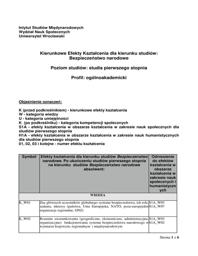 Intytut Studiów Międynarodowych Wydział Nauk Społecznych Uniwersytet Wrocławski Kierunkowe Efekty Kształcenia dla kierunku studiów: Bezpieczeństwo narodowe Poziom studiów: studia pierwszego stopnia Profil: ogólnoakademicki Objaśnienie oznaczeń: K (przed podkreślnikiem) - kierunkowe efekty kształcenia W - kategoria wiedzy U - kategoria umiejętności K (po podkreślniku) - kategoria kompetencji społecznych S1A - efekty kształcenia w obszarze kształcenia w zakresie nauk społecznych dla studiów pierwszego stopnia H1A - efekty kształcenia w obszarze kształcenia w zakresie nauk humanistycznych dla studiów pierwszego stopnia 01, 02, 03 i kolejne - numer efektu kształcenia Symbol Efekty kształcenia dla kierunku studiów Bezpieczeństwo Odniesienie narodowe. Po ukończeniu studiów pierwszego stopnia do efektów na kierunku studiów Bezpieczeństwo narodowe kształcenia w absolwent: obszarze kształcenia w zakresie nauk społecznych i humanistyczn ych WIEDZA K_W01 Zna głównych uczestników globalnego systemu bezpieczeństwa, ich role, S1A_W03 zadania, interesy (państwa, Unia Europejska, NATO, poza-europejskie S1A_W07 organizacje regionalne, ONZ) K_W02 Rozumie uwarunkowania (geograficzne, ekonomiczne, administracyjne, S1A_W03 organizacyjne) funkcjonowania systemu bezpieczeństwa narodowego w S1A_W02 wymiarze krajowym, regionalnym i międzynarodowym Strona 1 z 6 Symbol Efekty kształcenia dla kierunku studiów Bezpieczeństwo Odniesienie narodowe. Po ukończeniu studiów pierwszego stopnia do efektów na kierunku studiów Bezpieczeństwo narodowe kształcenia w absolwent: obszarze kształcenia w zakresie nauk społecznych i humanistyczn ych K_W03 Rozumie przyczyny i skutki występowania zjawisk społeczno- S1A_W05 ekonomicznych na poziomie mikro- i makroekonomicznym w kontekście S1A_W08 bezpieczeństwa narodowego S1A_W11 K_W04 Zna zasady organizacyjne oraz instrumenty europejskiego systemu S1A_W02 bezpieczeństwa (w tym w wymiarze militarnym) S1A_W07 K_W05 Rozumie powiązania pomiędzy systemem prawnym i polityką S1A_W07 bezpieczeństwa na poziomie ponadnarodowym (Unia Europejska, NATO, S1A_W08 współpraca dwustronna i wielostronna) a ich występowaniem na poziomie krajowym Charakteryzuje procesy wewnętrzne oraz mechanizmy działania S1A_W02 podstawowych modeli systemów bezpieczeństwa w różnych krajach, S1A_W07 potrafi opisywać ich relacje z otoczeniem międzynarodowym K_W06 K_W07 K_W08 Zna i rozumie charakter oraz konsekwencje zagrożeń nie państwowych S1A_W05 oraz nie-militarnych dla bezpieczeństwa w wymiarze państwowym i S1A_W09 międzynarodowym Zna podstawowe prawa i wolności obywatela oraz ich konstytucyjne S1A_W07 gwarancje K_W09 Rozumie pojęcie i istotę bezpieczeństwa (strukturę bezpieczeństwa, S1A_W01 poziomy identyfikacji bezpieczeństwa, obszary problemowe, współczesne S1A_W06 uwarunkowania bezpieczeństwa) K_W10 Posiada wiedzę na temat dynamiki struktur społecznych i procesów w ich S1A_W03 obrębie zachodzących S1A_W04 K_W11 Zna i rozumie mechanizmy oraz reguły strategii komunikowania oraz S1A_W04 zachowania się jednostek i zespołów ludzkich w sytuacjach zagrożenia S1A_W05 K_W13 Zna podział zadań i kompetencji organów władzy publicznej oraz S1A_W02 instytucji państwa w sytuacjach kryzysowych S1A_W03 S1A_W07 Rozumie problemy zarządzania zespołami ludzkimi oraz instytucjami w S1A_W05 społeczeństwie S1A_W11 K_W14 K_W15 Definiuje podstawowe zagadnienia z zakresu funkcjonowania i S1A_W02 organizacji systemu bezpieczeństwa narodowego Rzeczypospolitej S1A_W07 Polskiej, w tym systemu obronnego państwa S1A_W08 K_W16 Zna konstytucyjne podstawy normatywne zapewnienia bezpieczeństwa w S1A_W07 Polsce, potrafi wyjaśniać takie kategorie jak: stan wojenny, stan wyjątkowy, stan klęski żywiołowej, stan wojny Symbol K_W17 K_W18 K_W19 K_W20 Efekty kształcenia dla kierunku studiów Bezpieczeństwo Odniesienie narodowe. Po ukończeniu studiów pierwszego stopnia do efektów na kierunku studiów Bezpieczeństwo narodowe kształcenia w absolwent: obszarze kształcenia w zakresie nauk społecznych i humanistyczn ych Charakteryzuje elementarne problemy polityczne, ekonomiczne, S1A_W08 społeczne, kulturowe na terenie ziem polskich w perspektywie S1A_W09 historycznej Posiada podstawową wiedzę dotyczącą genezy, struktury i S1A_W09 funkcjonowania państwa S1A_W07 Ma wiedzę o polityce jako podstawowym zjawisku społecznym oraz S1A_W01 różnych sposobach myślenia politycznego S1A_W09 Zna mechanizmy powstawania, eskalacji i rozwiązywania konfliktów S1A_W03 politycznych, społecznych i militarnych S1A_W05 K_W21 Dostrzega i wyjaśnia rolę kultury, religii, etyki w procesach przemian S1A_W05 współczesnej cywilizacji S1A_W07 K_W22 Dostrzega i wyjaśnia znaczenie właściwego przywództwa współczesnej polityce wewnętrznej i międzynarodowej K_W23 Charakteryzuje i wyjaśnia historyczną ewolucję struktury bezpieczeństwa S1A_W03 (w tym struktur militarnych) w ujęciu narodowym i międzynarodowym S1A_W08 K_W24 Opisuje kierunki przeobrażeń zachodzących we współczesnym świecie S1A_W02 (m.in. procesy rozwoju demokratyzacji, rozwoju społeczeństwa S1A_W08 informacyjnego, integracji gospodarczej, wzajemne przenikanie się S1A_W09 kultur) Zna teoretyczne podstawy i metodologię badań bezpieczeństwa (aparat S1A_W01 pojęciowy, metody analizy, kolejność stosowania metod, strukturę badań, S1A_W06 zasadę systemowości, zasadę wzajemnych powiązań i zależności) K_W25 K_W26 K_W27 K_W28 K_W29 K_W30 K_W31 we S1A_W02 S1A_W09 Dostrzega związek nauki o bezpieczeństwie z innymi dyscyplinami S1A_W01 naukowymi Ma wiedzę dotyczącą relacji międzynarodowych, w tym problemów S1A_W03 polityczno-gospodarczych świata Zna podstawy teorii ryzyka i zarządzania nim oraz podstawowe modele i S1A_W08 metody stosowane w analizie i ocenie ryzyka na poziomie jednostkowym, S1A_W11 grupowym, państwowym i międzynarodowym Wskazuje podstawowe ró