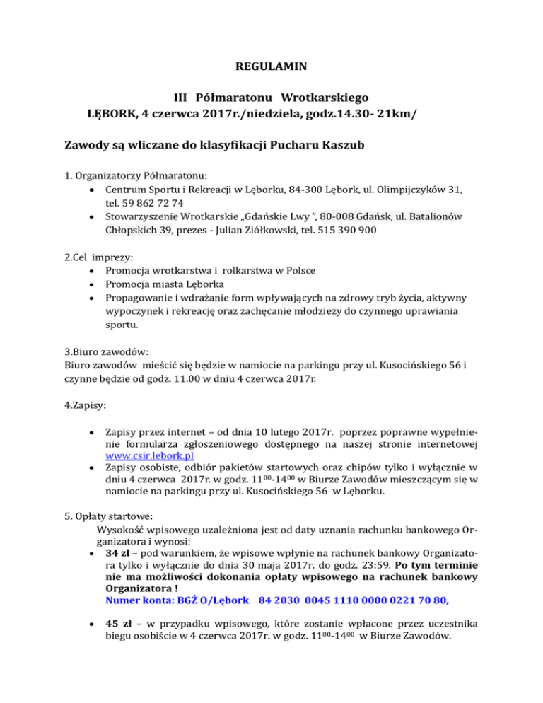 REGULAMIN III Półmaratonu Wrotkarskiego LĘBORK, 4 czerwca 2017r./niedziela, godz.14.30- 21km/ Zawody są wliczane do klasyfikacji Pucharu Kaszub 1. Organizatorzy Półmaratonu: Centrum Sportu i Rekreacji w Lęborku, 84-300 Lębork, ul. Olimpijczyków 31, tel. 59 862 72 74 Stowarzyszenie Wrotkarskie „Gdańskie Lwy ”, 80-008 Gdańsk, ul. Batalionów Chłopskich 39, prezes - Julian Ziółkowski, tel. 515 390 900 2.Cel imprezy: Promocja wrotkarstwa i rolkarstwa w Polsce Promocja miasta Lęborka Propagowanie i wdrażanie form wpływających na zdrowy tryb życia, aktywny wypoczynek i rekreację oraz zachęcanie młodzieży do czynnego uprawiania sportu. 3.Biuro zawodów: Biuro zawodów mieścić się będzie w namiocie na parkingu przy ul. Kusocińskiego 56 i czynne będzie od godz. 11.00 w dniu 4 czerwca 2017r. 4.Zapisy: Zapisy przez internet – od dnia 10 lutego 2017r. poprzez poprawne wypełnienie formularza zgłoszeniowego dostępnego na naszej stronie internetowej www.csir.lebork.pl Zapisy osobiste, odbiór pakietów startowych oraz chipów tylko i wyłącznie w dniu 4 czerwca 2017r. w godz. 1100-1400 w Biurze Zawodów mieszczącym się w namiocie na parkingu przy ul. Kusocińskiego 56 w Lęborku. 5. Opłaty startowe: Wysokość wpisowego uzależniona jest od daty uznania rachunku bankowego Organizatora i wynosi: 34 zł – pod warunkiem, że wpisowe wpłynie na rachunek bankowy Organizatora tylko i wyłącznie do dnia 30 maja 2017r. do godz. 23:59. Po tym terminie nie ma możliwości dokonania opłaty wpisowego na rachunek bankowy Organizatora ! Numer konta: BGŻ O/Lębork 84 2030 0045 1110 0000 0221 70 80, 45 zł – w przypadku wpisowego, które zostanie wpłacone przez uczestnika biegu osobiście w 4 czerwca 2017r. w godz. 1100-1400 w Biurze Zawodów. Opłata startowa w przypadku rezygnacji z uczestnictwa w zawodach nie podlega zwrotowi bez względu na przyczynę nieuczestniczenia. Zawodnicy z Lęborka w biegu głównym są zwolnieni z opłaty wpisowego ! Od dzieci do lat 16 nie pobiera się opłaty wpisowego ! 6.Dystanse i terminy: 4 czerwca 2017 - III Półmaraton Wrotkarski, dystans 21km start główny godz. 14.30 /limit czasowy wynosi 120 minut/ Biegi dla dzieci: - do lat 10 - dystans ok. 600 metrów - start godz. 14.00 - 11-12 lat - dystans ok. 600 metrów - start godz. 14.00 -13-16 lat - dystans ok. 1150 metrów - start godz.14.10 TRASA Zawody zostaną rozegrane w Lęborku - start i meta przy Pływalni Miejskiej „Rafa” u zbiegu ulic Kusocińskiego i Olimpijczyków. Trasa wyścigu głównego będzie przebiegała ulicami: Kusocińskiego, Teligi, Kusocińskiego. Trasa jest lewoskrętna, czyli więcej zakrętów jest w lewo. Jedna pętla liczy ok. 2.0 km - zawodnicy będą mieli do przejechania 11 pętli. Trasa o dobrym jakościowo asfalcie przebiega w terenie zabudowań i obszarze rekreacyjnym. 7.Udział w zawodach: W zawodach może wziąć udział każdy bez ograniczenia wieku, a w biegu na 21 km ten kto ukończył 16 lat, posiada aktualne badania lekarskie, bądź podpisze oświadczenie o zdolności i braku przeciwwskazań do biegu oraz zapoznał się z Regulaminem zawodów i zaakceptował go. Dzieci do 18 roku życia muszą posiadać pisemną zgodę rodziców lub opiekunów na start w zawodach. 8.Pomiar elektroniczny: Pomiar elektroniczny zapewnia firma DOM-TEL ze Słupska. 9.Zasady uczestnictwa: Wszyscy zawodnicy są zobowiązani do startu w kasku ochronny ! Wskazane są także ochraniacze na ręce i nogi. Każdy zawodnik otrzyma numer startowy oraz chip, który należy zamocować na bucie i jest to niezbędne dla poprawnego rejestrowania czasu przejazdu przez system firmy DOM-TEL. W biegu głównym obowiązuje limit czasu wynoszący 120 minut. Z uwagi na to, iż zawodnicy jeżdżą po stosunkowo krótkiej pętli, dlatego wyprzedzani uczestnicy winni trzymać się prawej strony drogi i umożliwić wyprzedzenie się przez nadjeżdżających z tyłu. Dla ostrzeżenia wyprzedzanych, zawodnik, który chce wyprzedzić może stosować ostrzegawcze okrzyki typu: ”UWAGA”, ”LEWA WOLNA”, ”LEWA IDZIE” lub inne – eliminujemy w ten sposób możliwość kolizji. Zawodnicy muszą zachować szczególną ostrożność przy wyprzedzaniu i wymijaniu jadących z przeciwka! Podczas zawodów uczestnik powinien stosować się do poleceń sędziów, osób odpowiedzialnych za bezpieczeństwo, służb porządkowych ,Policji, Straży Gminnej, Straży Granicznej, Pożarnej i Leśnej. Za skracanie trasy zawodnik zostanie zdyskwalifikowany. Po przekroczeniu limitu czasu zawodnik musi zejść z jezdni i zdjąć numer startowy. Obowiązuje szeroko pojęte sportowe zachowanie zawodników ! Trasa przebiega przez miejscowości, przy ruchu zamkniętym, ale mogą się zdarzyć nagłe przypadki zagrożenia życia co wiąże się z wjazdem samochodu karetki pogotowia ratunkowego, straży pożarnej, gminnej, granicznej, leśnej, Policji - zawodnicy obowiązani są udostępnić przejazd tym służbom. Ostateczna decyzja w rozwiązywaniu sporów i interpretacja niniejszego regulaminu należy do organizatorów biegu. Numer startowy powinien być przypięty na klatce piersiowej zawodnika lub spodenkach na prawym udzie. 10.Klasyfikacje: Biegi dziecięce: - dzieci do lat 10 włącznie - chłopcy i dziewczęta - start wspólny, - dzieci 11-12 lat - chłopcy i dziewczęta - start wspólny, - dzieci 13 do 16 lat - chłopcy i dziewczęta - start wspólny, Bieg główny: - klasyfikacja generalna kobiet i mężczyzn - start wspólny. -klasyfikacje wiekowe kobiet i mężczyzn: 16 – 19 20 – 29 30 – 39 40 – 49 50 – 59 60 – 69 70 i powyżej 11. Nagrody: Biegi dziecięce: każdy uczestnik otrzymuje pamiątkowy medal i słodycze Bieg główny: każdy uczestnik, który ukończy bieg otrzymuje pamiątkowy medal W klasyfikacji generalnej mężczyzn i kobiet za pierwsze trzy miejsca przyznawane są nagrody finansowe oraz pamiątkowe puchary i dyplomy: Klasyfikacja generalna (mężczyzn i kobiet): I I