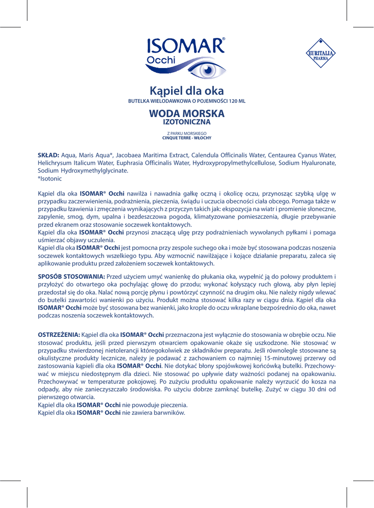 Kąpiel dla oka BUTELKA WIELODAWKOWA O POJEMNOŚCI 120 ML WODA MORSKA IZOTONICZNA Z PARKU MORSKIEGO CINQUE TERRE - WŁOCHY SKŁAD: Aqua, Centaurea SKŁAD: Aqua, Maris Maris Aqua*, Aqua*, Jacobaea JacobaeaMaritima MaritimaExtract, Extract,Calendula CalendulaOfficinalis OfficinalisFlower Water, Water, Centaurea CyanusCyanus Water, Flower Water,Italicum Helichrysum Italicum Flower Water, Euphrasia Officinalis Flower/Leaf/Stem Water, HydroxypropylHelichrysum Water, Euphrasia Officinalis Water, Hydroxypropylmethylcellulose, Sodium Hyaluronate, methylcellulose, Sodium Hyaluronate, Sodium Hydroxymethylglycinate. Sodium Hydroxymethylglycinate. *Isotonic Kąpiel dla oka ISOMAR® Occhi nawilża i nawadnia gałkę oczną i okolicę oczu, przynosząc szybką ulgę w przypadku zaczerwienienia, podrażnienia, pieczenia, świądu i uczucia obecności ciała obcego. Pomaga także w przypadku łzawienia i zmęczenia wynikających z przyczyn takich jak: ekspozycja na wiatr i promienie słoneczne, zapylenie, smog, dym, upalna i bezdeszczowa pogoda, klimatyzowane pomieszczenia, długie przebywanie przed ekranem oraz stosowanie soczewek kontaktowych. Kąpiel dla oka ISOMAR® Occhi przynosi znaczącą ulgę przy podrażnieniach wywołanych pyłkami i pomaga uśmierzać objawy uczulenia. Kąpiel dla oka ISOMAR® Occhi jest pomocna przy zespole suchego oka i może być stosowana podczas noszenia soczewek kontaktowych wszelkiego typu. Aby wzmocnić nawilżające i kojące działanie preparatu, zaleca się aplikowanie produktu przed założeniem soczewek kontaktowych. SPOSÓB STOSOWANIA: Przed użyciem umyć wanienkę do płukania oka, wypełnić ją do połowy produktem i przyłożyć do otwartego oka pochylając głowę do przodu; wykonać kołyszący ruch głową, aby płyn lepiej przedostał się do oka. Nalać nową porcję płynu i powtórzyć czynność na drugim oku. Nie należy nigdy wlewać do butelki zawartości wanienki po użyciu. Produkt można stosować kilka razy w ciągu dnia. Kąpiel dla oka ISOMAR® Occhi może być stosowana bez wanienki, jako krople do oczu wkraplane bezpośrednio do oka, nawet podczas noszenia soczewek kontaktowych. OSTRZEŻENIA: Kąpiel dla oka ISOMAR® Occhi przeznaczona jest wyłącznie do stosowania w obrębie oczu. Nie stosować produktu, jeśli przed pierwszym otwarciem opakowanie okaże się uszkodzone. Nie stosować w przypadku stwierdzonej nietolerancji któregokolwiek ze składników preparatu. Jeśli równolegle stosowane są okulistyczne produkty lecznicze, należy je podawać z zachowaniem co najmniej 15-minutowej przerwy od zastosowania kąpieli dla oka ISOMAR® Occhi. Nie dotykać błony spojówkowej końcówką butelki. Przechowywać w miejscu niedostępnym dla dzieci. Nie stosować po upływie daty ważności podanej na opakowaniu. Przechowywać w temperaturze pokojowej. Po zużyciu produktu opakowanie należy wyrzucić do kosza na odpady, aby nie zanieczyszczało środowiska. Po użyciu dobrze zamknąć butelkę. Zużyć w ciągu 30 dni od pierwszego otwarcia. Kąpiel dla oka ISOMAR® Occhi nie powoduje pieczenia. Kąpiel dla oka ISOMAR® Occhi nie zawiera barwników. Kąpiel dla oka INNOWACYJNY PRODUKT stworzony w oparciu o badania metodami biologii molekularnej Izotoniczna woda morska zawarta w kąpieli dla oka ISOMAR® Occhi ma właściwości fizykochemiczne porównywalne z właściwościami ludzkich płynów ustrojowych, a zatem i łez. Jest izoosmotyczna względem komórek, a dzięki przenoszeniu zawartych w niej jonów stanowi prawdziwie odżywczą substancję dla spojówki. Izotoniczna woda morska używana w roztworze kąpieli dla oka ISOMAR® Occhi dzięki swojej wyjątkowej czystości (ujęcie znajduje się w Parku Morskim Cinque Terre) jest szybko filtrowana przez akwaporyny, co umożliwia szybkie ponowne nawilżenie tkanek tworzących worek spojówkowy. Sole mineralne rozpuszczone w tej wodzie są identyczne z solami zawartymi w filmie łzowym: kanały jonowe błon komórkowych mogą wchłaniać zdysocjowane jony obecne w wodzie morskiej, wspierając tym samym utrzymanie równowagi metabolizmu cytoplazmatycznego komórek oka. Czy wiesz, czym są akwaporyny i kanały jonowe? Są to szczególne białka, których obecność w błonach komórkowych wykryli Peter Angre i Roderick MacKinnon, laureaci nagrody Nobla w dziedzinie chemii molekularnej. Białka te podzielili na dwa rodzaje: akwaporyny (AQP), które absorbują i uwalniają wodę, oraz kanały jonowe (I.C.), które działają tak samo w stosunku do jonów. Kąpiel dla oka ISOMAR® Occhi to kompletny roztwór nawilżający do oczu, umożliwiający łagodzenie problemów wywołanych czynnikami zewnętrznymi. Ze względu na swój szczególny skład, niemożliwy do zsyntetyzowania w warunkach laboratoryjnych, kąpiel dla oka ISOMAR® Occhi jest chroniona patentem europejskim NR EP1417970. COSWELL SPA Via Gobetti 4, 40050 - Funo di Argelato (Bo) ITALY www.euritaliapharma.it Wyłączny dystrybutor w Polsce: A.B. Berren-Handlowy Sp. z o.o. ul. Ogrodowa 22, 05-816 Michałowice-Reguły www.berren.pl Data opracowania ulotki: 13.04.2016r. www.isomarpolska.pl