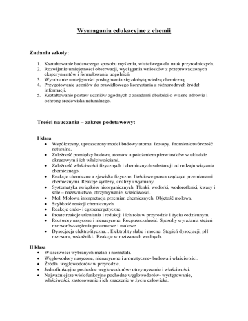 Wymagania edukacyjne z chemii Zadania szkoły: 1. Kształtowanie badawczego sposobu myślenia, właściwego dla nauk przyrodniczych. 2. Rozwijanie umiejętności obserwacji, wyciągania wniosków z przeprowadzonych eksperymentów i formułowania uogólnień. 3. Wyrabianie umiejętności posługiwania się zdobytą wiedzą chemiczną. 4. Przygotowanie uczniów do prawidłowego korzystania z różnorodnych źródeł informacji. 5. Kształtowanie postaw uczniów zgodnych z zasadami dbałości o własne zdrowie i ochronę środowiska naturalnego. Treści nauczania – zakres podstawowy: I klasa Współczesny, uproszczony model budowy atomu. Izotopy. Promieniotwórczość naturalna. Zależność pomiędzy budową atomów a położeniem pierwiastków w układzie okresowym i ich właściwościami. Zależność właściwości fizycznych i chemicznych substancji od rodzaju wiązania chemicznego. Reakcje chemiczne a zjawiska fizyczne. Ilościowe prawa rządzące przemianami chemicznymi. Reakcje syntezy, analizy i wymiany. Systematyka związków nieorganicznych. Tlenki, wodorki, wodorotlenki, kwasy i sole – nazewnictwo, otrzymywanie, właściwości. Mol. Molowa interpretacja przemian chemicznych. Objętość molowa. Szybkość reakcji chemicznych. Reakcje endo- i egzoenergetyczne. Proste reakcje utleniania i redukcji i ich rola w przyrodzie i życiu codziennym. Roztwory nasycone i nienasycone. Rozpuszczalność. Sposoby wyrażania stężeń roztworów-stężenia procentowe i molowe. Dysocjacja elektrolityczna. . Elektrolity słabe i mocne. Stopień dysocjacji, pH roztworu, wskaźniki. Reakcje w roztworach wodnych. II klasa Właściwości wybranych metali i niemetali. Węglowodory nasycone, nienasycone i aromatyczne- budowa i właściwości. Źródła węglowodorów w przyrodzie. Jednofunkcyjne pochodne węglowodorów- otrzymywanie i właściwości. Najważniejsze wielofunkcyjne pochodne węglowodorów- występowanie, właściwości, zastosowanie i ich znaczenie w życiu człowieka. Chemia w życiu gospodarczym, społecznym i ochronie środowiska. Praktyczne zastosowanie poznanych substancji chemicznych i zagrożenia powodowane niewłaściwym ich wykorzystaniem. Treści nauczania – zakres podstawowy i rozszerzony: I klasa Współczesny, uproszczony model budowy atomu. Izotopy. Promieniotwórczość naturalna. Zależność pomiędzy budową atomów a położeniem pierwiastków w układzie okresowym i ich właściwościami. Zależność właściwości fizycznych i chemicznych substancji od rodzaju wiązania chemicznego. Reakcje chemiczne a zjawiska fizyczne. Ilościowe prawa rządzące przemianami chemicznymi. Reakcje syntezy, analizy i wymiany. Systematyka związków nieorganicznych. Tlenki, wodorki, wodorotlenki, kwasy i sole – nazewnictwo, otrzymywanie, właściwości. Mol. Molowa interpretacja przemian chemicznych. Objętość molowa. Szybkość reakcji chemicznych. Reakcje endo- i egzoenergetyczne. Proste reakcje utleniania i redukcji i ich rola w przyrodzie i życiu codziennym. Roztwory nasycone i nienasycone. Rozpuszczalność. Sposoby wyrażania stężeń roztworów-stężenia procentowe i molowe. Dysocjacja elektrolityczna. Elektrolity słabe i mocne. Stopień dysocjacji, pH roztworu, wskaźniki. Reakcje w roztworach wodnych. Charakterystyka najważniejszych pierwiastków bloków s i p układu okresowego.. Zmienność właściwości związków w grupach i okresach. II klasa Charakterystyka najważniejszych pierwiastków bloku d układu okresowego. Węglowodory nasycone, nienasycone i aromatyczne- budowa i właściwości. Szreg homologiczny. Izomeria konstytucyjna i geometryczna. Źródła węglowodorów w przyrodzie. Przeróbka ropy naftowej. Jednofunkcyjne pochodne węglowodorów. Alkohole, fenole, aldehydy, ketony, aminy, kwasy karboksylowe i ich pochodne – budowa, nazewnictwo, otrzymywanie i właściwości. Wielofunkcyjne pochodne węglowodorów. Aminokwasy, peptydy i białka, tłuszcze proste i złożone, najważniejsze tłuszcze oraz kwasy nukleinowe - występowanie, właściwości i ich znaczenie w życiu człowieka. Zjawisko izomerii optycznej. Chiralność. Polimeryzacyjne tworzywa sztuczne- budowa i zastosowanie. Chemia w życiu gospodarczym, społecznym i ochronie środowiska. Praktyczne zastosowanie poznanych substancji chemicznych i zagrożenia powodowane niewłaściwym ich wykorzystaniem. III klasa Współczesny model budowy atomu- elementy mechaniki kwantowej w ujęciu jakościowym. Izotopy. Promieniotwórczość naturalna i sztuczna. Struktura elektronowa atomów i cząsteczek. Wiązania chemiczne. Orbitale molekularne. Hybrydyzacja orbitali atomowych. Kinetyka i równowaga chemiczna. Szybkość reakcji. Rząd reakcji. Stała równowagi. Prawo działania mas. Reguła przekory. Stała i stopień dysocjacji. Prawo rozcieńczeń Ostwalda. Teorie kwasów i zasad. Reakcje w roztworach wodnych elektrolitówzobojętniania, strącania, hydrolizy. Amfoteryczność. Równanie Clapeyrona. Warunki normalne i standardowe. Układy koloidalne. Entalpia. Obliczenia termochemiczne. Procesy samorzutne i wymuszone. Elektrochemia. Reakcje utleniania-redukcji. Ogniwa galwaniczne i ich zastosowanie. SEM ogniwa. Elektroliza wodnych roztworów elektrolitów i soli stopionych. Prawa elektrolizy. Korozja elektrochemiczna i metody jej zapobiegania. Szkoła stwarza warunki do zdobywania następujących kompetencji: Wyjaśnianie właściwości pierwiastków i tworzonych przez nie związków chemicznych na podstawie budowy materii. Odczytywanie informacji z układu okresowego pierwiastków chemicznych. Rozpoznawanie rodzajów reakcji chemicznych i ich zapisywanie za pomocą równań. Wykonywanie prostych obliczeń stechiometrycznych. Wykazanie zależności między właściwościami związków chemicznych a ich zastosowaniem, określanie ich wpływu na środowisko naturalne. Bezpieczne posługiwanie się prostym sprzętem laboratoryjnym i odczynnikami. Posługiwanie się modelami i innymi środkami w