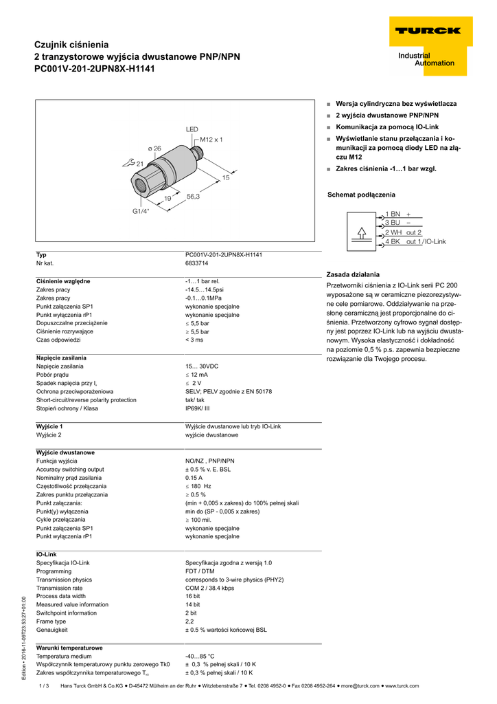 Czujnik ciśnienia 2 tranzystorowe wyjścia dwustanowe PNP/NPN PC001V-201-2UPN8X-H1141 ■ Wersja cylindryczna bez wyświetlacza ■ 2 wyjścia dwustanowe PNP/NPN ■ Komunikacja za pomocą IO-Link ■ Wyświetlanie stanu przełączania i komunikacji za pomocą diody LED na złączu M12 ■ Zakres ciśnienia -1…1 bar wzgl. Edition • 2016-11-09T23:53:27+01:00 Schemat podłączenia Typ Nr kat. PC001V-201-2UPN8X-H1141 6833714 Ciśnienie względne Zakres pracy Zakres pracy Punkt załączenia SP1 Punkt wyłączenia rP1 Dopuszczalne przeciążenie Ciśnienie rozrywające Czas odpowiedzi -1…1 bar rel. -14.5…14.5psi -0.1…0.1MPa wykonanie specjalne wykonanie specjalne ð 5,5 bar ï 5,5 bar < 3 ms Napięcie zasilania Napięcie zasilania Pobór prądu Spadek napięcia przy Ie Ochrona przeciwporażeniowa Short-circuit/reverse polarity protection Stopień ochrony / Klasa 15… 30VDC ð 12 mA ð 2V SELV; PELV zgodnie z EN 50178 tak/ tak IP69K/ III Wyjście 1 Wyjście 2 Wyjście dwustanowe lub tryb IO-Link wyjście dwustanowe Wyjście dwustanowe Funkcja wyjścia Accuracy switching output Nominalny prąd zasilania Częstotliwość przełączania Zakres punktu przełączania Punkt załączania: Punkt(y) wyłączenia Cykle przełączania Punkt załączenia SP1 Punkt wyłączenia rP1 NO/NZ , PNP/NPN ± 0.5 % v. E. BSL 0.15 A ð 180 Hz ï 0.5 % (min + 0,005 x zakres) do 100% pełnej skali min do (SP - 0,005 x zakres) ï 100 mil. wykonanie specjalne wykonanie specjalne IO-Link Specyfikacja IO-Link Programming Transmission physics Transmission rate Process data width Measured value information Switchpoint information Frame type Genauigkeit Specyfikacja zgodna z wersją 1.0 FDT / DTM corresponds to 3-wire physics (PHY2) COM 2 / 38.4 kbps 16 bit 14 bit 2 bit 2,2 ± 0.5 % wartości końcowej BSL Warunki temperaturowe Temperatura medium Współczynnik temperaturowy punktu zerowego Tk0 Zakres współczynnika temperaturowego TkS -40…85 °C ± 0,3 % pełnej skali / 10 K ± 0,3 % pełnej skali / 10 K 1/3 Zasada działania Przetworniki ciśnienia z IO-Link serii PC 200 wyposażone są w ceramiczne piezorezystywne cele pomiarowe. Oddziaływanie na przesłonę ceramiczną jest proporcjonalne do ciśnienia. Przetworzony cyfrowo sygnał dostępny jest poprzez IO-Link lub na wyjściu dwustanowym. Wysoka elastyczność i dokładność na poziomie 0,5 % p.s. zapewnia bezpieczne rozwiązanie dla Twojego procesu. Hans Turck GmbH & Co.KG ñ D-45472 Mülheim an der Ruhr ñ Witzlebenstraße 7 ñ Tel. 0208 4952-0 ñ Fax 0208 4952-264 ñ [email protected] ñ www.turck.com Czujnik ciśnienia 2 tranzystorowe wyjścia dwustanowe PNP/NPN PC001V-201-2UPN8X-H1141 Warunki otoczenia Temperatura pracy Temperatura składowania Odporność na wibracje Shock resistance -40…80 °C -40…+80°C 20 g (9…2000 Hz), zgodnie z IEC 68-2-6 50 , zgodnie z IEC 61508 Obudowa Materiał obudowy Materiał łącza procesowego Materiał przetwornika ciśnienia Materiał uszczelniający Podłączenie procesowe Wrench size pressure connection / coupling nut Połączenie elektryczne stal nierdzewna, 1.4305 (AISI 303)/PBT-GF15 Stal nierdzewna A2 1.4305 (AISI 303) Ceramics AL2O3 FPM G ¼″, gwint żeński 21 złącze kołnierzowe, M12 x 1 Warunki odniesienia zgodne z IEC 61298-1 temperatura Ciśnienie atmosferyczne Wilgotność Zasilanie pomocnicze 15…25 °C 860…1060 hPa bezwzgl. 45…75 % wzgl. 24 VDC LED Punkt załączania/wyłączania, PNP/NPN; NO/NC; histereza/tryb okna, filtr; jednostki ciśnienia; pamięć wartości szczytowej ciśnienia MTTF 2079 zgodnie z SN 29500 (Ed. 99) 40 °C 2/3 Hans Turck GmbH & Co.KG ñ D-45472 Mülheim an der Ruhr ñ Witzlebenstraße 7 ñ Tel. 0208 4952-0 ñ Fax 0208 4952-264 ñ [email protected] ñ www.turck.com Edition • 2016-11-09T23:53:27+01:00 Wskaźnik stanu przełączenia Wartość pomiarowa/programowanie Czujnik ciśnienia 2 tranzystorowe wyjścia dwustanowe PNP/NPN PC001V-201-2UPN8X-H1141 Akcesoria - okablowanie Typ Nr kat. WKC4.4T-2/TEL 6625025 Rysunek wymiarowy Przewód podłączeniowy, złącze żeńskie M12, kątowe, 4-pinowe, długość: 2 m; materiał otuliny: PVC, czarny; certyfikat cULus; dostępne również inne długości kabli i typy otuliny, patrz www.turck.com RKC4.4T-2/TEL 6625013a Przewód podłączeniowy, żeński M12, prosty, 4-stykowy, długość przewodu: 2 m; materiał otuliny: PVC, czarny; certyfikat cULus; dostępne również inne długości kabli i typy otuliny, patrz www.turck.com RKC4.4T-2/TXL 6625503 Przewód podłączeniowy, złącze żeńskie M12, proste, 4-pinowe, długość: 2 m; materiał otuliny: PVC, czarny; certyfikat cULus; dostępne również inne długości kabli i typy otuliny, patrz www.turck.com WKC4.4T-2/TXL 6625515 Przewód podłączeniowy, złącze żeńskie M12, kątowe, 4-pinowe, długość: 2 m; materiał otuliny: PVC, czarny; certyfikat cULus; dostępne również inne długości kabli i typy otuliny, patrz www.turck.com RKC4.4T-P7X2-10/TXL 6626184 Przewód podłączeniowy, złącze żeńskie M12, kątowe, 4-pinowe, długość: 10m; materiał otuliny: PUR, czarny; certyfikat cULus; dostępne również inne długości kabli i typy otuli- Edition • 2016-11-09T23:53:27+01:00 ny, patrz www.turck.com 3/3 Hans Turck GmbH & Co.KG ñ D-45472 Mülheim an der Ruhr ñ Witzlebenstraße 7 ñ Tel. 0208 4952-0 ñ Fax 0208 4952-264 ñ [email protected] ñ www.turck.com