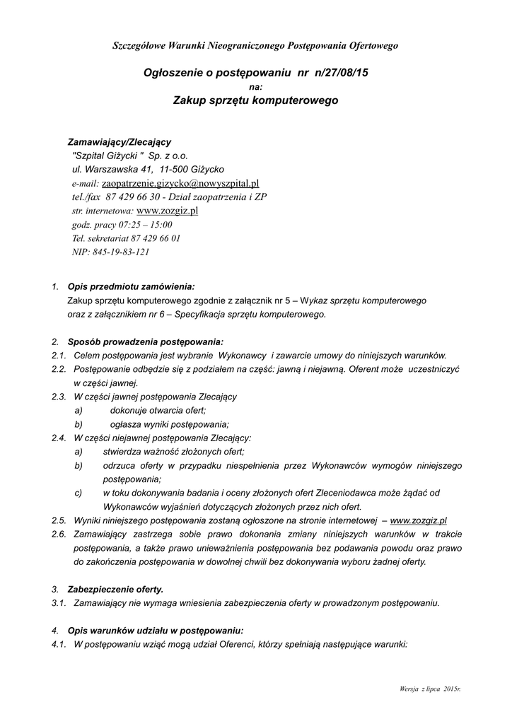 Szczegółowe Warunki Nieograniczonego Postępowania Ofertowego Ogłoszenie o postępowaniu nr n/27/08/15 na: Zakup sprzętu komputerowego Zamawiający/Zlecający "Szpital Giżycki " Sp. z o.o. ul. Warszawska 41, 11-500 Giżycko e-mail: [email protected] tel./fax 87 429 66 30 - Dział zaopatrzenia i ZP str. internetowa: www.zozgiz.pl godz. pracy 07:25 – 15:00 Tel. sekretariat 87 429 66 01 NIP: 845-19-83-121 1. Opis przedmiotu zamówienia: Zakup sprzętu komputerowego zgodnie z załącznik nr 5 – Wykaz sprzętu komputerowego oraz z załącznikiem nr 6 – Specyfikacja sprzętu komputerowego. 2. Sposób prowadzenia postępowania: 2.1. Celem postępowania jest wybranie Wykonawcy i zawarcie umowy do niniejszych warunków. 2.2. Postępowanie odbędzie się z podziałem na część: jawną i niejawną. Oferent może uczestniczyć w części jawnej. 2.3. W części jawnej postępowania Zlecający a) dokonuje otwarcia ofert; b) ogłasza wyniki postępowania; 2.4. W części niejawnej postępowania Zlecający: a) stwierdza ważność złożonych ofert; b) odrzuca oferty w przypadku niespełnienia przez Wykonawców wymogów niniejszego postępowania; c) w toku dokonywania badania i oceny złożonych ofert Zleceniodawca może żądać od Wykonawców wyjaśnień dotyczących złożonych przez nich ofert. 2.5. Wyniki niniejszego postępowania zostaną ogłoszone na stronie internetowej – www.zozgiz.pl 2.6. Zamawiający zastrzega sobie prawo dokonania zmiany niniejszych warunków w trakcie postępowania, a także prawo unieważnienia postępowania bez podawania powodu oraz prawo do zakończenia postępowania w dowolnej chwili bez dokonywania wyboru żadnej oferty. 3. Zabezpieczenie oferty. 3.1. Zamawiający nie wymaga wniesienia zabezpieczenia oferty w prowadzonym postępowaniu. 4. Opis warunków udziału w postępowaniu: 4.1. W postępowaniu wziąć mogą udział Oferenci, którzy spełniają następujące warunki: Wersja z lipca 2015r. a) posiadają uprawnienia do wykonywania określonej działalności lub czynności, jeżeli przepisy prawa nakładają obowiązek posiadania takich uprawnień; b) znajdują się w sytuacji ekonomicznej i finansowej zapewniającej wykonanie zamówienia, 4.2. W celu potwierdzenia, że Oferent posiada uprawnienia do wykonywania określonej działalności lub czynności Zleceniodawca żąda: w formie oryginału lub kserokopii poświadczonej za zgodność z oryginałem przez osobę uprawnioną do reprezentacji Wykonawcy w obrocie gospodarczym, następujących dokumentów: a) zezwolenie na prowadzenie działalności gospodarczej w zakresie objętym niniejszym postępowaniem, jeśli jest wymagane, b) aktualnego odpisu z właściwego rejestru albo aktualnego zaświadczenia o wpisie do ewidencji działalności gospodarczej, jeżeli odrębne przepisy wymagają wpisu do rejestru lub zgłoszenia do ewidencji działalności gospodarczej, wystawionego nie wcześniej niż 6 miesięcy przed upływem terminu składania ofert, 4.3. Dodatkowo do oferty należy dołączyć (Formularz nr 3 - Oświadczenie): a) posiada uprawnienia niezbędne do wykonania określonej działalności lub czynności jeżeli przepisy odrębne nakładają obowiązek posiadania takich uprawnień; b) posiada niezbędną wiedzę i doświadczenie; c) znajduje się w sytuacji ekonomicznej i finansowej zapewniającej należyte wykonanie zamówienia, d) nie jest wobec niego, jego firmy prowadzone postępowanie upadłościowe, ani upadłości nie ogłoszono, e) wypełnia zobowiązania podatkowe, uiszcza opłaty w tym składki na ubezpieczenia społeczne; f) zapoznał się z warunkami zawartymi w Szczegółowych Warunkach Nieograniczonego Postępowania Ofertowego i nie wnosi do nich żadnych zastrzeżeń, a także, że zdobył konieczne informacje potrzebne do właściwego wykonania zamówienia, g) akceptuje projekt umowy. 4.4. O ile oferta została złożona przez kilku Oferentów działających wspólnie dokumenty określone w pkt. 4.2. oraz w pkt 4.3. składają wszyscy Oferenci. 4.5. Oferent może polegać na wiedzy i doświadczeniu, potencjale technicznym, osobach lub zdolnościach finansowych innych podmiotów w celu wykazania spełniania warunków udziału w postępowaniu. Oferent w takiej sytuacji zobowiązany jest udowodnić Zleceniodawcy iż będzie dysponował zasobami niezbędnymi do realizacji umowy, w szczególności przedstawiając w tym celu pisemne zobowiązanie tych podmiotów do oddania mu do dyspozycji niezbędnych zasobów na okres korzystania z nich przy wykonaniu umowy. O ile Oferent polegał będzie na zasobach podmiotu trzeciego i podmiot ten wskazany będzie przez niego jako pod Oferent Zleceniodawca: może zażądać przedstawienia dokumentów wskazanych w pkt. 4.2. i 4.3. dotyczących sytuacji tego podmiotu trzeciego. 4.6. Ocena spełnienia warunków określonych w pkt. 4.1 dokonana zostanie zgodnie z formułą „spełnia – nie spełnia” w oparciu o informacje zawarte w oświadczeniach i dokumentach wyszczególnionych w pkt 4.2. i 4.3. Z treści załączonych dokumentów i oświadczeń musi wynikać jednoznacznie, że Oferent spełnia wymogi określone przez Zleceniodawcę. Nie złożenie chociażby jednego z w/w dokumentów i oświadczeń oraz udzielenie informacji nieprawdziwej skutkować może pozostawieniem złożonej oferty bez rozpatrzenia. Wersja z lipca 2015r. 4.7. Zleceniodawca wezwie Oferentów, którzy w określonym terminie nie złożyli wymaganych przez Zleceniodawcę oświadczeń lub dokumentów, o których mowa w pkt. 4.2. i 4.3. lub którzy nie złożyli pełnomocnictw, albo którzy złożyli wymagane przez Zleceniodawcę oświadczenia i dokumenty, o których mowa w pkt 4.2. oraz 4.3., zawierające błędy lub którzy złożą wadliwe pełnomocnictwa, do ich uzupełnienia w wyznaczonym terminie chyba, że mimo ich złożenia oferta podlegałaby pozostawieniu bez rozpoznania. 5. Opis sposobu przygotowywania oferty. 5.1. Zamawiajacy nie dopuszcza składanie ofert cząs