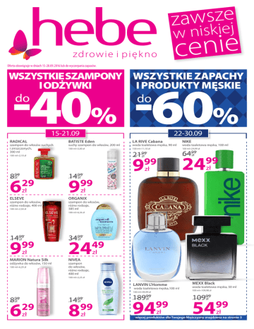 e z s w a z iej w nisk cenie Oferta obowiązuje w dniach 15-28.09.2016 lub do wyczerpania zapasów. WSZYSTKIE SZAMPONY WSZYSTKIE ZAPACHY I ODŻYWKI I PRODUKTY MĘSKIE -40% -60% do do 15-21.09 RADICAL szampon do włosów suchych i zniszczonych, 300 ml 22-30.09 BATISTE Eden LA RIVE Cabana NIKE 100 ml=5,00 zł 100 ml=11,10 zł 100 ml=24,99 zł suchy szampon do włosów, 200 ml 21 zł 99 9 100 ml=2,10 zł 899 zł 6 29 zł ELSEVE szampon do włosów, różne rodzaje, 400 ml 100 ml=2,50 zł woda toaletowa męska, 90 ml 99 1499 zł 9 zł woda toaletowa męska, 100 ml 6499 zł 24 99 zł 99 zł ORGANIX szampon do włosów, różne rodzaje, 385 ml 100 ml=6,36 zł 1499 zł 9 99 zł MARION Natura Silk odżywka do włosów, 150 ml 100 ml=6,29 zł 3499 zł 24 49 zł NIVEA szampon do włosów, różne rodzaje, 400 ml 100 ml=2,25 zł LANVIN L'Homme woda toaletowa męska,100 ml 100 ml=94,99 zł 899 zł 6 29 zł 1499 zł 8 99 zł 18999 zł 94 99 zł MEXX Black woda toaletowa męska, 50 ml 100 ml=109,98 zł 10999 zł 54 99 zł więcej produktów dla Twojego Mężczyzny znajdziesz na stronie 3 2 -30% PRODUKTY DOVE mydło w kostce, wybrane rodzaje, 100 g do * DOVE zapas mydło w płynie, wybrane rodzaje, 500 ml 100 ml=1,40 zł 100 g=2,79 zł DOVE odżywka do włosów, wybrane rodzaje, 200 ml 100 ml=4,50 zł 3zł 99 2 79 zł DOVE szampon do włosów, wybrane rodzaje, 400 ml 100 ml=2,80 zł 999 zł 6 99 zł DOVE Men+Care dezodorant w sprayu męski, wybrane rodzaje, 150 ml 99 zł DOVE Men+Care żel po prysznic, wybrane rodzaje, 400 ml 100 ml=2,72 zł 100 ml=6,33 zł 1599 zł 11 19 zł DOVE żel pod prysznic, wybrane rodzaje, 500 ml 100 ml=2,46 zł 49 zł DOVE balsam do ciała, wybrane rodzaje, 250 ml 1559 zł 10 89 zł DOVE żel pod prysznic, wybrane rodzaje, 750 ml 100 ml=2,11 zł 100 ml=5,60 zł 1759 zł 1229 zł a ELMEX Sensitive płyn do płukania ust, 400 ml kupisz za 2499 zł 9 99 zł 100 ml=2,50 zł DOVE mydło w płynie, zapas, 500 ml **Produkt do odebrania z półki. DOVE antyperspirant w kulce damski, wybrane rodzaje, 50 ml 1199 zł 8 99 zł DOVE antyperspirant w sprayu damski, wybrane rodzaje, 250 ml 1649 zł 12 99 zł DOVE balsam do ciała, wybrane rodzaje, 400 ml 100 ml=3,95 zł 1999 zł 1399 zł 2259 zł 1579 zł * Promocja nie obejmuje linii produktów do pielęgnacji włosów AHS i produktów do pielęgnacji ciała DermaSpa. ZRÓB ZAKUPY W ZA MIN. 50 ZŁ ła kupisz - zapas myd ** za 1 grosz. 100 ml=5,20 zł 1349 zł 9 ve Przy zakupie produktów Do za kwotę powyżej 30 zł 100 ml=17,98 zł 1299 zł 8 15-28.09 spray do twarzy fiksujący i baza pod makijaż, 60 ml 1579 zł JESIENNE 15-21.09 P2 2159 zł NACOMI masło do ciała, 100 ml 100 ml=7,99 zł FARMONA Jantar odżywka do włosów, 100 ml 100 ml=7,99 zł 100 ml=19,98 zł 2999 zł 11 99 zł 1299 zł 7 99 zł 1399 zł 7 99 zł 30.09 DZIEŃ CHŁOPAKA -60% WSZYSTKIE ZAPACHY I PRODUKTY MĘSKIE DAVID BECKHAM The Essence 3 do BRUNO BANANI Dangerous Men antyperspirant w atomizerze męski, 75 ml 22-30.09 STR8 Red Code CALVIN KLEIN One 100 ml=39,99 zł 100 ml=99,99 zł 5999 zł 16999 zł woda toaletowa męska, 100 ml woda toaletowa męska, 30 ml woda toaletowa unisex, 100 ml 100 ml=133,30 zł 100 ml=26,65 zł 3999 zł 19 99 zł CALVIN KLEIN Obsession 7999 zł 39 99 zł zł HUGO BOSS Energise LACOSTE Essential Homme 100 ml=154,65 zł 100 ml=173,32 zł woda toaletowa męska, 75 ml woda toaletowa męska, 125 ml 39 99 woda toaletowa męska, 75 ml zł DOLCE&GABBANA Pour Homme woda toaletowa męska, 75 ml 100 ml=92,79 zł 100 ml=186,65 zł 23999 zł 115 99 zł NIVEA Men Silver Protect żel pod prysznic, 500 ml 18999 zł 115 GILLETTE Mach3 żel do golenia, 200 ml 100 ml=5,00 zł 100 ml=1,80 zł 1249 zł 899 zł 1399 zł 999 zł 99 zł 19999 zł 129 GILLETTE Fusion Proglide 39 99 zł zł 100 ml=24,99 zł 4999 zł 3999 zł 1999 zł DERMIKA 100 ml=6,66 zł 100 ml=29,98 zł 1299 zł 2499 zł 7 zł zł maszynka do golenia męska, 1 szt. MARION 99 139 99 OLD SPICE Original 22-28.09 odżywka do włosów w sprayu z olejkiem arganowym, 120 ml maszynka do golenia męska, 1 szt., ostrza, 2 szt./1 opak. 99 28999 zł WILKINSON Quattro Titanium Precision PROMOCJE 5799 zł 99 99 maseczka do twarzy, różne rodzaje, 50 ml 14 99 zł woda po goleniu, 100 ml 2499 zł ZRÓB ZAKUPY W ZA MIN. 50 ZŁ a VASELINE balsam do ust, wybrane rodzaje, 20 ml kupisz za 1999 zł 7 99 zł 100 ml=39,95 zł makijaż 4 -40% -40% NAIL TEK odżywka do paznokci, 15 ml 100 ml=106,60 zł 1599 zł LIRENE BELL HypoAllergenic podkład do twarzy, różne rodzaje podkład do twarzy, 35 ml 100 ml=32,54 zł -40% 2399 zł -40% INGRID Ideal Face podkład do twarzy, różne odcienie, 30 g 1899 zł 1139 zł BELL HypoAllergenic tusz do rzęs, 9 g 100 g=113,22 zł 100 g=51,97 zł 25 zł 99 -40% -40% 15 59 zł MISSLYN Intense Volume MISSLYN Ultimate Stay REVLON Ultra Volume 100 ml=186,56 zł 100 ml=99,97 zł 100 ml=352,82 zł -40% -40% -40% 2799 zł 4999 zł 4999 zł tusz do rzęs, 9 ml 16 79 zł podkład do twarzy, 30 ml 29 99 zł tusz do rzęs, 8,5 ml 29 99 zł -40% 1699 zł 10 19 zł BIELENDA preparat usuwający skórki, 12 ml 100 ml=113,25 zł 1699* 13 zł 59 zł cena z kartą makijaż 5 -40% kup produkty marki makijażowej P2 Cosmetics za min. 40 zł, a biżuterię LOLITA kupisz -20% do PERFECTA 8in1 & Matt Cover podkład do twarzy, 30 ml lakier do paznokci, różne odcienie, 8 ml -30% 1399 zł 39 -40% -20% zł L'ORÉAL PARIS True Match podkład do twarzy, 30 ml 100 ml=113,30 zł MAYBELLINE Lash Sensational tusz do rzęs, 9,5 ml -40% 5699 zł -40% RIMMEL 60 Seconds by Rita Ora 100 ml=27,97 zł 8 33 99 zł 100 ml=220,95 zł 3499 zł -40% 20 99 zł REVLON Nearly Naked REVLON Colorstay 100 ml=99,97 zł 100 ml=133,00 zł podkład do twarzy, 30 ml podkład do twarzy, 30 ml 2999 zł NA WSZYSTKIE PRODUKTY DO PERFEKCYJNEGO KONTUROWANIA TWARZY NOWOŚĆ KONTUROWANIE I ROZŚWIETLANIE Z PEWNOŚCIĄ EFEKTU GOSH MODELUJ + ROZŚWIETLAJ + PODKREŚLAJ RYSY + KONTURUJ MAKE YOUR IMPRESSION MAYBELLINE BOURJOIS Air Mat 100 ml=220,95