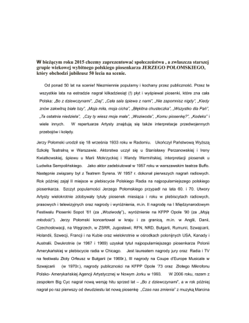 W bieżącym roku 2015 chcemy zaprezentować społeczeństwu , a zwłaszcza starszej grupie wiekowej wybitnego polskiego piosenkarza JERZEGO POŁOMSKIEGO, który obchodzi jubileusz 50 lecia na scenie. Od ponad 50 lat na scenie! Niezmiennie popularny i kochany przez publiczność. Przez te wszystkie lata na estradzie nagrał kilkadziesiąt (!) płyt i wyśpiewał piosenki, które zna cała Polska: „Bo z dziewczynami”, „Daj”, „Cała sala śpiewa z nami”, „Nie zapomnisz nigdy”, „Kiedy znów zakwitną białe bzy”, „Moja miła, moja cicha”, „Błękitna chusteczka”, „Wszystko dla Pań”, „Ta ostatnia niedziela”, „Czy ty wiesz moja mała”, „Woziwoda”, „Komu piosenkę?”, „Kodeks” i wiele innych. W repertuarze Artysty znajdują się także interpretacje przedwojennych przebojów i kolędy. Jerzy Połomski urodził się 18 września 1933 roku w Radomiu. Ukończył Państwową Wyższą Szkołę Teatralną w Warszawie. Aktorstwa uczył się u Stanisławy Perzanowskiej i Ireny Kwiatkowskiej, śpiewu u Marii Mokrzyckiej i Wandy Wermińskiej, interpretacji piosenek u Ludwika Sempolińskiego. Jako aktor zadebiutował w 1957 roku w warszawskim teatrze Buffo. Następnie związany był z Teatrem Syrena. W 1957 r. dokonał pierwszych nagrań radiowych. Rok później zajął II miejsce w plebiscycie Polskiego Radia na najpopularniejszego polskiego piosenkarza. Szczyt popularności Jerzego Połomskiego przypadł na lata 60. i 70. Utwory Artysty wielokrotnie zdobywały tytuły piosenek miesiąca i roku w plebiscytach radiowych, prasowych i telewizyjnych oraz nagrody i wyróżnienia, m.in. II nagrodę na I Międzynarodowym Festiwalu Piosenki Sopot ’61 (za „Woziwodę”),, wyróżnienie na KFPP Opole ’90 (za „Moją młodość”). Jerzy Połomski koncertował w kraju i za granicą, m.in. w Anglii, Danii, Czechosłowacji, na Węgrzech, w ZSRR, Jugosławii, RFN, NRD, Bułgarii, Rumunii, Szwajcarii, Holandii, Szwecji, Francji i na Kubie oraz wielokrotnie w ośrodkach polonijnych USA, Kanady i Australii. Dwukrotnie (w 1967 i 1969) uzyskał tytuł najpopularniejszego piosenkarza Polonii Amerykańskiej w plebiscycie radia w Chicago. Jest laureatem nagrody jury oraz Radia i TV na festiwalu Złoty Orfeusz w Bułgarii (w 1969r.), III nagrody na Coupe d’Europe Musicale w Szwajcarii (w 1970r.), nagrody publiczności na KFPP Opole ’73 oraz Złotego Mikrofonu Polsko- Amerykańskiej Agencji Artystycznej w Nowym Jorku w 1993. W 2006 roku, razem z zespołem Big Cyc nagrał nową wersję hitu sprzed lat – „Bo z dziewczynami”, a w rok później nagrał po raz pierwszy od dwudziestu lat nową piosenkę „Czas nas zmienia” z muzyką Marcina Nierubca i słowami Jacka Cygana (teledysk do utworu powstał w 2009 roku). Piosenka została bardzo dobrze przyjęta przez szerszą publiczność. W 2007 roku był jurorem na 44. Sopot Festival.20 kwietnia 2009 roku Jerzy Połomski otrzymał nagrodę Złotego Fryderyka za całokształt twórczości. Prosimy o kontakt w sprawie zakupu biletów.
