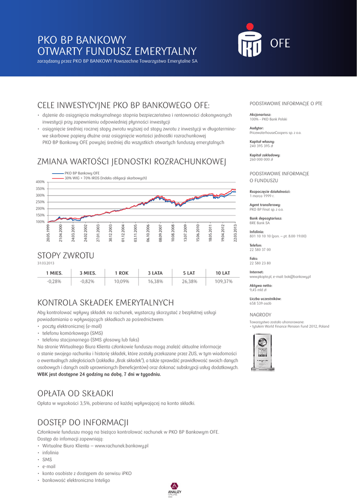 PKO BP BanKOwy Otwarty Fundusz EmErytalny zarządzany przez PKO BP BanKOwy Powszechne towarzystwo Emerytalne sa CELE INWESTYCYJNE PKO BP BANKOWEGO OFE: PODSTAWOWE INFORMACJE O PTE • dążenie do osiągnięcia maksymalnego stopnia bezpieczeństwa i rentowności dokonywanych inwestycji przy zapewnieniu odpowiedniej płynności inwestycji • osiągnięcie średniej rocznej stopy zwrotu wyższej od stopy zwrotu z inwestycji w długoterminowe skarbowe papiery dłużne oraz osiągnięcie wartości jednostki rozrachunkowej PKO BP Bankowy OFE powyżej średniej dla wszystkich otwartych funduszy emerytalnych Akcjonariusz: 100% – PKO Bank Polski Audytor: PricewaterhouseCoopers sp. z o.o. Kapitał własny: 240 395 395 zł Kapitał zakładowy: 260 000 000 zł ZMIANA WARTOśCI JEDNOSTKI ROZRACHUNKOWEJ PODSTAWOWE INFORMACJE O FUNDUSZU PKO BP Bankowy OFE 30% WIG + 70% IROS (Indeks obligacji skarbowych) 400% 350% Rozpoczęcie działalności: 1 marca 1999 r. 300% 250% Agent transferowy: PKO BP Finat sp. z o.o. 200% 150% 22.03.2013 19.04.2012 18.05.2011 15.06.2010 13.07.2009 10.08.2008 08.09.2007 06.10.2006 03.11.2005 01.12.2004 30.12.2003 27.01.2003 24.02.2002 24.03.2001 21.04.2000 20.05.1999 100% Infolinia: 801 10 10 10 (pon. — pt. 8.00-19.00) Telefon: 22 580 37 00 STOPY ZWROTU Faks: 22 580 23 80 31.03.2013 1 MIES. 3 MIES. 1 ROK 3 LATA 5 LAT 10 LAT -0,28% -0,82% 10,09% 16,38% 26,38% 109,37% KONTROLA SKŁADEK EMERYTALNYCH Aby kontrolować wpływy składek na rachunek, wystarczy skorzystać z bezpłatnej usługi powiadamiania o wpływających składkach za pośrednictwem: • poczty elektronicznej (e-mail) • telefonu komórkowego (SMS) • telefonu stacjonarnego (SMS głosowy lub faks) Na stronie Wirtualnego Biura Klienta członkowie funduszu mogą znaleźć aktualne informacje o stanie swojego rachunku i historię składek, które zostały przekazane przez ZUS, w tym wiadomości o ewentualnych zaległościach (zakładka 60% „Brak składek”), a także sprawdzić prawidłowość swoich danych 40% osobowych i danych osób uprawnionych (beneficjentów) oraz dokonać subskrypcji usług dodatkowych. WBK jest dostępne 24 godziny na dobę, 7 dni w tygodniu. OPŁATA OD SKŁADKI Opłata w wysokości 3,5%, pobierana od każdej wpływającej na konto składki. 60% Bank depozytariusz: BRE Bank SA 40% DOSTĘP DO INFORMACJI Członkowie funduszu mogą na bieżąco kontrolować rachunek w PKO BP Bankowym OFE. Dostęp do infomacji zapewniają: • Wirtualne Biuro Klienta — www.rachunek.bankowy.pl • infolinia • SMS • e-mail • konto osobiste z dostępem do serwisu iPKO • bankowość elektroniczna Inteligo Internet: www.pkopte.pl, e-mail: [email protected] Aktywa netto: 9,45 mld zł Liczba uczestników: 658 539 osób NAGRODY Towarzystwo zostało uhonorowane: • tytułem World Finance Pension Fund 2012, Poland PKO BP BanKOwy Otwarty Fundusz EmErytalny PKO BP BANKOWY Powszechne Towarzystwo Emerytalne SA zarządzany przez PKO BP BanKOwy Powszechne towarzystwo Emerytalne sa kwiecień 2013 RANKING KOMISJI NADZORU FINANSOWEGO RANKING ANALIZ ONLINE1 za okres od 31.03.2010 do 29.03.2013, źródło: KNF Długoterminowy (36 miesięcy) NAZWA OFE Infolinia: 801 10 10 10 (opłata zgodna z taryfą operatora) www.pkopte.pl STOPA ZWROTU W OKRESIE 3 4 Krótkoterminowy (12 miesięcy) Ranking oparty na współczynniku Information Ratio liczonym dla 36 (długoterminowy) i 12 (krótkoterminowy) miesięcy. Im wyższa wartość, tym lepsza ocena funduszu. Allianz Polska OFE 19,132% Nordea OFE 19,052% Amplico OFE 17,976% ING OFE 17,664% WSKAŹNIK RYZYKA I EFEKTYWNOśCI Aviva OFE 17 234% 17,234% 31.03.2013 OFE WARTA 16,820% NAZWA WSKAŹNIKA PKO BP Bankowy OFE 16,375% Information Ratio (w skali roku) AXA OFE 16,290% OFE PZU "Złota Jesień" 15,382% AEGON OFE 15,271% Generali OFE 14,760% Pekao OFE 14,641% OFE Pocztylion 13,768% OFE Polsat 9,828% Średnia ważona stopa zwrotu 16,636% Minimalna wymagana stopa zwrotu STRUKTURA AKTYWÓW 31.03.2013 udziały w innych funduszach 0,2% środki pieniężne i należności 0,3% depozyty 1,6% akcje polskich spółek i nfi 37,5% nieskarbowe papiery dłużne 9,1% skarbowe papiery dłużne 51,3% 8,318% BRANŻOWA STRUKTURA PORTFELA AKCYJNEGO 1 POZYCJA WARTOŚĆ 5 0,63 Tracking Error (w skali roku) 13 0,38% Współczynnik Sharpe’a 10 0,28 Odchylenie standardowe stóp zwrotu 11 1,52% NAJWIĘKSZE SKŁADNIKI W PORTFELU AKCYJNYM 31.12.2012 POZYCJA UDZIAŁ BRANŻA W AKTYWACH PZU (PZU) 3,27% ubezpieczenia KGH (KGHM) 2,72% przemysł surowcowy PKN (PKNORLEN) 2,43% przemysł paliwowy PEO (PEKAO) 2,20% banki 31.12.2012 NAJWIĘKSZE SKŁADNIKI W PORTFELU DŁUŻNYM banki przemysł surowcowy przemysł paliwowy ubezpieczenia energetyka pozostałe handel hurtowy przemysł spożywczy deweloperzy pozostałe 31.12.2012 POZYCJA 0% 5% 10% 15% 20% UDZIAŁ W AKTYWACH Information Ratio – miara wyników funduszu w odniesieniu do ponoszonego ryzyka. Współczynnik pokazuje relację pomiędzy dodatkowym zwrotem funduszu, czyli zyskiem ponad przyjęty wzorzec (zwrot), a zmiennością tych wyników (ryzyko). Im wyższa relacja, tym lepsze wyniki funduszu w stosunku do ponoszonego przez fundusz ryzyka. Odchylenie standardowe – podstawowa miara ryzyka. Odchylenie standardowe zysków funduszu pokazuje, jak bardzo całkowite zyski funduszu zmieniały się w przeszłości oraz jak roczne zwroty funduszu mogą się różnić od średniego rocznego zwrotu w dłuższym okresie – jest to szczególnie przydatne przy porównaniu dwóch funduszy w celu wykazania, który jest bardziej ryzykowny. Im większe odchylenie standardowe, tym większa zmienność funduszu. Współczynnik Sharpe’a – miara zwrotu funduszu w odniesieniu do ryzyka. Pokazuje współczynnik dodatkowego zwrotu funduszu (tj. zwrot ponad osiągany z aktywów wolnych od ryzyka, np. papierów skarbowych) do ryzyka funduszu (tj. odchylenia standardowego). Im wyższy współczynnik, tym lepsze wyniki funduszu w stosunku do ponoszonego przez fundusz ryzyka. Sz