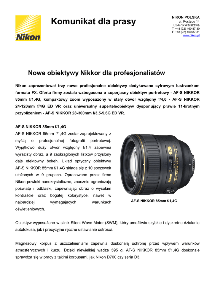 Komunikat dla prasy NIKON POLSKA ul. Postępu 14 02-676 Warszawa T. +48 (22) 460 87 30 F. +48 (22) 460 87 31 www.nikon.pl Nowe obiektywy Nikkor dla profesjonalistów Nikon zaprezentował trzy nowe profesjonalne obiektywy dedykowane cyfrowym lustrzankom formatu FX. Oferta firmy została wzbogacona o superjasny obiektyw portretowy - AF-S NIKKOR 85mm f/1,4G, kompaktowy zoom wyposażony w stały otwór względny f/4,0 - AF-S NIKKOR 24-120mm f/4G ED VR oraz uniwersalny superteleobiektyw dysponujący prawie 11-krotnym przybliżeniem - AF-S NIKKOR 28-300mm f/3,5-5,6G ED VR. AF-S NIKKOR 85mm f/1,4G AF-S NIKKOR 85mm f/1,4G został zaprojektowany z myślą o profesjonalnej fotografii portretowej. Wyjątkowo duży otwór względny f/1,4 zapewnia wyrazisty obraz, a 9 zaokrąglonych listków przysłony daje efektowny bokeh. Układ optyczny obiektywu AF-S NIKKOR 85mm f/1,4G składa się z 10 soczewek ułożonych w 9 grupach. Opracowane przez firmę Nikon powłoki nanokrystaliczne, znacznie ograniczają poświatę i odblaski, zapewniając obraz o wysokim kontraście oraz najbardziej bogatej kolorystyce, wymagających nawet w warunkach AF-S NIKKOR 85mm f/1,4G oświetleniowych. Obiektyw wyposażono w silnik Silent Wave Motor (SWM), który umożliwia szybkie i dyskretne działanie autofokusa, jak i precyzyjne ręczne ustawianie ostrości. Magnezowy korpus z uszczelnieniami zapewnia doskonałą ochronę przed wpływem warunków atmosferycznych i kurzu. Dzięki niewielkiej wadze 595 g, AF-S NIKKOR 85mm f/1,4G doskonale sprawdza się w pracy z takimi korpusami, jak Nikon D700 czy seria D3. Komunikat dla prasy NIKON POLSKA ul. Postępu 14 02-676 Warszawa T. +48 (22) 460 87 30 F. +48 (22) 460 87 31 www.nikon.pl AF-S NIKKOR 24-120mm f/4G ED VR AF-S NIKKOR 24-120mm f/4G ED VR to kompaktowy dedykowany zoom fotoreportażu oraz fotografii miłośnikom podróżniczej. Obiektyw oferuje atrakcyjny zakres ogniskowych oraz stały otwór względny ułatwiający zachowanie pełnej kontroli nad głębią ostrości. Zaawansowany układ optyczny wyposażony w dwie soczewki o niskiej dyspersji ED oraz trzy soczewki asferyczne zapewnia klarowny, kontrastowy obraz niezależnie od warunków oświetleniowych, przysłony a 9 zaokrąglonych listków umożliwia tworzenie zdjęć AF-S NIKKOR 24-120mm f/4G ED VR z charakterystycznym dla obiektywów NIKKOR efektownym bokeh. AF-S NIKKOR 24-120mm f/4G ED VR wyposażony został w układ redukcji drgań drugiej generacji VRII, pozwalający uzyskać ostre zdjęcia przy czasach migawki dłuższych o 4 stopnie EV. Silnik Silent Wave Motor (SWM) zapewnia dyskretne, automatyczne ustawianie ostrości z możliwością natychmiastowej ręcznej korekty. Dodatkową wygodę pracy zapewnia ergonomiczne rozmieszczony pierścień zmiany ogniskowej oraz przełączniki trybów pracy autofocusa i systemu redukcji drgań. Dzięki zastosowaniu aluminium i tworzywa Super Engineering Plastic, nowy obiektyw umożliwia fotografowanie nawet w najtrudniejszych warunkach atmosferycznych. AF-S NIKKOR 28-300mm f/3,5-5,6G ED VR AF-S NIKKOR 28-300mm f/3,5-5,6G ED VR to uniwersalny super-zoom z powiększeniem 10,7x, który dzięki szerokiemu zakresowi ogniskowych oraz niewielkich rozmiarach i masie doskonale sprawdza się w fotografii podróżniczej. Komunikat dla prasy NIKON POLSKA ul. Postępu 14 02-676 Warszawa T. +48 (22) 460 87 30 F. +48 (22) 460 87 31 www.nikon.pl W obiektywie zastosowano układ optyczny z dwoma soczewkami ze szkła ED oraz trzema soczewkami asferycznymi, eliminując w ten sposób aberracje, które zwykle występują w superzoomach. Nowy Nikkor wyróżnia się także bardzo krótkim minimalnym dystansem ustawiania ostrości, wynoszącym w całym zakresie ogniskowych 50 cm. Nowy model wyposażono w system redukcji drgań VR drugiej generacji. Rozwiązanie to gwarantuje stabilniejszy obraz w wizjerze, dzięki czemu AF-S NIKKOR 28-300mm f/3,5-5,6G ED VR autofokus działa sprawniej, a kadrowanie jest precyzyjniejsze, szczególnie w przypadku wąskich kadrów. Silnik Silent Wave Motor (SWM) zapewnia ciche i szybkie ustawianie ostrości w całym zakresie ogniskowych, zarówno w przypadku automatycznej, jak i ręcznej korekty. W modelu AF-S NIKKOR 28-300mm f/3,5-5,6G ED VR zastosowano blokadę pierścienia zooma zapobiegającą niekontrolowanym wysunięciom się obiektywu w czasie kadrowania lub podczas transportu, gdy obiektyw nie jest używany. Aby zagwarantować wysoką trwałość, korpus obiektywu oparto o liczne elementy wykonane z aluminium. Główne cechy: AF-S NIKKOR 85mm f/1,4G Ogniskowa Otwór względny Minimalny otwór przysłony Budowa optyczna Kąt widzenia Ostrość od Maksymalna skala odwzorowania Konstrukcja przysłony 85mm f/1,4 f/16 10 soczewek w 9 grupach. Zastosowano powłoki nanokrystaliczne) 28˚30’ (18˚50’ z aparatami formatu DX) 0,85m (2,79 ft) 0,12x 9 segmentów (okrągły otwór) Komunikat dla prasy NIKON POLSKA ul. Postępu 14 02-676 Warszawa T. +48 (22) 460 87 30 F. +48 (22) 460 87 31 www.nikon.pl Ustawianie ostrości Rozmiar filtrów Średnica x długość Masa Autofokus przy pomocy silnika SWM, ręczne ustawianie ostrości 77mm Około 86,5 x 84 mm Około 595 g AF-S NIKKOR 24-120mm f/4G ED VR Ogniskowe Otwór względny Minimalny otwór przysłony Konstrukcja optyczna Kąt widzenia Ustawianie ostrości Maksymalna skala odwzorowania Konstrukcja przysłony Ustawianie ostrości Rozmiar filtrów Wymiary Masa 24-120mm f/4 f/22 17 soczewek w 13 grupach (w tym 2 soczewki ED, 3 soczewki asferyczne), powłoki nanokrystaliczne 84˚-20˚ 20’ (61˚-13˚ 20’ z aparatami w formacie DX) 0,45m (1,5ft) 0,24x (dla najdłuższej ogniskowej) 9 segmentów (okrągły otwór) Autofokus silnikiem SWM oraz ręczne ustawianie ostrości 77 mm 84 x 103,5 mm około 710 g AF-S NIKKOR 28-300mm f/3,5-5,6G ED VR Ogniskowe Otwór względny Minimalny otwór przysłony 28-300 mm f/3,5-5,6 f/22 (przy 28mm), f/38 (przy 300mm) Konstrukcja optyczna Rozmiar filtrów Kąt widzenia Ustawianie ostrości 19 soc