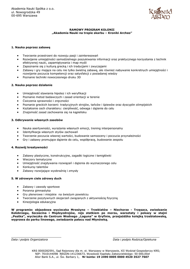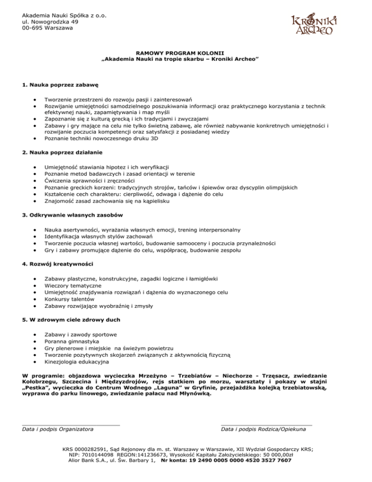 Akademia Nauki Spółka z o.o. ul. Nowogrodzka 49 00-695 Warszawa RAMOWY PROGRAM KOLONII „Akademia Nauki na tropie skarbu – Kroniki Archeo” 1. Nauka poprzez zabawę Tworzenie przestrzeni do rozwoju pasji i zainteresowań Rozwijanie umiejętności samodzielnego poszukiwania informacji oraz praktycznego korzystania z technik efektywnej nauki, zapamiętywania i map myśli Zapoznanie się z kulturą grecką i ich tradycjami i zwyczajami Zabawy i gry mające na celu nie tylko świetną zabawę, ale również nabywanie konkretnych umiejętności i rozwijanie poczucia kompetencji oraz satysfakcji z posiadanej wiedzy Poznanie techniki nowoczesnego druku 3D 2. Nauka poprzez działanie Umiejętność stawiania hipotez i ich weryfikacji Poznanie metod badawczych i zasad orientacji w terenie Ćwiczenia sprawności i zręczności Poznanie greckich korzeni: tradycyjnych strojów, tańców i śpiewów oraz dyscyplin olimpijskich Kształcenie cech charakteru: cierpliwość, odwaga i dążenie do celu Znajomość zasad zachowania się na kąpielisku 3. Odkrywanie własnych zasobów Nauka asertywności, wyrażania własnych emocji, trening interpersonalny Identyfikacja własnych stylów zachowań Tworzenie poczucia własnej wartości, budowanie samooceny i poczucia przynależności Gry i zabawy promujące dążenie do celu, współpracę, budowanie zespołu 4. Rozwój kreatywności Zabawy plastyczne, konstrukcyjne, zagadki logiczne i łamigłówki Wieczory tematyczne Umiejętność znajdywania rozwiązań i dążenia do wyznaczonego celu Konkursy talentów Zabawy rozwijające wyobraźnię i zmysły 5. W zdrowym ciele zdrowy duch Zabawy i zawody sportowe Poranna gimnastyka Gry plenerowe i miejskie na świeżym powietrzu Tworzenie pozytywnych skojarzeń związanych z aktywnością fizyczną Kinezjologia edukacyjna W programie: objazdowa wycieczka Mrzeżyno – Trzebiatów – Niechorze - Trzęsacz, zwiedzanie Kołobrzegu, Szczecina i Międzyzdrojów, rejs statkiem po morzu, warsztaty i pokazy w stajni „Pestka”, wycieczka do Centrum Wodnego „Laguna” w Gryfinie, przejażdżka kolejką trzebiatowską, wyprawa do parku linowego, zwiedzanie pałacu nad Młynówką. _____________________________ Data i podpis Organizatora ___________________________ Data i podpis Rodzica/Opiekuna KRS 0000282591, Sąd Rejonowy dla m. st. Warszawy w Warszawie, XII Wydział Gospodarczy KRS; NIP: 7010144098 REGON:141236673, Wysokość Kapitału Założycielskiego: 50 000,00zł Alior Bank S.A., ul. Św. Barbary 1, Nr konta: 19 2490 0005 0000 4520 3527 7607 Akademia Nauki Spółka z o.o. ul. Nowogrodzka 49 00-695 Warszawa RAMOWY PROGRAM KOLONII „Akademia Nauki na tropie skarbu – Kroniki Archeo” 1. Nauka poprzez zabawę Tworzenie przestrzeni do rozwoju pasji i zainteresowań Rozwijanie umiejętności samodzielnego poszukiwania informacji oraz praktycznego korzystania z technik efektywnej nauki, zapamiętywania i map myśli Zapoznanie się z kulturą grecką i ich tradycjami i zwyczajami Zabawy i gry mające na celu nie tylko świetną zabawę, ale również nabywanie konkretnych umiejętności i rozwijanie poczucia kompetencji oraz satysfakcji z posiadanej wiedzy Poznanie techniki nowoczesnego druku 3D 2. Nauka poprzez działanie Umiejętność stawiania hipotez i ich weryfikacji Poznanie metod badawczych i zasad orientacji w terenie Ćwiczenia sprawności i zręczności Poznanie greckich korzeni: tradycyjnych strojów, tańców i śpiewów oraz dyscyplin olimpijskich Kształcenie cech charakteru: cierpliwość, odwaga i dążenie do celu Znajomość zasad zachowania się na kąpielisku 3. Odkrywanie własnych zasobów Nauka asertywności, wyrażania własnych emocji, trening interpersonalny Identyfikacja własnych stylów zachowań Tworzenie poczucia własnej wartości, budowanie samooceny i poczucia przynależności Gry i zabawy promujące dążenie do celu, współpracę, budowanie zespołu 4. Rozwój kreatywności Zabawy plastyczne, konstrukcyjne, zagadki logiczne i łamigłówki Wieczory tematyczne Umiejętność znajdywania rozwiązań i dążenia do wyznaczonego celu Konkursy talentów Zabawy rozwijające wyobraźnię i zmysły 5. W zdrowym ciele zdrowy duch Zabawy i zawody sportowe Poranna gimnastyka Gry plenerowe i miejskie na świeżym powietrzu Tworzenie pozytywnych skojarzeń związanych z aktywnością fizyczną Kinezjologia edukacyjna W programie: objazdowa wycieczka Mrzeżyno – Trzebiatów – Niechorze - Trzęsacz, zwiedzanie Kołobrzegu, Szczecina i Międzyzdrojów, rejs statkiem po morzu, warsztaty i pokazy w stajni „Pestka”, wycieczka do Centrum Wodnego „Laguna” w Gryfinie, przejażdżka kolejką trzebiatowską, wyprawa do parku linowego, zwiedzanie pałacu nad Młynówką. _____________________________ Data i podpis Organizatora ___________________________ Data i podpis Rodzica/Opiekuna KRS 0000282591, Sąd Rejonowy dla m. st. Warszawy w Warszawie, XII Wydział Gospodarczy KRS; NIP: 7010144098 REGON:141236673, Wysokość Kapitału Założycielskiego: 50 000,00zł Alior Bank S.A., ul. Św. Barbary 1, Nr konta: 19 2490 0005 0000 4520 3527 7607