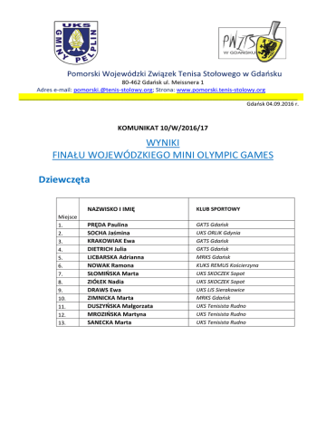Pomorski Wojewódzki Związek Tenisa Stołowego w Gdaosku 80-462 Gdaosk ul. Meissnera 1 Adres e-mail: [email protected]; Strona: www.pomorski.tenis-stolowy.org _____________________________________________________________________________________ Gdaosk 04.09.2016 r. KOMUNIKAT 10/W/2016/17 WYNIKI FINAŁU WOJEWÓDZKIEGO MINI OLYMPIC GAMES Dziewczęta Miejsce 1. 2. 3. 4. 5. 6. 7. 8. 9. 10. 11. 12. 13. NAZWISKO I IMIĘ KLUB SPORTOWY PRĘDA Paulina SOCHA Jaśmina KRAKOWIAK Ewa DIETRICH Julia LICBARSKA Adrianna NOWAK Ramona SŁOMIOSKA Marta ZIÓŁEK Nadia DRAWS Ewa ZIMNICKA Marta DUSZYOSKA Małgorzata MROZIOSKA Martyna SANECKA Marta GKTS Gdaosk UKS ORLIK Gdynia GKTS Gdaosk GKTS Gdaosk MRKS Gdaosk KUKS REMUS Kościerzyna UKS SKOCZEK Sopot UKS SKOCZEK Sopot UKS LIS Sierakowice MRKS Gdaosk UKS Tenisista Rudno UKS Tenisista Rudno UKS Tenisista Rudno Chłopcy Miejsce 1. 2. 3. 4. 5. 6. 7. 8. 9. 10. 11. 12. 13. 14. NAZWISKO I IMIĘ KLUB SPORTOWY MICHNA Dawid NIEWIADOMSKI Kamil SĘKOWSKI Jan MICHNA Samuel FORMELA Rafał TARAKAN Miłosz SĘKOWSKI Piotr SZORNAK Robert GÓRSKI Damian LEWANDOWSKI Oliwer RYBARSKI Mateusz LUCHOWSKI Hubert SZYNKOWSKI Brajan GDANIEC Damian UKS LIS Sierakowice UKS ORLIK Gdynia GKTS Gdaosk UKS LIS Sierakowice MRKS Gdaosk KS BENIAMINEK 03 Starogard Gdaoski GKTS Gdaosk ATS MAŁE TRÓJMIASTO Rumia UKS Tenisista Rudno UKS Tenisista Rudno UKS Tenisista Rudno UKS Tenisista Rudno UKS Tenisista Rudno UKS Tenisista Rudno Do finału ogólnopolskiego zakwalifikowali się zdobywcy czterech pierwszych miejsc. Sędzia Główny /Jan Juwa/ Uwagi dotyczące komunikatu można przesyłać do 20.10.2016 r na adres [email protected]