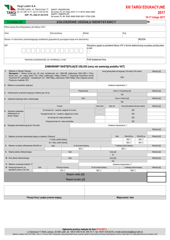 XIII TARGI EDUKACYJNE 2017 SWIFT: PKOPPLPW Nr konta: PL 03 1240 2470 1111 0010 3424 2280 SWIFT: WBKPPLPP Nr konta: PL 80 1090 2688 0000 0001 0728 2338 16-17 lutego 2017 Nr ZGŁOSZENIE UDZIAŁU NIEWYSTAWCY Formularz ZN Pełna nazwa firmy Niewystawcy (do faktury VAT) Ulica Kod pocztowy Miasto Kraj Nazwa i nr dokumentu potwierdzającego działalność gospodarczą (wymagana kopia w/w dokumentu) NIP: Nazwisko przedstawiciela, tel. kontaktowy, e-mail REGON: Wyrażamy zgodę na przesłanie faktury VAT w formie elektronicznej na podany poniżej adres e-mail ……………………………………………………………………………… Profil działalności firmy ZAMAWIAMY NASTĘPUJĄCE USŁUGI (ceny nie zawierają podatku VAT) 1. Reklama w Telewizji Targowej Wymagania: 1. Obrazy: format .jpg, .tiff, .bmp; rozdzielczość: min. 1366×768, preferowana 1920×1080. 2. Filmy: format .wmv, .avi, .mpeg; jakość– min. 720px, preferowana 1080px (FullHD). 3. Prezentacje PowerPoint: format: PowerPoint XP i późniejsze; - rozdzielczość: min. 1366×768px, preferowana 1920×1080px (10px margines boczny). Proporcje w materiale 16:9. Cena [zł/wszystkie dni targowe] 120 emisji x15s /dzień; Wartość [zł] 1000 2. Reklama w przewodniku targowym Ustalenia indywidualne Powierzchnia 3. Umieszczenie na terenach targowych reklamy typu roll-up Cena (1 m2 planszy) [zł] Wartość [zł] 150 Ilość 4. Ustawienie własnego balonu reklamowego Cena (1 balon)) [zł] Wartość [zł] 700 Format 5. Wyłożenie materiałów reklamowych na terenie Targów Ilość stron Ilość dni Cena [zł/materiał (stronę) /dzień] Do formatu A4, 1 podmiot, objętość do 2 stron 250 Powyżej formatu A4, 1 podmiot, objętość do 2 stron 350 Do formatu A4, wiele podmiotów 250 Powyżej formatu A4, wiele podmiotów Wartość [zł] 350 Ustalenia indywidualne 6. Wynajęcie sali konferencyjnej (do 100 osób) Wartość [zł] Ilość 7. Reklama na stronie internetowej imprezy w zakładce „Polecamy” 1-3 mies. przed imprezą 600x200 px 250x200 px 900 600 600 400 do 1 mies. przed imprezą 8. Reklama na tablicy billboardowej 504x238 cm Ilość 9. Klejenie plakatu billboardowego 14 dni przed imprezą 1 miesiąc przed imprezą 350 550 Ilość Cena [zł] Wartość [zł] Wartość [zł] Wartość [zł] 70 10. Druk plakatu billboardowego Ilość Cena [zł] Wartość [zł] 150 11. Reklama na elewacji budynku “C” 12. Ekspozycja banneru na ogrodzeniu terenu 2,5x1,8m Ustalenia indywidualne Ilość Podczas imprezy 14 dni przed imprezą 1 miesiąc przed imprezą 675 900 1500 Wartość [zł] Razem netto [zł] Razem brutto [zł] Pieczęć firmy i podpis prawnie wiążący Miejscowość i data Zgłoszenia prosimy nadsyłać do dnia 27.01.2017 r. ul. Dworcowa 11 (Park Ludowy), 20-406 Lublin, tel. +48 81 458-15-35, 458-15-11, fax +48 81 534-92-95, [email protected] Zgodnie z ustawą z dnia 18.07.2002 r. (Dz.U. nr 144 poz.1204) o świadczeniu usług drogą elektroniczną, wyrażam zgodę na otrzymywanie informacji marketingowych od firmy Targi Lublin S.A. drogą elektroniczną na ww adres e-mail