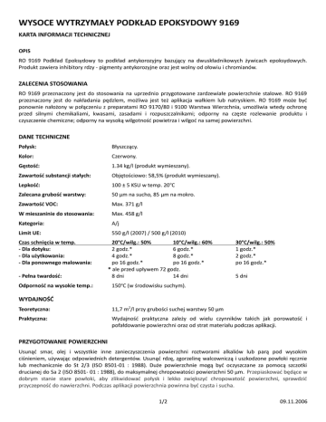 WYSOCE WYTRZYMAŁY PODKŁAD EPOKSYDOWY 9169 KARTA INFORMACJI TECHNICZNEJ OPIS RO 9169 Podkład Epoksydowy to podkład antykorozyjny bazujący na dwuskładnikowych żywicach epoksydowych. Produkt zawiera inhibitory rdzy - pigmenty antykorozyjne oraz jest wolny od ołowiu i chromianów. ZALECENIA STOSOWANIA RO 9169 przeznaczony jest do stosowania na uprzednio przygotowane zardzewiałe powierzchnie stalowe. RO 9169 przeznaczony jest do nakładania pędzlem, możliwa jest też aplikacja wałkiem lub natryskiem. RO 9169 może być ponownie nałożony w połączeniu z preparatami RO 9170/80 i 9100 Warstwa Wierzchnia, umożliwia wtedy ochronę przed silnymi chemikaliami, kwasami, zasadami i rozpuszczalnikami; odporny na częste rozlewanie produktu i czyszczenie chemiczne; odporny na wysoką wilgotność powietrza i wilgoć na samej powierzchni. DANE TECHNICZNE Połysk: Błyszczący. Kolor: Czerwony. Gęstość: 1.34 kg/l (produkt wymieszany). Zawartość substancji stałych: Objętościowo: 58,5% (produkt wymieszany). Lepkość: 100 ± 5 KSU w temp. 20oC Zalecana grubość warstwy: 50 μm na sucho, 85 μm na mokro. Zawartość VOC: Max. 371 g/l W mieszaninie do stosowania: Max. 458 g/l Kategoria: A/j Limit UE: 550 g/l (2007) / 500 g/l (2010) Czas schnięcia w temp. - Dla dotyku: - Dla użytkowania: - Dla ponownego malowania: - Pełna twardość: Odporność na wysokie temp.: 20°C/wilg.: 50% 10°C/wilg.: 60% 2 godz.* 6 godz.* 4 godz.* 8 godz.* po 16 godz.* po 16 godz.* * ale przed upływem 72 godz. 8 dni 14 dni 30°C/wilg.: 50% 1 godz.* 2 godz.* po 16 godz.* 5 dni 150oC (w środowisku suchym). WYDAJNOŚĆ Teoretyczna: 11,7 m2/l przy grubości suchej warstwy 50 μm Praktyczna: Wydajność praktyczna zależy od wielu czynników takich jak porowatość i pofałdowanie powierzchni oraz od strat materiału podczas aplikacji. PRZYGOTOWANIE POWIERZCHNI Usunąć smar, olej i wszystkie inne zanieczyszczenia powierzchni roztworami alkaliów lub parą pod wysokim ciśnieniem, używając odpowiednich detergentów. Usunąć rdzę, zgorzelinę walcowniczą i uszkodzone powłoki ręcznie lub mechanicznie do St 2/3 (ISO 8501-01 : 1988). Duże powierzchnie mogą być oczyszczane za pomocą szczotki drucianej do Sa 2 (ISO 8501- 01 : 1988), do maksymalnej chropowatości powierzchni 50 μm. Przepiaskować będące w dobrym stanie stare powłoki, aby zlikwidować połysk i lekko zwiększyć chropowatość powierzchni, sprawdzić przyczepność do nawierzchni. Podczas aplikacji powierzchnia powinna być czysta i sucha. 1/2 09.11.2006 SPOSÓB PRZYGOTOWANIA Dokładnie wymieszać obydwa komponenty przed zmieszaniem ich ze sobą. Dodać aktywator do bazy i dokładnie wymieszać wolnoobrotowym mieszadłem lub metodą wytrząsania. Proporcje mieszania: Czas utwardzania: Czas stosowania: Baza : Aktywator (9102) = 1 : 1 objętościowo 1 godzina dla 5 litrów mieszaniny w 20oC 4 godziny dla 5 litrów mieszaniny w 20oC WARUNKI APLIKACJI Pędzel: Rozcieńczyć do 10% obj. przy użyciu rozcieńczalnika do fabr epoksydowych 160 lub ksylenem; stosować pędzle długiego naturalnego włosia. Wałek: Rozcieńczyć do 10% obj. przy użyciu rozcieńczalnika do fabr epoksydowych 160 lub ksylenem; wałki z krótkim / średnim włosiem poliamidowym (perlon 8 ÷ 12 mm ) Natrysk powietrzny: Rozcieńczyć do 20% obj. przy użyciu rozcieńczalnika do fabr epoksydowych 160 lub ksylenem; średnica dyszy: 1,2 ÷ 2,2 mm, ciśnienie rozpylania: 2 ÷ 4 atm.; unikać zbyt słabego rozcieńczenia preparatu. Natrysk bezpowietrzny: Rozcieńczyć do 10% obj. przy użyciu rozcieńczalnika do fabr epoksydowych 160 lub ksylenem; średnica dyszy: 0,013 ÷ 0,018 cala, ciśnienie rozpylania 125 ÷ 200 atm.; unikać zbyt słabego rozcieńczenia preparatu. Czyszczenie: Stosować rozcieńczalnik do wyrobów epoksydowych lub ksylen. WARUNKI STOSOWANIA Temperatura powietrza, podłoża i materiału do malowania w granicach 5 ÷ 35°C , wilgotność względna powietrza : poniżej 85%. Temperatura podłoża musi być przynajmniej o 3°C wyższa od punktu rosy. UWAGI Maksymalna grubość warstwy na powłokę: 100 µm warstwy suchej, co odpowiada 175 µm warstwy mokrej. WARUNKI BEZPIECZEŃSTWA Zapoznać się z informacjami na puszce i ulotce. WARUNKI PRZECHOWYWANIA Zamknięte puszki można przechowywać przez 5 lat od daty produkcji w suchych, dobrze wietrzonych pomieszczeniach, nie narażonych na promienie słoneczne w temperaturze +5oC ÷ +35oC. Informacje tu zawarte przekazywane są w dobrej wierze. Ponieważ warunki aplikacji są poza nasza kontrolą, firma RUST-OLEUM Netherlands B.V. nie może ponosić jakiejkolwiek odpowiedzialności lub obciążeń finansowych, które mogą wynikać z niewłaściwego zastosowania tych produktów. Firma zastrzega sobie prawo modyfikowania danych bez uprzedzenia. RUST-OLEUM NETHERLANDS B.V. BAAK 1, 4704 RJ P.O. BOX 138, 4700 AC ROOSENDAAL (THE NETHERLANDS) TEL.+31(0)165593636 FAX. +31(0)165593600 Dystrybutor: Noxan Sp. z o.o. ul. Pułtuska 13 61-052 Poznań Tel. +48 61 679 32 00 Fax +48 61 624 32 98 www.noxan.pl 2/2 09.11.2006