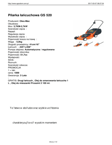 http://www.agrodom.com.pl 2017-03-07 08:27:24 Pilarka łańcuchowa GS 520 Producent: Oleo-Mac Obudowa: Moc: 3,7KM-2,7kW Szerokość cięcia : Napęd: Regulacja cięcia: Wysokość cięcia : Pojemność kosza na trawę : Waga : 5,0kg Długość prowadnicy: 41cm/16" Łańcuch : .325"x.058" Pompa olejowa: Automatyczna / regulowana Pojemność zbiornika: Pojemność: 51,7cc Wydajność: Silnik: Rozruch: Szerokość robocza: PROMOCJA 1 = tak: cena: 1899 Gwarancja: 3 Lata : GRATIS: Drugi łańcuch , Olej do smarowania łańcucha 1 L , Olej do mieszanki Prossint 2 100 ml. Te ?atwe w obs?udze oraz szybkie urz?dzenia charakteryzuj?ce si? wysokim momentem Strona 1/10 http://www.agrodom.com.pl 2017-03-07 08:27:24 obrotowym równie? przy niskich obrotach s? idealne do najró?niejszych zastosowa? w rolnictwie, np. do okrzesywania, przygotowania drewna na opa?, ?cinania oraz przerzynki ?rednich i wi?kszych drzew. Strona 2/10 http://www.agrodom.com.pl 2017-03-07 08:27:24 Model GS520 posiada ga?nik z kompensatorem, który utrzymuje sta?y stosunek powietrza i mieszanki. Dzi?ki temu moc generowana przez silnik utrzymuje si? na sta?ym wysokim poziomie, a sprawno?? urz?dzenia nie zmienia si? maksymalnie u?atwiaj?c prac? operatora. Dekompresor, pompka rozruchowa oraz Strona 3/10 http://www.agrodom.com.pl 2017-03-07 08:27:24 pó?automatyczne ssanie umo?liwiaj? ?atwy rozruch w ka?dej sytuacji, a jednocz??ciowy uchwyt odizolowany od silnika gwarantuj? ?atwe manewrowanie urz?dzeniem. Pokryw? filtra mo?na otworzy? bez ?adnych specjalnych narz?dzi, a nylonowy filtr jest samoczyszcz?cy; boczny napinacz ?a?cucha maksymalnie u?atwia czynno?ci konserwacyjne. Strona 4/10 http://www.agrodom.com.pl 2017-03-07 08:27:24 Automatyczna, regulowana pompa olejowa z korpusem z aluminium: zapewnia maksymaln? wytrzyma?o??, nie podaje oleju na biegu ja?owym ograniczaj?c zanieczyszczenie ?rodowiska. Strona 5/10 http://www.agrodom.com.pl 2017-03-07 08:27:24 Specyfikacja: Model: GS 520 Strona 6/10 http://www.agrodom.com.pl 2017-03-07 08:27:24 Moc silnika: 3,7 KM – 2,7 kW Moc użyteczna urządzenia: 3,4 KM – 2,5 kW 3 Pojemność silnika: 51,7 cm Strona 7/10 http://www.agrodom.com.pl 2017-03-07 08:27:24 Długość prowadnicy: 41 cm/16' Łańcuch (podziałka x szerokość): .325” x .058” Strona 8/10 http://www.agrodom.com.pl 2017-03-07 08:27:24 Pompa olejowa: automatyczna / regulowana Pojemność zbiornika oleju: 0,27 L Pojemność zbiornika Strona 9/10 http://www.agrodom.com.pl 2017-03-07 08:27:24 paliwa: 0,5 L Ciężar: 5,0 Kg Strona 10/10
