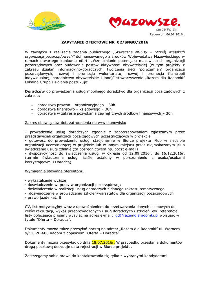 Radom dn. 04.07.2016r. ZAPYTANIE OFERTOWE NR 02/SNGO/2016 W zawiązku z realizacją zadania publicznego „Skuteczne NGOsy – rozwój wiejskich organizacji pozarządowych” dofinansowanego z środków Województwa Mazowieckiego w ramach otwartego konkursu ofert: „Wzmacnianie potencjału mazowieckich organizacji pozarządowych oraz budowanie postaw aktywności obywatelskiej (w tym projekty z zakresu działań informacyjno-doradczych, tworzenia sieci (porozumień) organizacji pozarządowych, rozwój i promocja wolontariatu, rozwój i promocja filantropii indywidualnej, poradnictwo obywatelskie i inne)” stowarzyszenie „Razem dla Radomki” Lokalna Grupa Działania poszukuje: Doradców do prowadzenia usług mobilnego doradztwo dla organizacji pozarządowych z zakresu: doradztwa prawno – organizacyjnego – 30h doradztwa finansowo – księgowego – 30h doradztwa w zakresie pozyskania zewnętrznych środków finansowych – 30h Zakres obowiązków dot. zatrudnienia na w/w stanowisku - prowadzenie usług doradczych zgodnie z zapotrzebowaniem zgłaszanym przez przedstawicieli organizacji pozarządowych uczestniczących w projekcie - gotowość do prowadzeniu usługi stacjonarnie w Biurze projektu i/lub w siedzibie organizacji uczestniczącej w projekcie lub w innym miejscu przez nią wskazanym i/lub świadczenie usługi zdalnie (za pośrednictwem np. poczt e-mail) - dyspozycyjność do świadczenia usługi w okresie od 12.09.2016r. do 16.12.2016r. (termin świadczenia usługi ściśle ustalony w porozumieniu z osobą/osobami korzystającymi i Doradcą) Wymagania stawiane oferentom: - wykształcenie wyższe; doświadczenie w pracy w organizacji pozarządowej; doświadczenie w realizacji usług doradczych z danego zakresu tematycznego doświadczenie w prowadzeniu szkoleń/warsztatów dla organizacji pozarządowych prawo jazdy kat. B CV, list motywacyjny wraz z upoważnieniem do przetwarzania danych osobowych do celów rekrutacji, wykaz przeprowadzonych usług doradczych i szkoleń, ew. referencje, listy polecające prosimy wysyłać na adres e-mail: [email protected] wpisując w tytule "Oferta – Doradca”. Dokumenty można także przesyłań pocztą na adres: „Razem dla Radomki” ul. Wernera 9/11, 26-600 Radom z dopiskiem "Oferta – Doradca”. Dokumenty można przesyłać do dnia 18.07.2016r. W przypadku przesłania dokumentów drogą pocztową decyduje data rejestracji w Biurze projektu. Zastrzegamy sobie prawo do kontaktowania się tylko z wybranymi kandydatami.