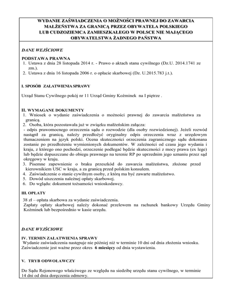 WYDANIE ZAŚWIADCZENIA O MOŻNOŚCI PRAWNEJ DO ZAWARCIA MAŁŻEŃSTWA ZA GRANICĄ PRZEZ OBYWATELA POLSKIEGO LUB CUDZOZIEMCA ZAMIESZKAŁEGO W POLSCE NIE MAJĄCEGO OBYWATELSTWA ŻADNEGO PAŃSTWA DANE WEJŚCIOWE PODSTAWA PRAWNA 1. Ustawa z dnia 28 listopada 2014 r. - Prawo o aktach stanu cywilnego (Dz.U. 2014.1741 ze zm.). 2. Ustawa z dnia 16 listopada 2006 r. o opłacie skarbowej (Dz. U.2015.783 j.t.). I. SPOSÓB ZAŁATWIENIA SPRAWY Urząd Stanu Cywilnego pokój nr 11 Urząd Gminy Koźminek na I piętrze . II. WYMAGANE DOKUMENTY 1. Wniosek o wydanie zaświadczenia o możności prawnej do zawarcia małżeństwa za granicą. 2. Osoba, która pozostawała już w związku małżeńskim załącza: - odpis prawomocnego orzeczenia sądu o rozwodzie (dla osoby rozwiedzionej). Jeżeli rozwód nastąpił za granicą, należy przedłożyć oryginalny odpis orzeczenia wraz z urzędowym tłumaczeniem na język polski. Ocena skuteczności orzeczenia zagranicznego sądu dokonana zostanie po przedłożeniu wymienionych dokumentów. W zależności od czasu jego wydania i kraju, z którego ono pochodzi, orzeczenie podlegać będzie skuteczności z mocy prawa (ex lege) lub będzie dopuszczane do obiegu prawnego na terenie RP po uprzednim jego uznaniu przez sąd okręgowy w kraju. 3. Pisemne zapewnienie o braku przeszkód do zawarcia małżeństwa, złożone przed kierownikiem USC w kraju, a za granicą przed polskim konsulem. 4. Zaświadczenie o stanie cywilnym osoby, z którą ma być zawarte małżeństwo. 5. Dowód uiszczenia należnej opłaty skarbowej. 6. Do wglądu: dokument tożsamości wnioskodawcy. III. OPŁATY 38 zł – opłata skarbowa za wydanie zaświadczenia. Zapłaty opłaty skarbowej należy dokonać przelewem na rachunek bankowy Urzędu Gminy Koźminek lub bezpośrednio w kasie urzędu. DANE WYJŚCIOWE IV. TERMIN ZAŁATWIENIA SPRAWY Wydanie zaświadczenia następuje nie później niż w terminie 10 dni od dnia złożenia wniosku. Zaświadczenie jest ważne przez okres 6 miesięcy od dnia wystawienia. V. TRYB ODWOŁAWCZY Do Sądu Rejonowego właściwego ze względu na siedzibę urzędu stanu cywilnego, w terminie 14 dni od dnia doręczenia odmowy. VI. INFORMACJE DODATKOWE 1. Zaświadczenie wydaje kierownik urzędu stanu cywilnego miejsca zamieszkania osoby, której zaświadczenie dotyczy, konsul Rzeczypospolitej Polskiej 2. Ważność zaświadczenia opatrzona jest terminem 6 miesięcy. Po upływie tego terminu zaświadczenie traci moc. VII. OSOBA ZAŁATWIAJĄCA SPRAWĘ ( ODPOWIEDZIALNY ZA PROCES) Z-ca Kierownika Urzędu Stanu Cywilnego Paulina Dzikowska pokój nr 11 tel. 62 7638607.